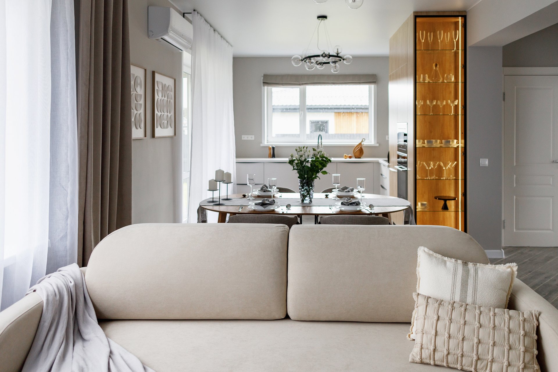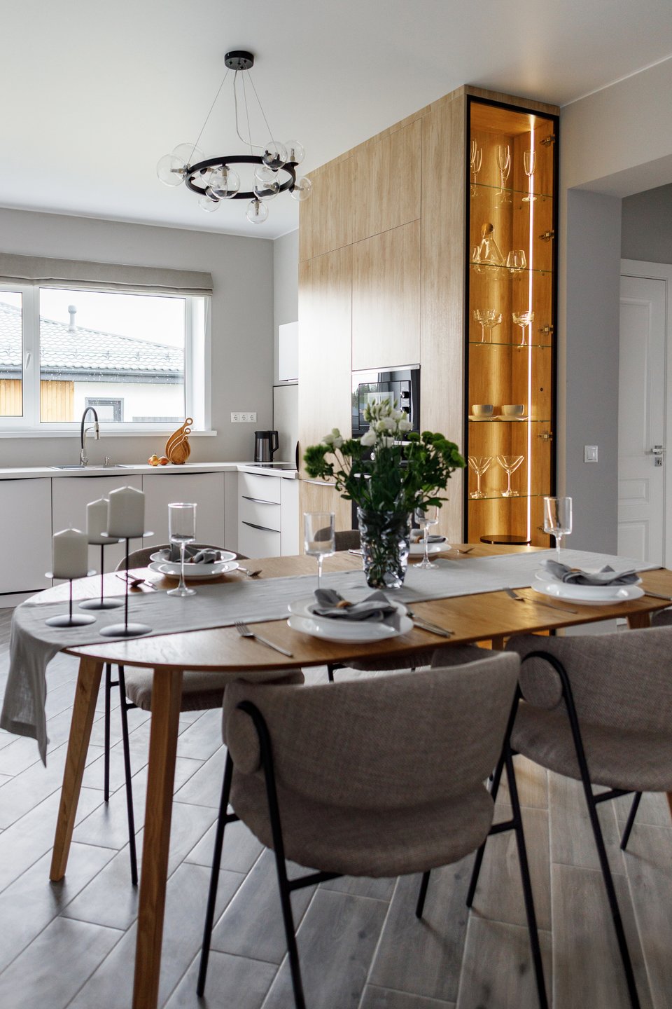 Сердце дома — просторная кухня-гостиная. В комнате установили красивую витрину с подсветкой, обеденную зону, зону отдыха с мягким диваном — все для того, чтобы из дома не хотелось уезжать. Гарнитур изготовили на заказ. Вся техника встроенная, включая холодильник.