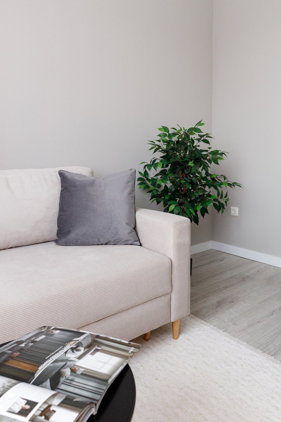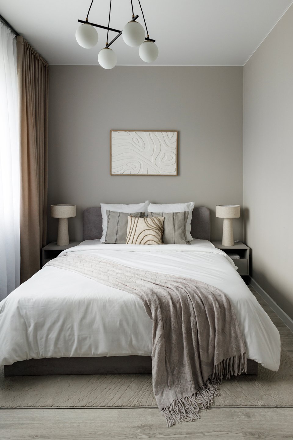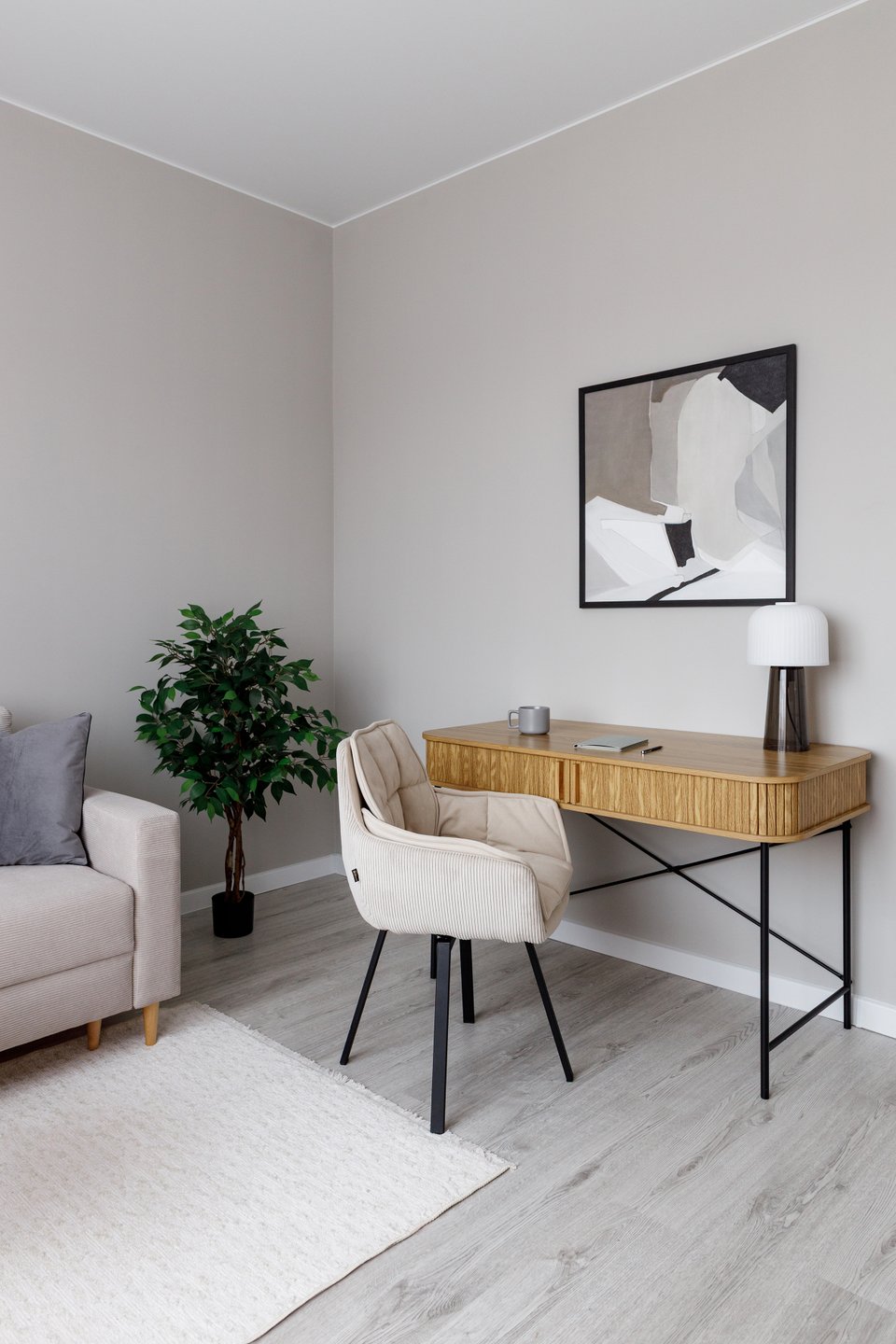 - Интерьер в серо-бежевых тонах, без акцента на цвет, с деревянными деталями.