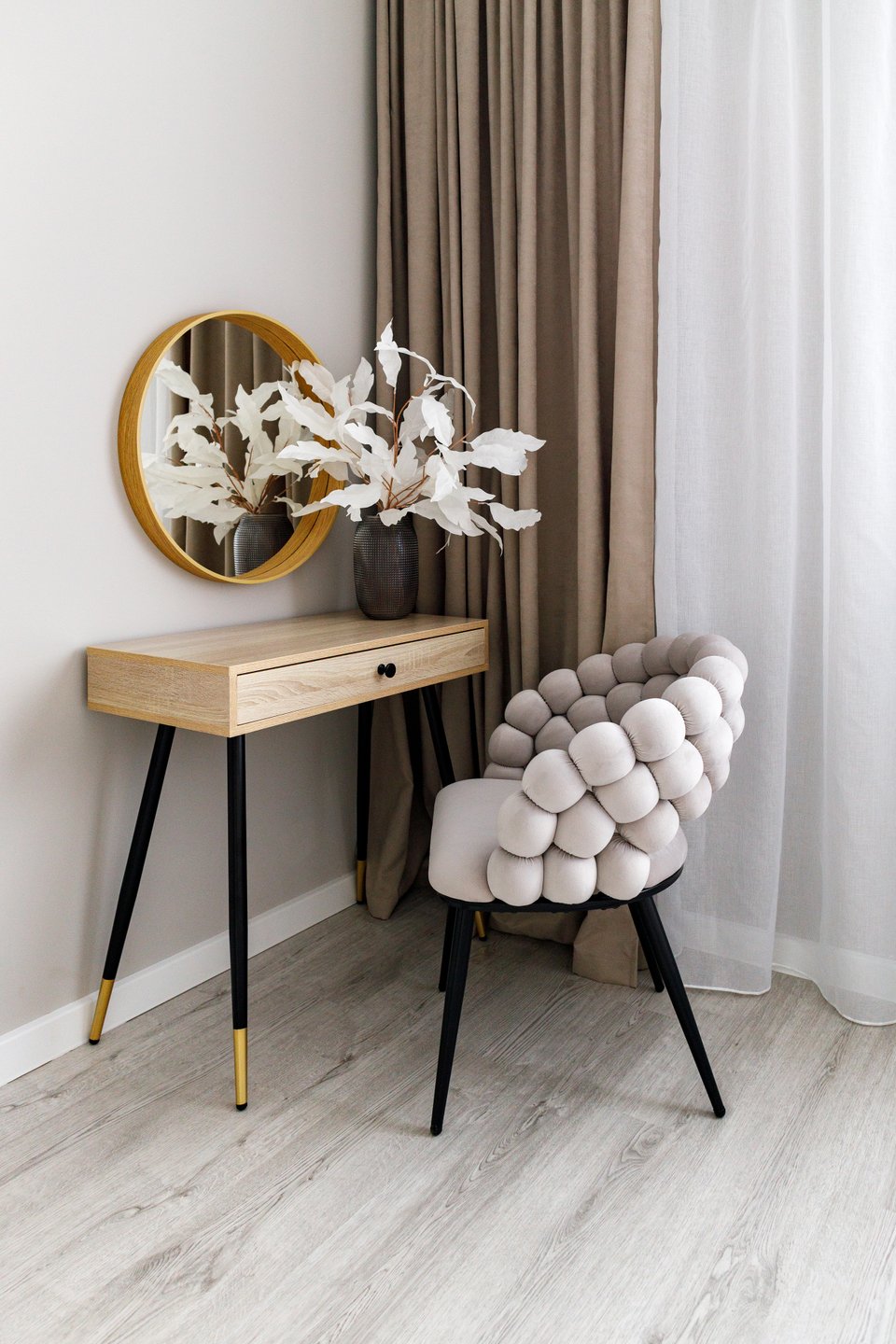 «Именно со спальни я всегда приступаю к разработке концепции интерьера, — делится автор проекта. — Главный предмет в композиции этой спальни — кровать Вилена от divan.ru. Зона сна выделена мягким ковром Гео. Настольные лампы Леррет с тканевыми абажурами и теплым светом делают комнату располагающей к отдыху. Туалетный столик дополнили необычным креслом, которое цепляет взгляд».