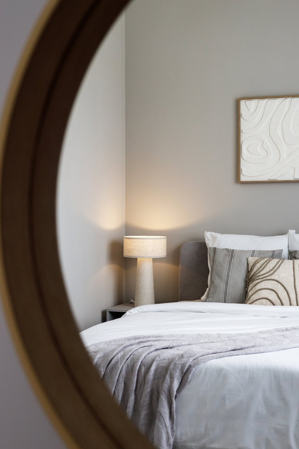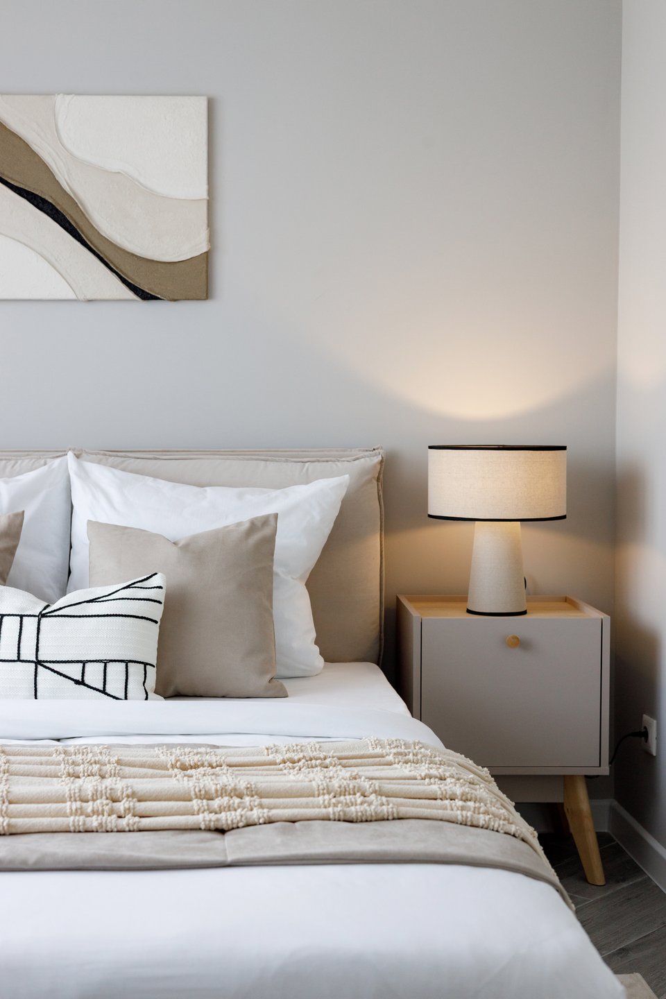В гостевой спальне большую часть комнаты занимает кровать с подъемным механизмом. Мягкие линии на ковре «переходят» на кровать и «продолжаются» в картине, которая связывает весь интерьер по цветам. С обеих сторон от кровати поставили прикроватные тумбы Торвалль. Для вечернего чтения есть настольные лампы.