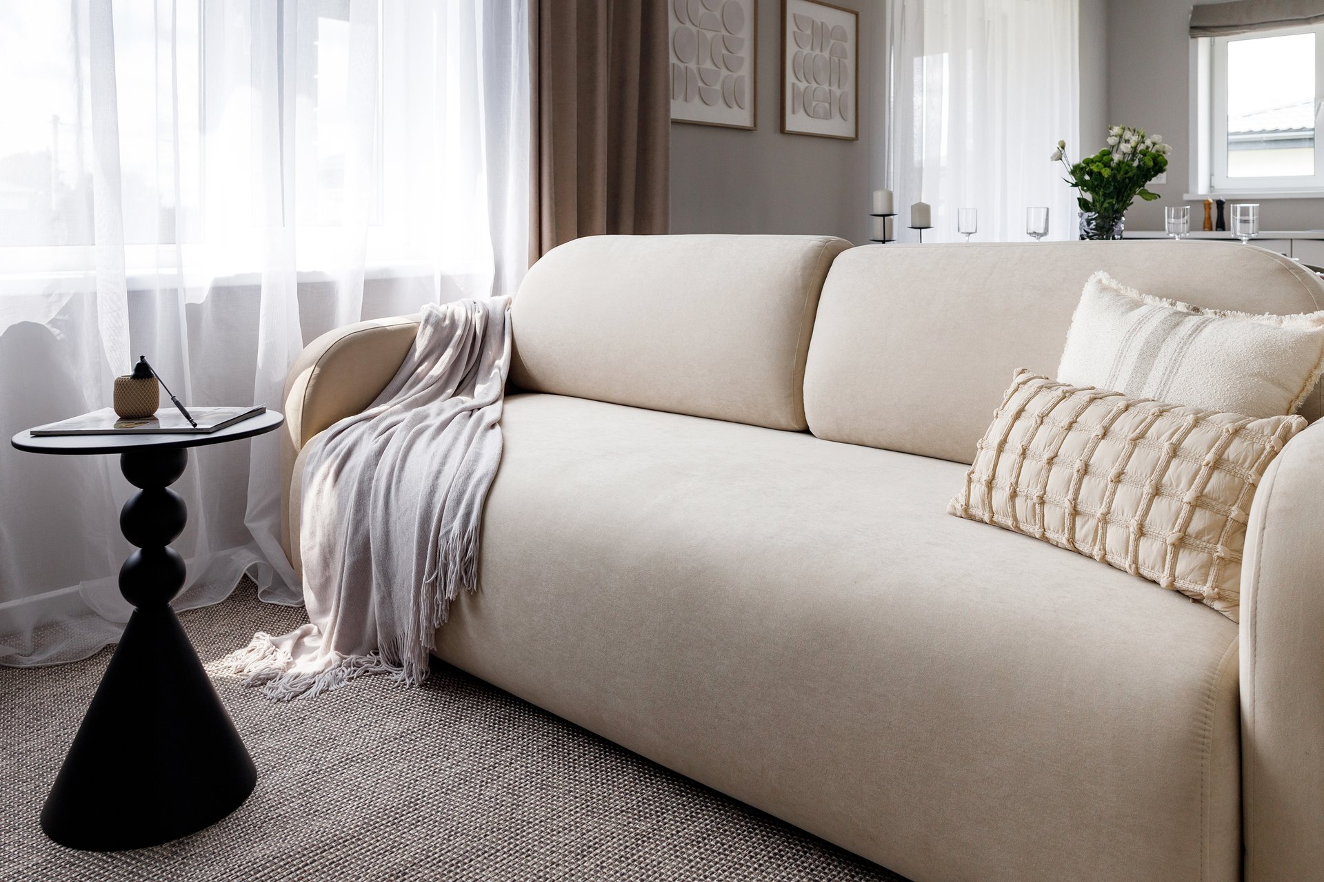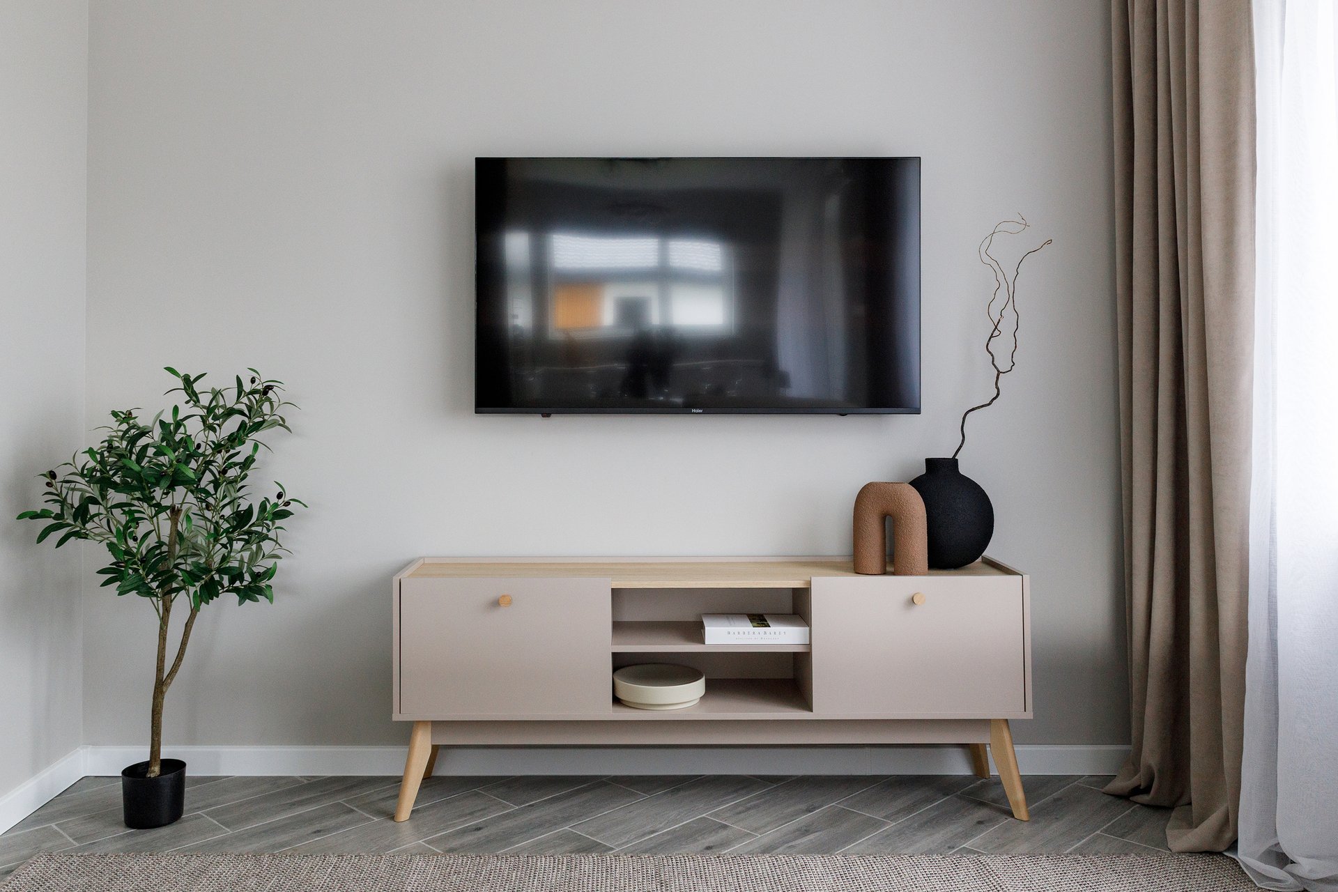 Диван Клаймар для зоны отдыха заказали в divan.ru. Он достаточно большой, чтобы с комфортом разместиться у ТВ, но за счет своих округлых форм и нейтральной бежевой обивки не выглядит громоздким. Напротив стоит ТВ-тумба Торвалль на тонких деревянных ножках.
