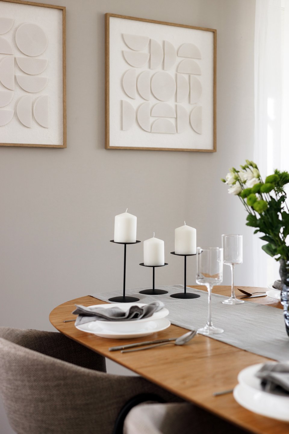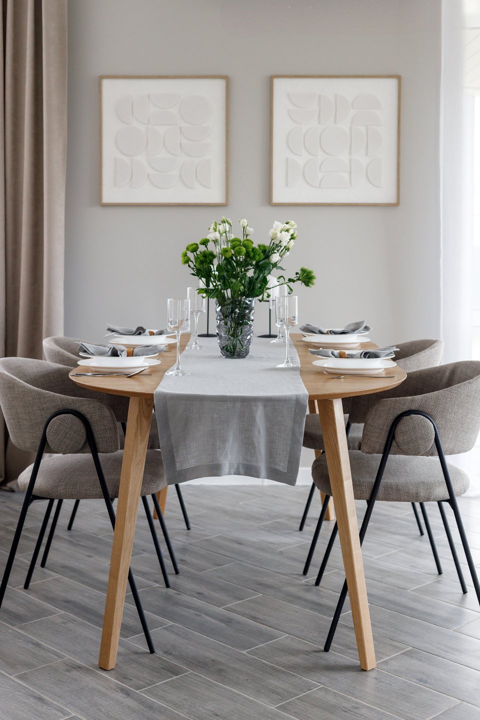 Между кухней и гостиной расположили обеденную группу со столом из натурального дерева. Стол раскладной, может быть компактным и круглым (диаметром 100 см) и достаточно большим, для приема гостей (180 х 100 см). Стену в обеденной зоне украсили двумя интерьерными картинами: Рельеф-1 и Рельеф-2 от divan.ru.