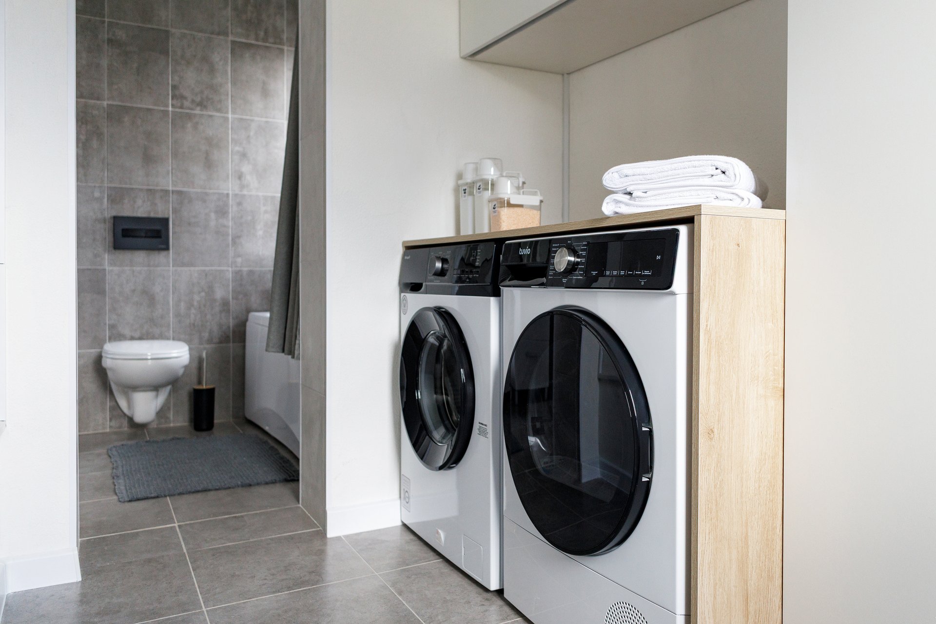 Мебель для постирочной изготовили на заказ, с целью удешевления использовали ЛДСП «Увадрев» в белом цвете. Под столешницей установили стиральную и сушильную машины. На столешнице можно разместить эстетичные контейнеры для хранения моющих средств. Над столешницей повесили шкафы для бытовой химии, рядом — большой шкаф, где будет храниться инвентарь для уборки.