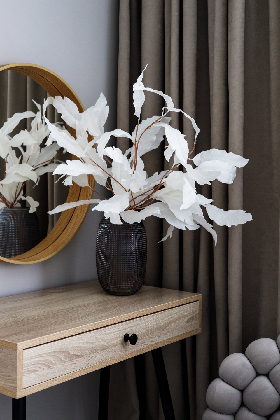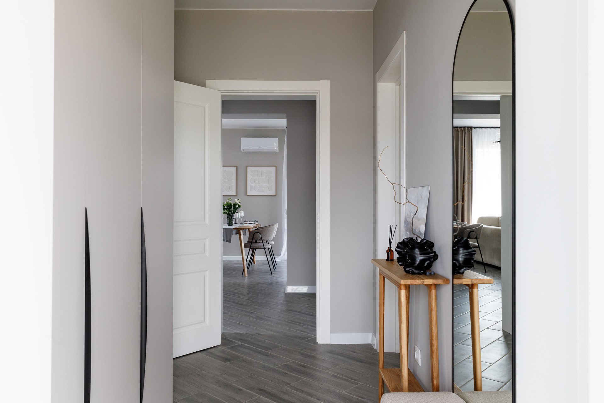 В прихожей есть все для комфорта арендаторов: шкаф, большое ростовое зеркало, пуф, консоль из массива ясеня для мелочей и ключей.