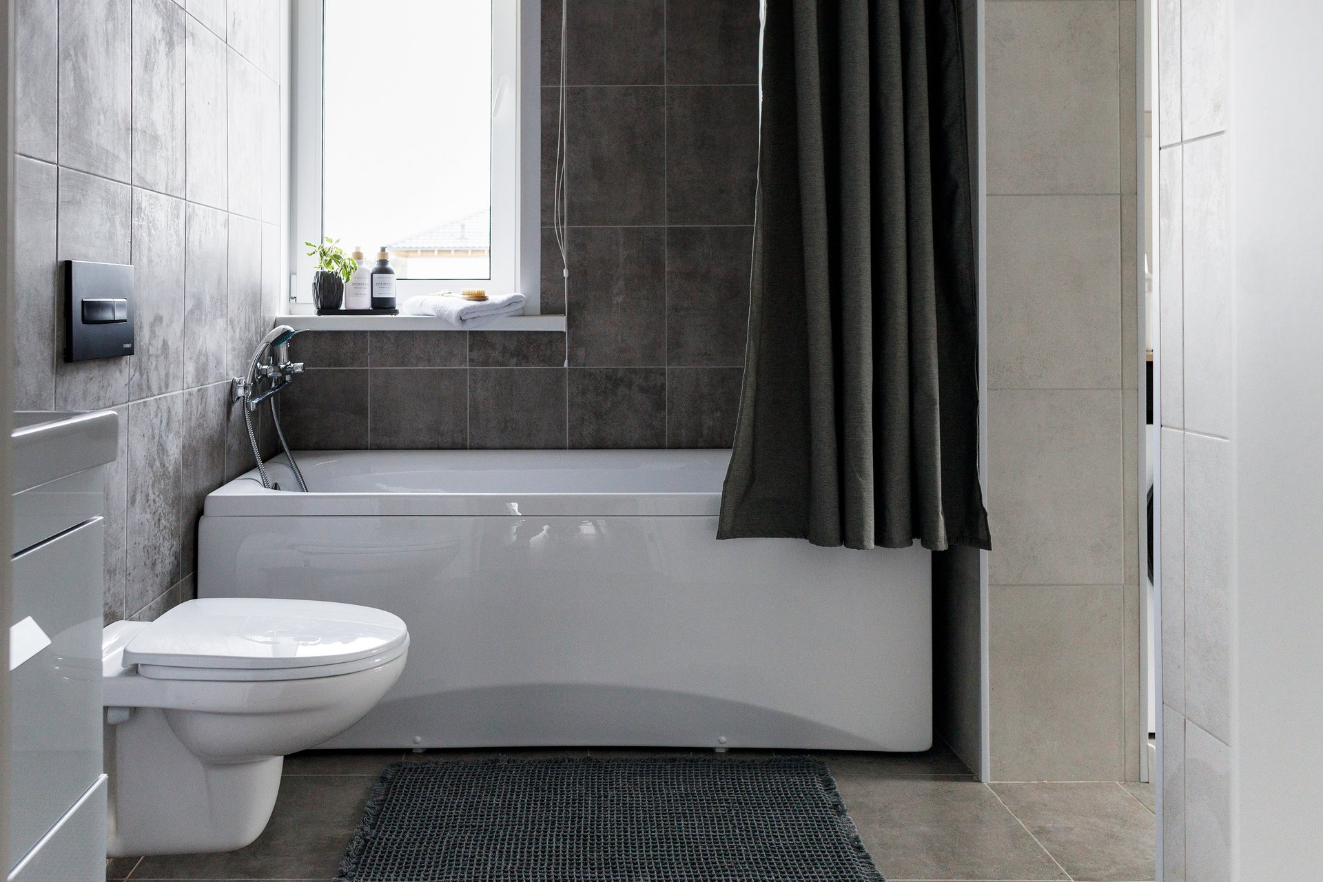 Пространство дополнили зеркалом в черной раме, аксессуарами, тканевой шторой для ванны. Для хранения есть тумба под раковиной.