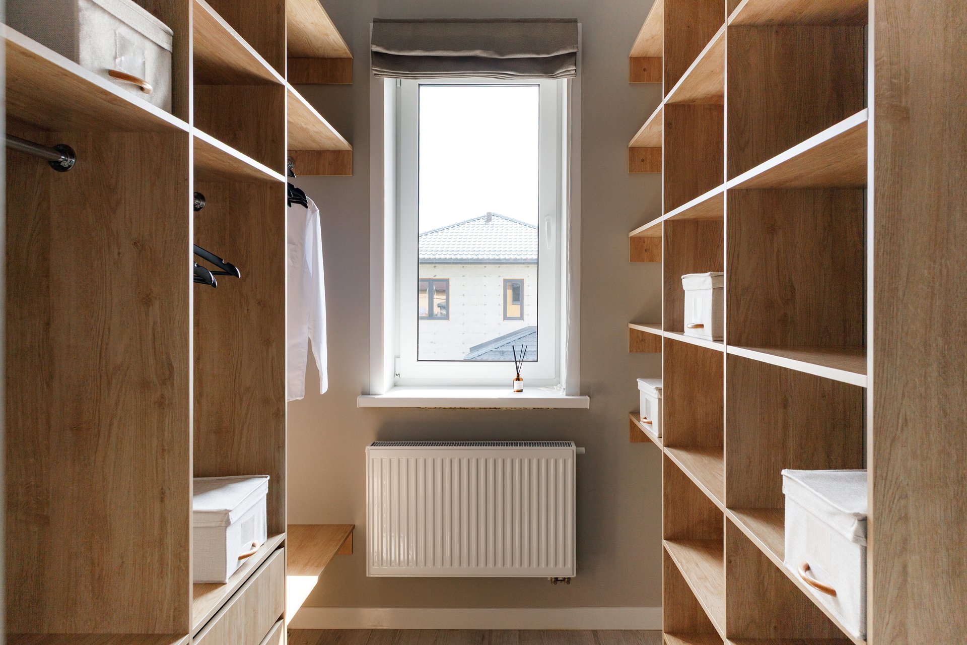 Гардеробная система получилась вместительной — удалось разместить зоны хранения по обе стороны. Есть штанги для длинных и коротких вещей, выдвижные ящики, полки для одежды, сверху свободное пространство для чемоданов и других габаритных вещей.