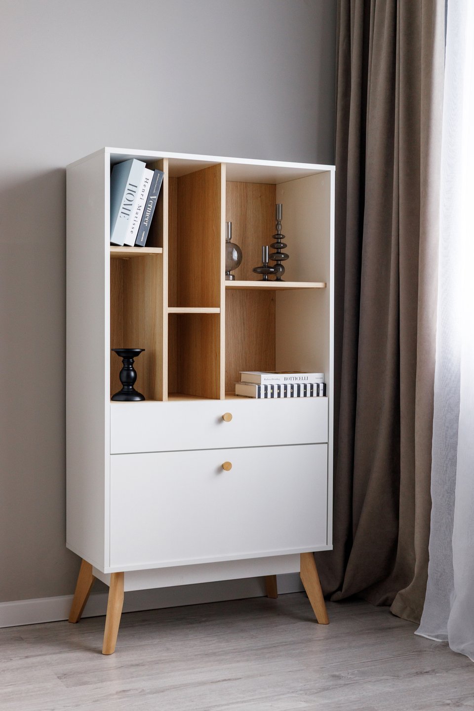 Линии в тканях и на фасадах мебели — часть концепта комнаты. Обивка дивана из вельвета, консоль Рико с реечным фасадом и необычным открыванием (как занавес), настольная лампа Гейза поддерживают общую концепцию. Для хранения предусмотрели стеллаж Торвалль от divan.ru.