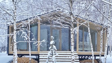 Каркасный дом стоит на сваях. Здесь всего две комнаты — кухня-гостиная и спальня, а также ванная с большим окном. Саму ванну разместили как раз у окна, что стало особенностью домика: можно наблюдать за природой, лежа в теплой воде. Из гостиной есть выход на террасу с потрясающим видом на лес.