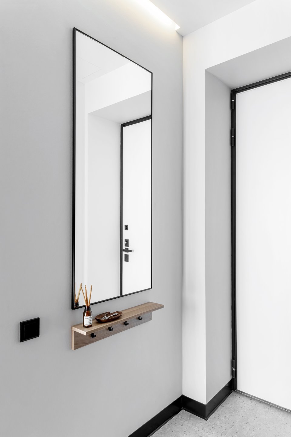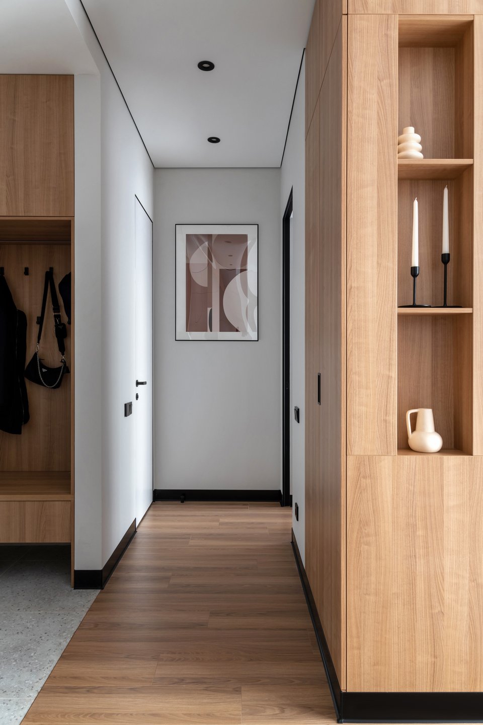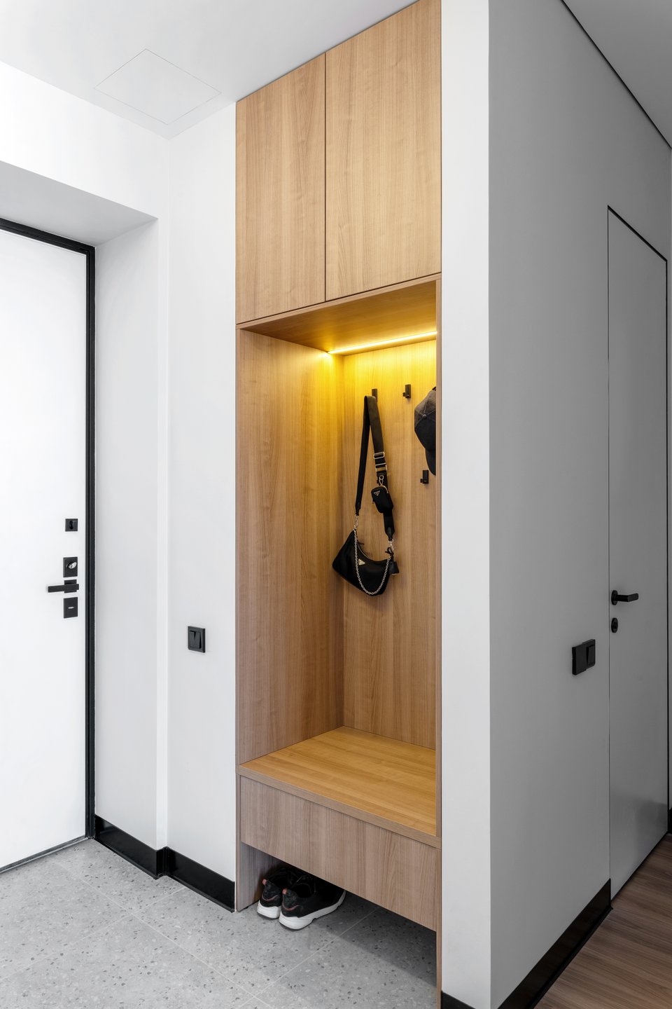 Входную зону отделили от гостиной, установив поперек распашной шкаф. Видимый торец шкафа оформили как нишу с полками. В нишу на входе в квартиру встроили шкаф с открытой вешалкой и сиденьем, которое тоже используется как место для хранения. Конструкцию сопроводили подсветкой, внизу оставили место для обуви. Напротив повесили зеркало.