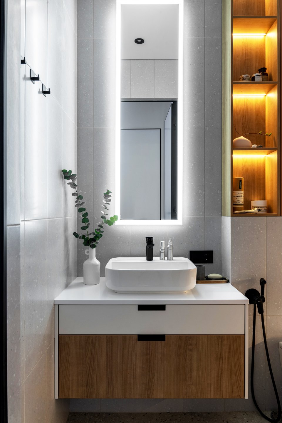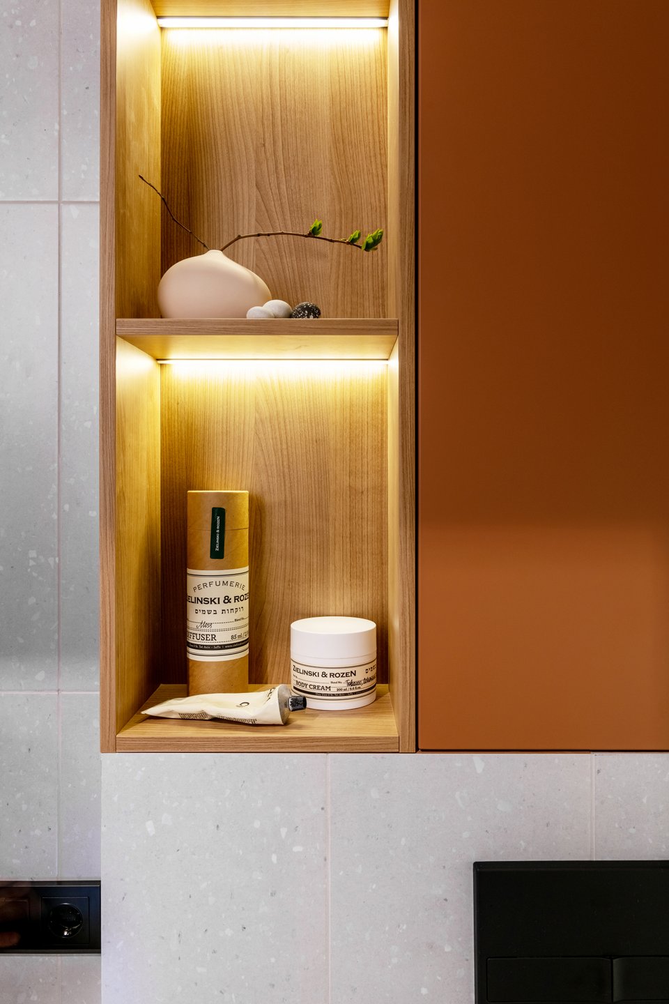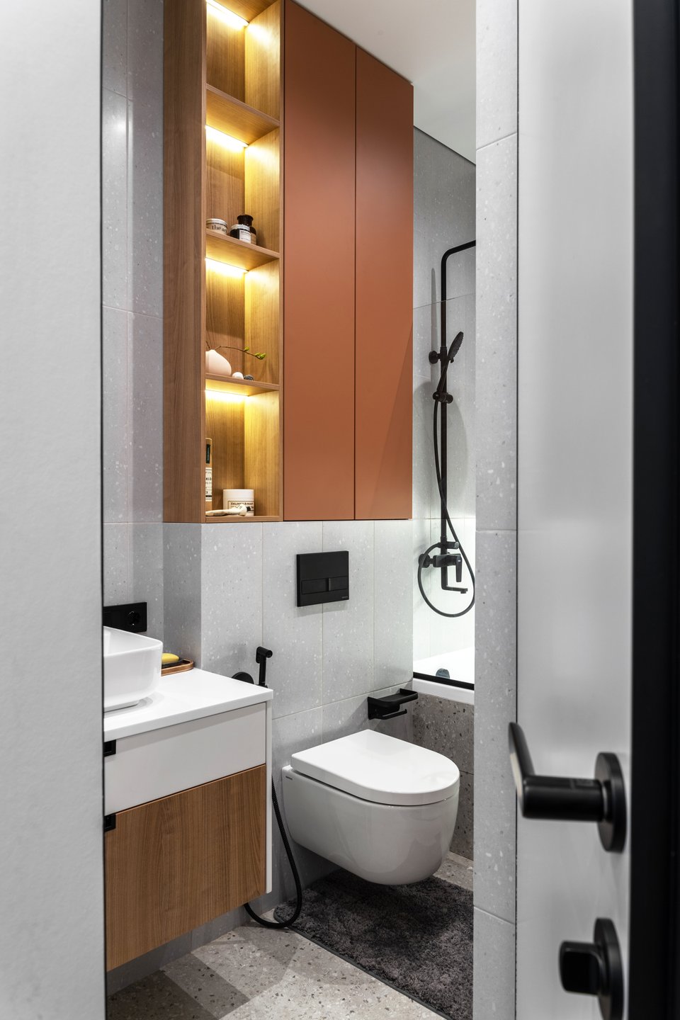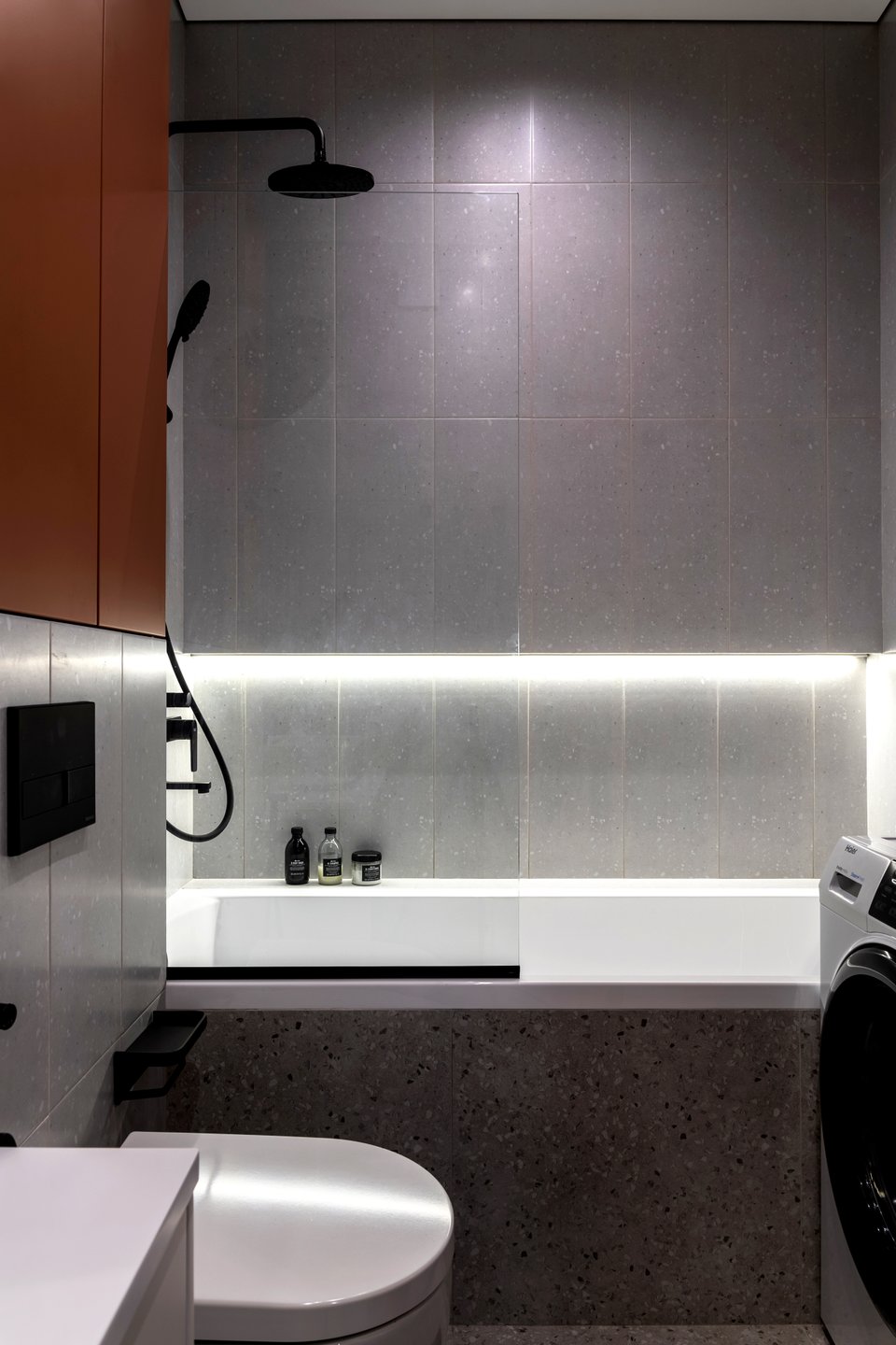 «Помимо ванны стандартного размера, умывальника и унитаза с инсталляцией, в санузле мы выстроили фальшстену из влагостойкого ГКЛ. В получившейся нише разместили пенал для гладильной доски. Дополнительными местами для хранения выступают тумба под раковиной и открытые полки с подсветкой. Здесь также нашли место для стирально-сушильной машины», — рассказывает автор проекта.