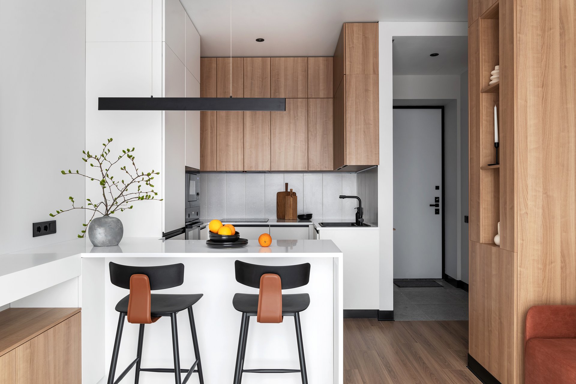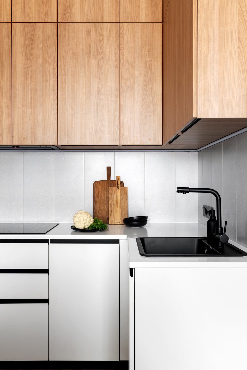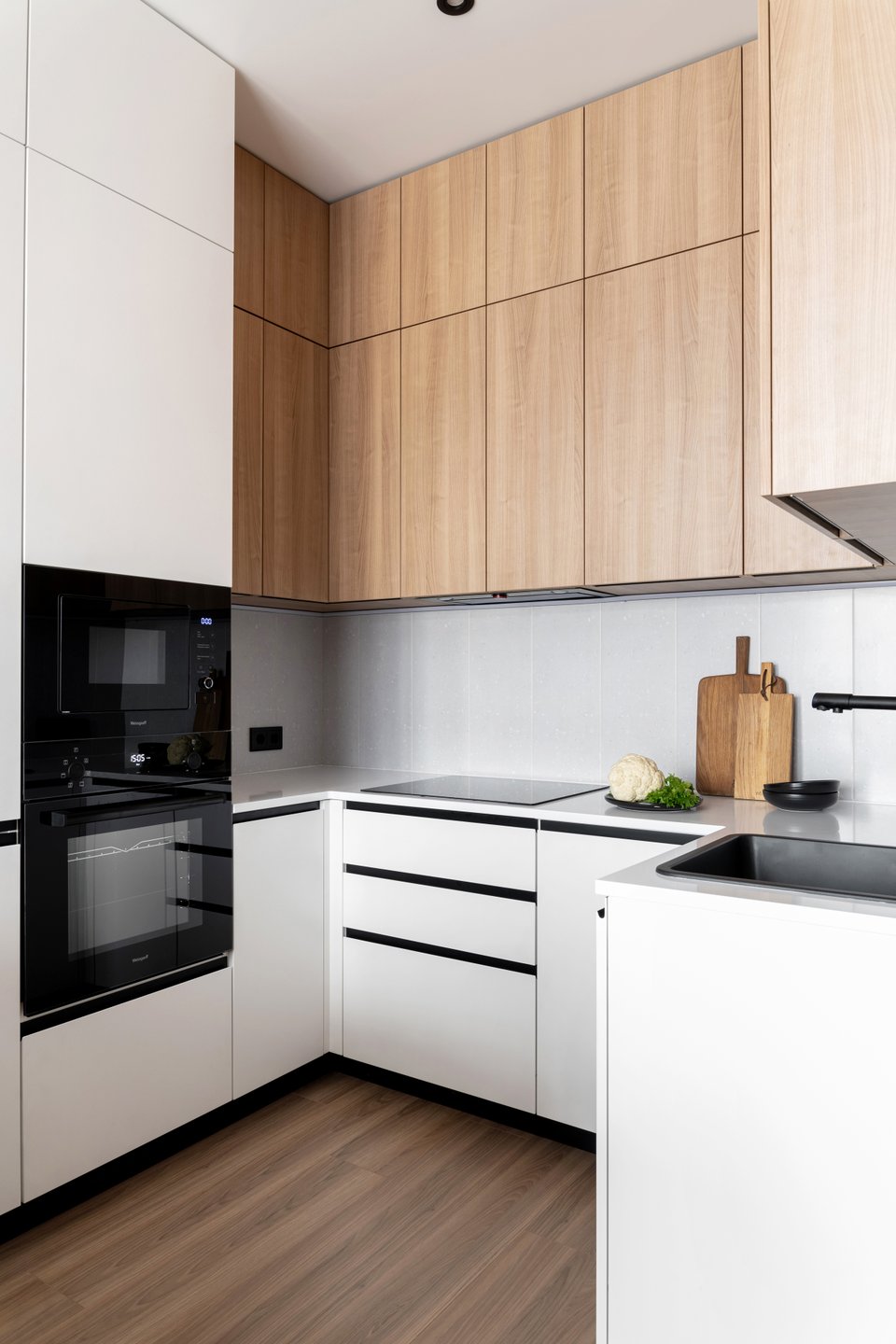 Гарнитур был выполнен по индивидуальному заказу: каждое место для хранения здесь продумано во избежание визуального шума на белой столешнице из искусственного камня. Фартук выложили из плитки. «Верхние шкафы с фасадами под дерево реализовали "в потолок", как и другую мебель в квартире. Такой прием визуально вытягивает стены и увеличивает высоту потолка, — комментирует дизайнер. — Нижние шкафы в белом цвете с контрастными черными ручками добавляют графичности и геометрии пространству».