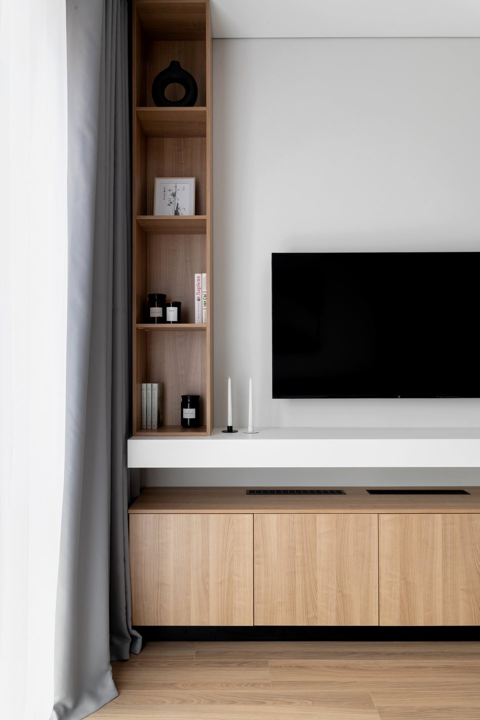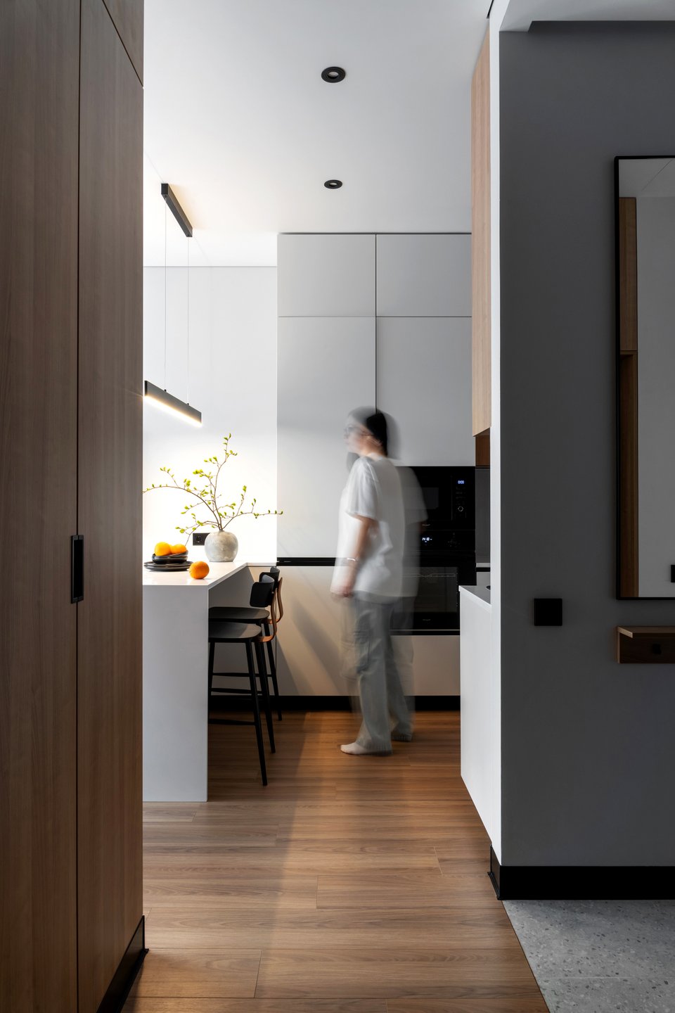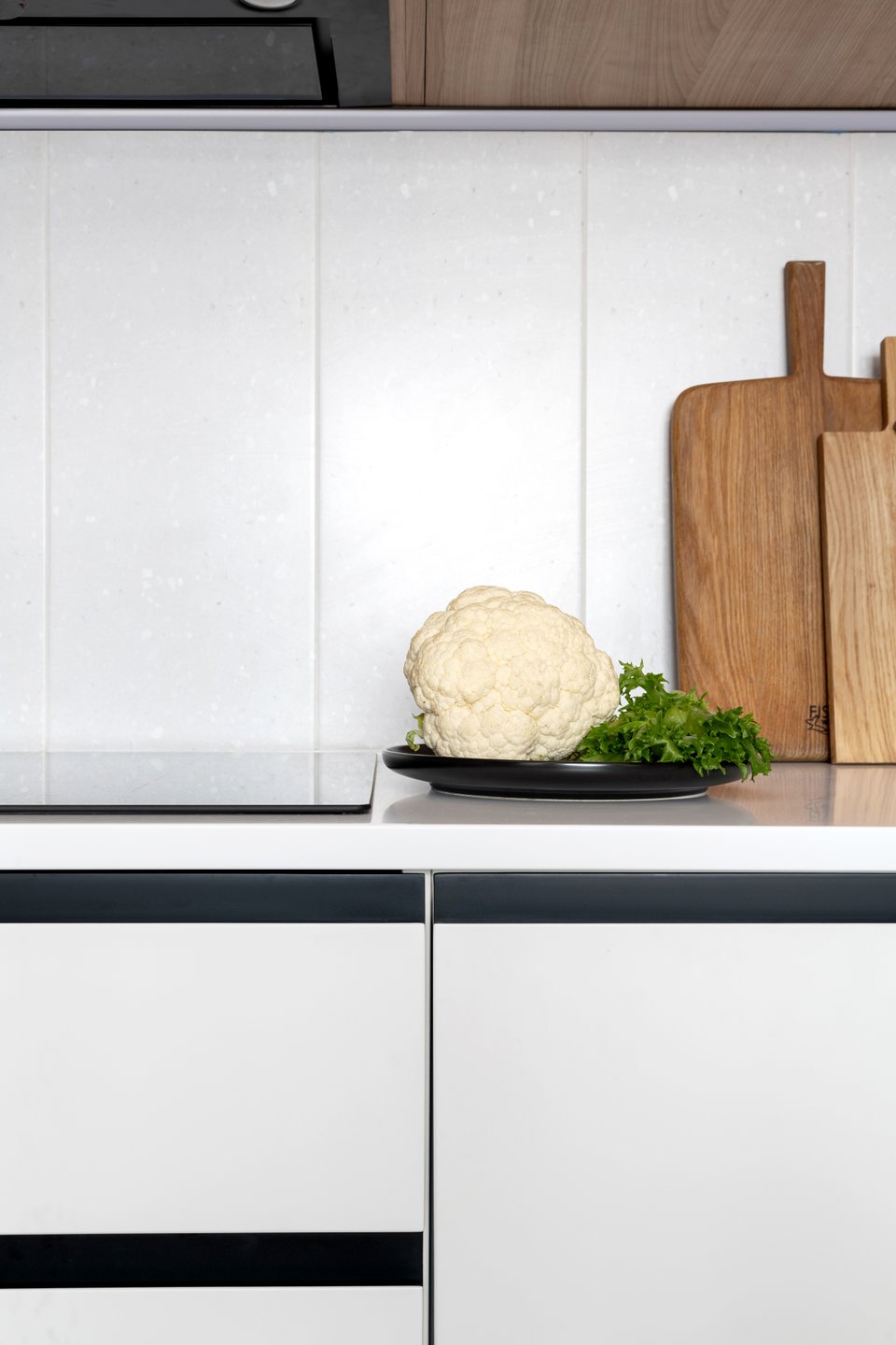Гарнитур был выполнен по индивидуальному заказу: каждое место для хранения здесь продумано во избежание визуального шума на белой столешнице из искусственного камня. Фартук выложили из плитки. «Верхние шкафы с фасадами под дерево реализовали "в потолок", как и другую мебель в квартире. Такой прием визуально вытягивает стены и увеличивает высоту потолка, — комментирует дизайнер. — Нижние шкафы в белом цвете с контрастными черными ручками добавляют графичности и геометрии пространству».