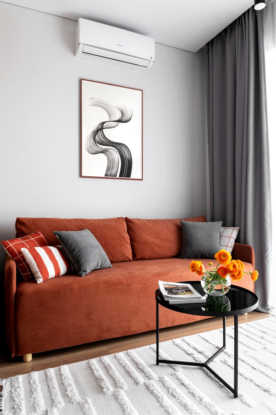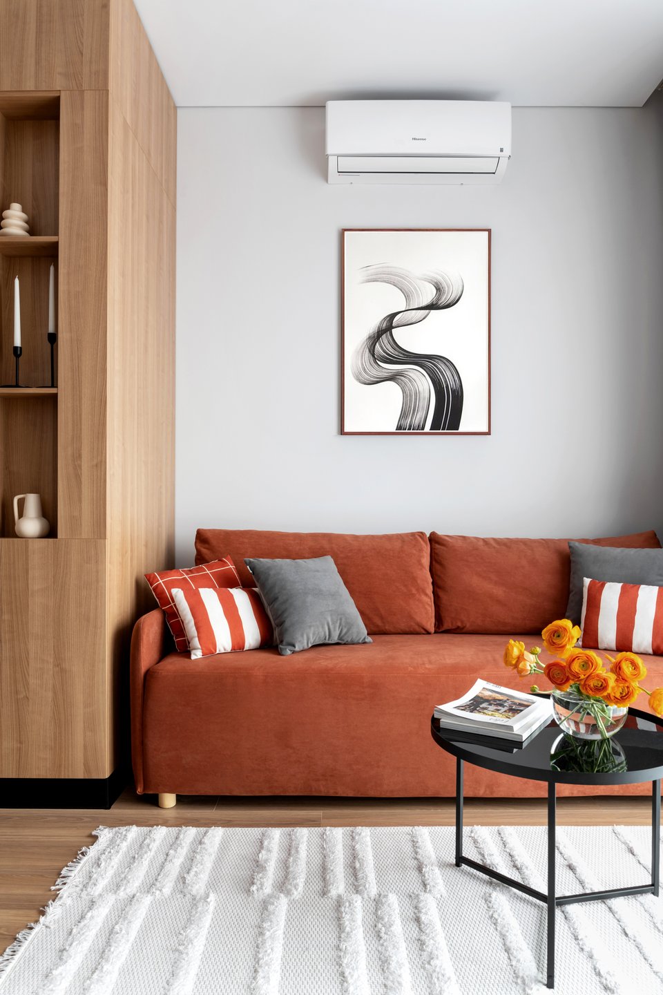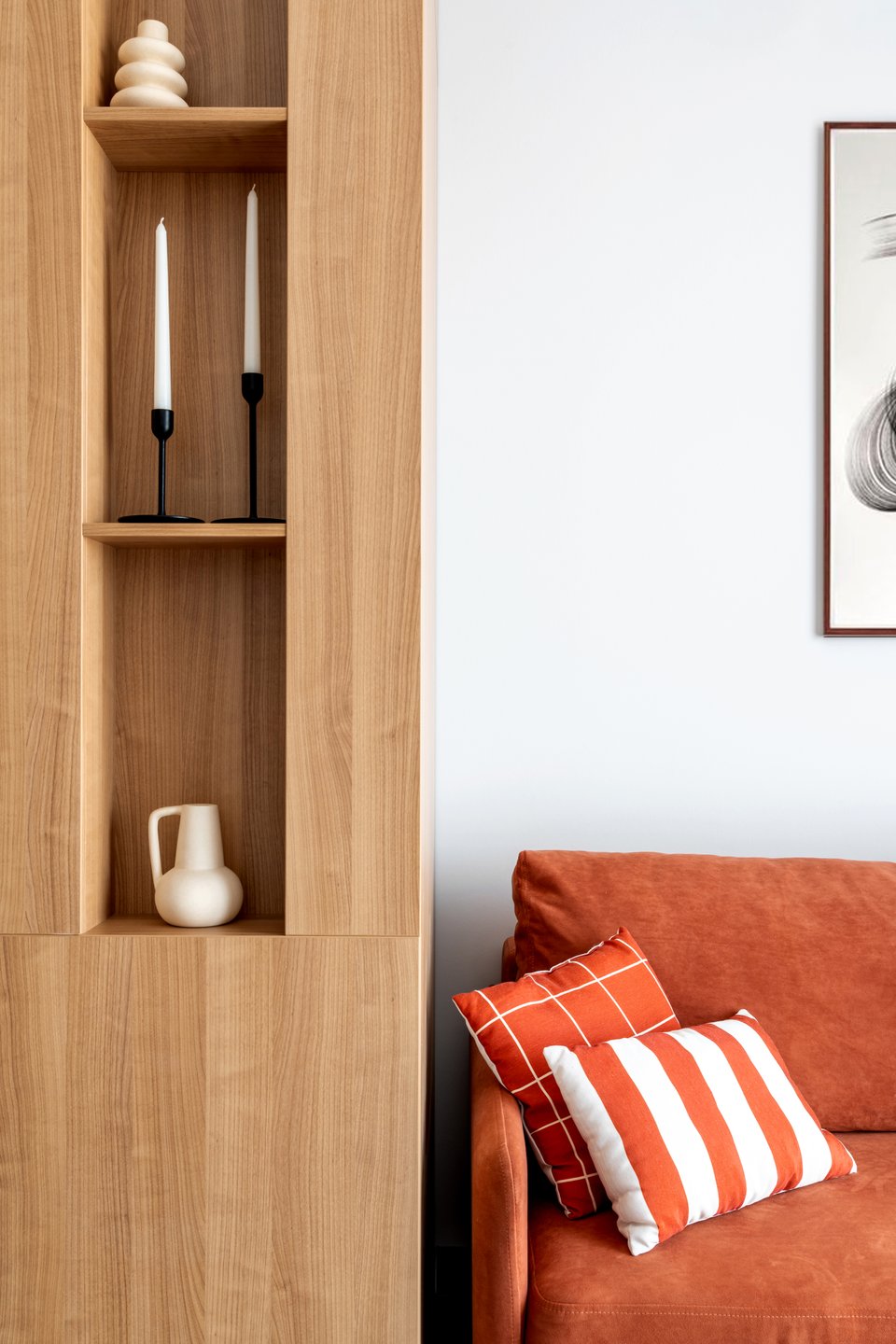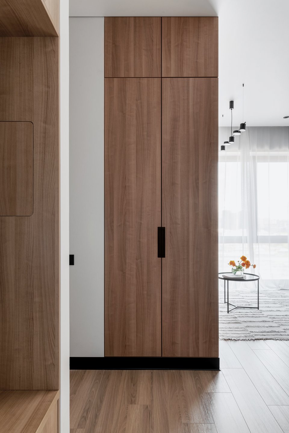 Застройщик сдавал квартиру в отделке white box. У планировки был лишь один недостаток: при входе в квартиру взгляд упирался в диван. Решили задачу с помощью шкафа, который «отсек» гостиную от прихожей. Таким образом зонировали пространство и создали дополнительное место для хранения.