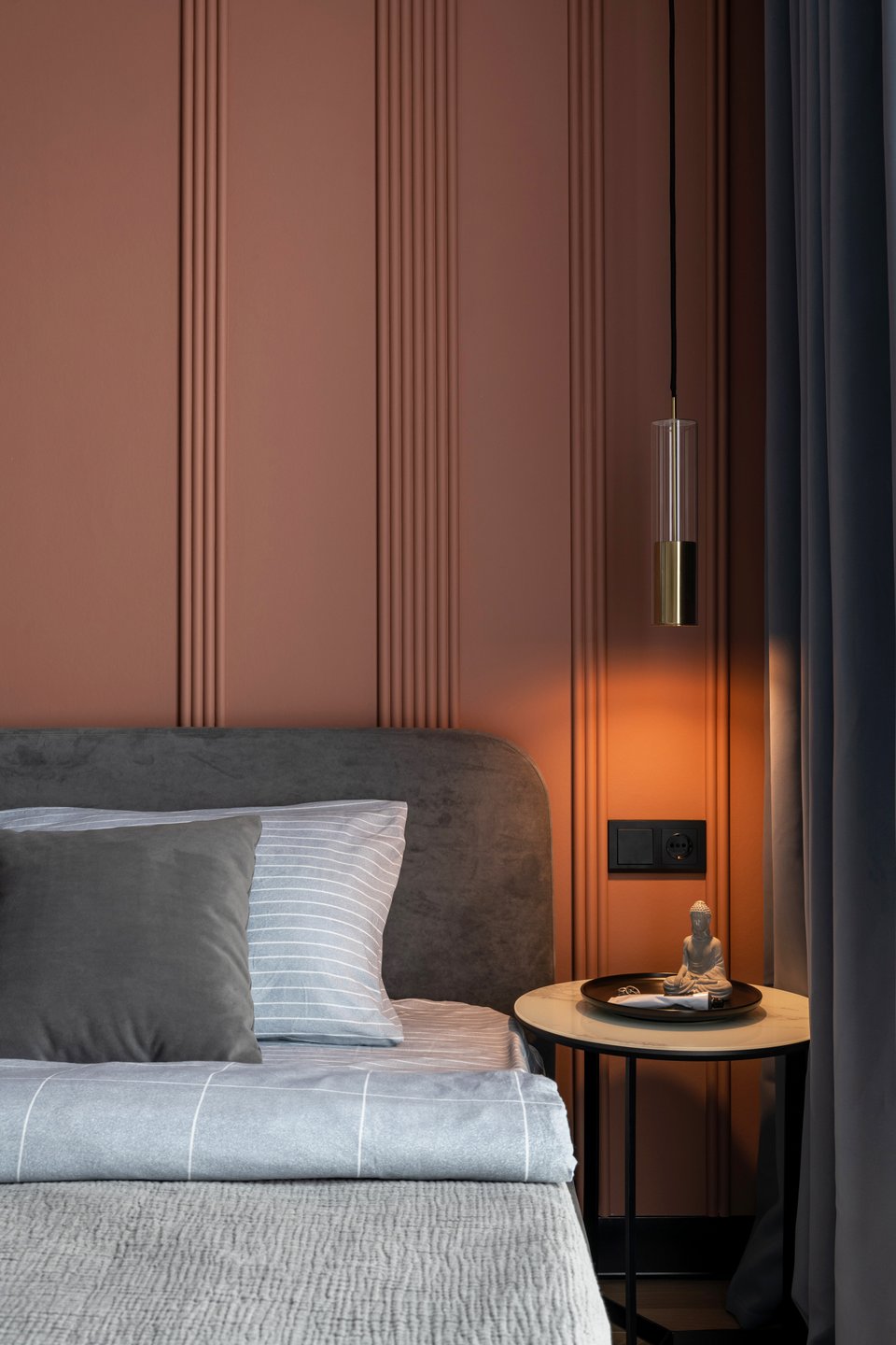 «В спальне создали акцентную стену из молдингов, разместив их вертикально и с разным шагом, а после покрасили в темно-бордовый цвет. Получилось что-то вроде барельефа, но с минимальным бюджетом», — рассказывает дизайнер.