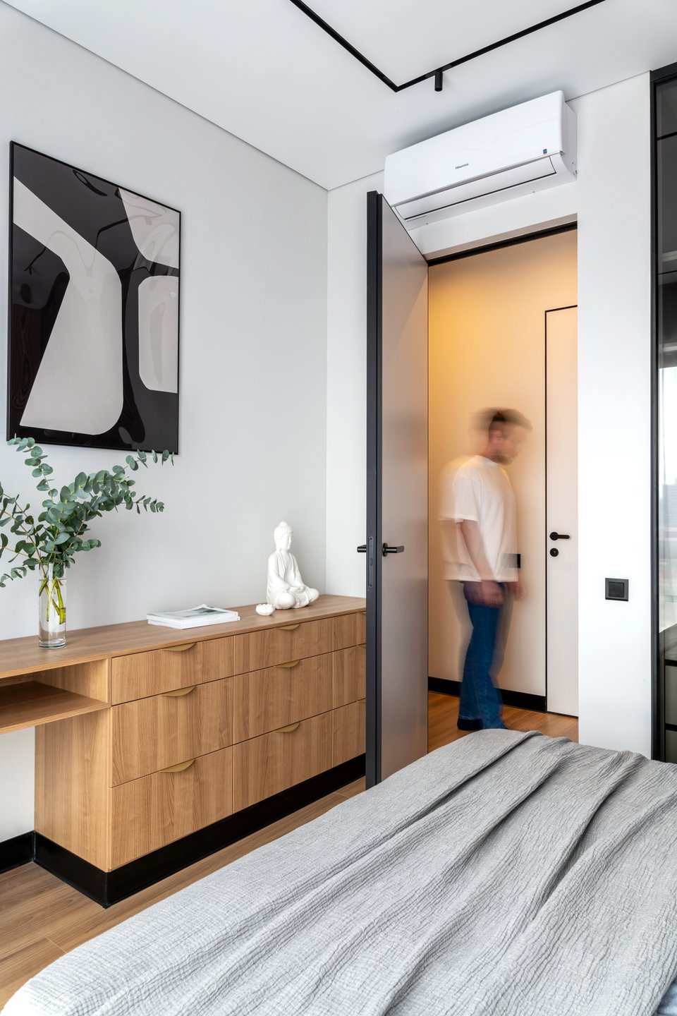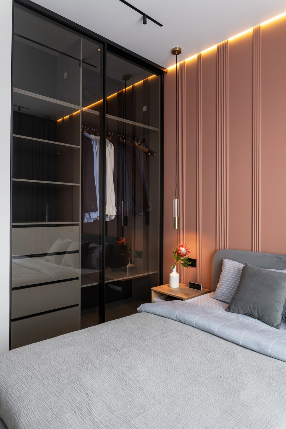 Шкаф-купе «в потолок» разместили в нише: открытые полки, выдвижные ящики и вешалки систематизируют хранение личных вещей. Стеклянные раздвижные двери в черном профиле создают пару с трековой системой освещения, добавляя геометрии в пространство спальни.