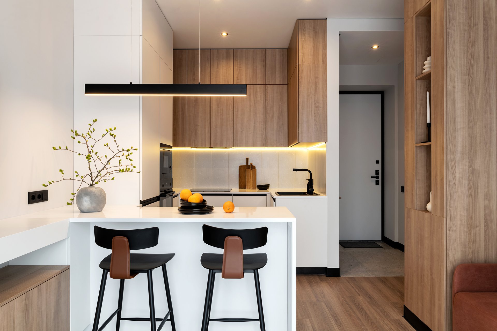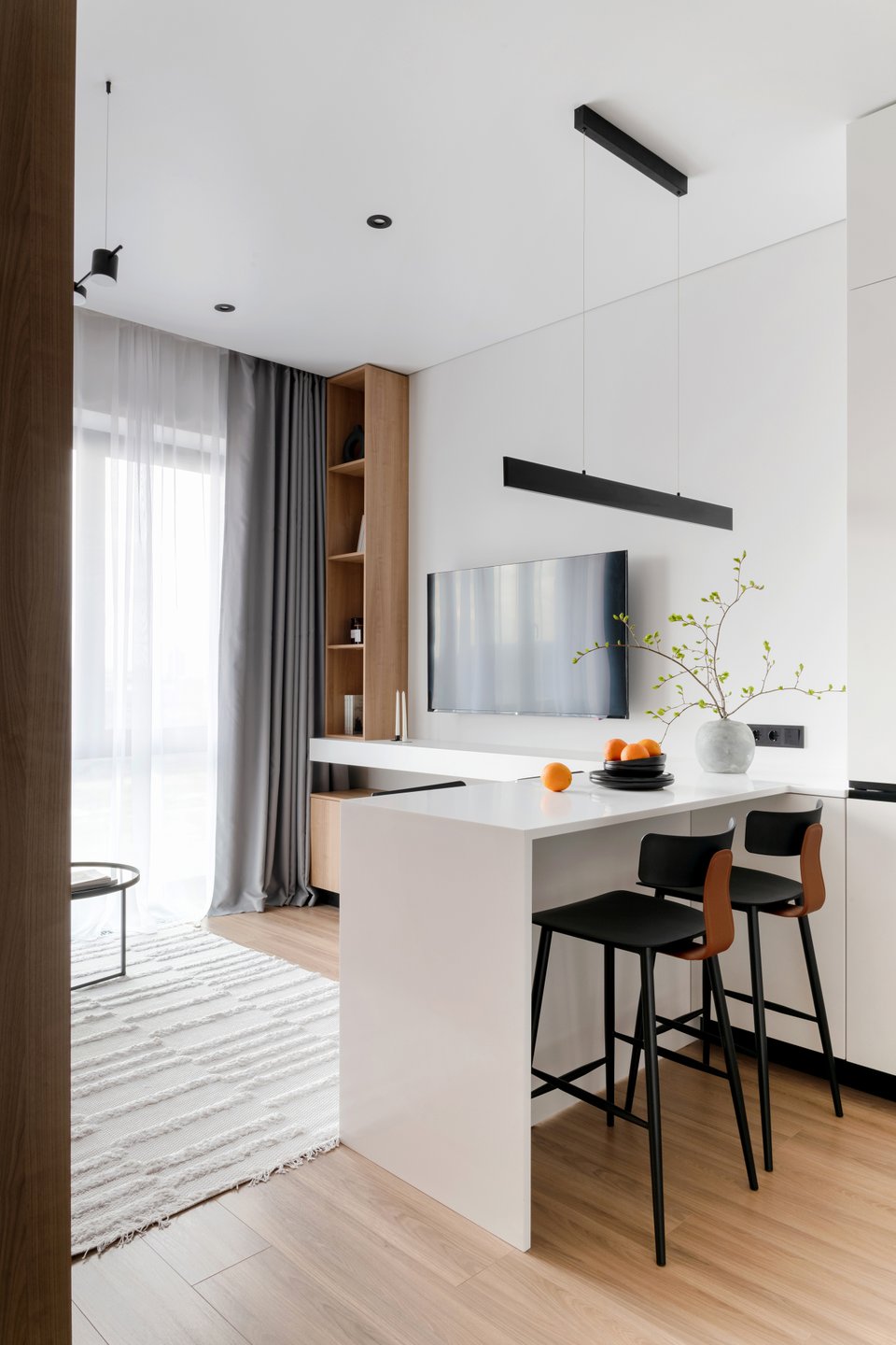 Обратите внимание на подвес над стойкой, который дополняет контрастные черные фурнитуру и светильники. Все освещение в квартире «теплое» — 3000 К.