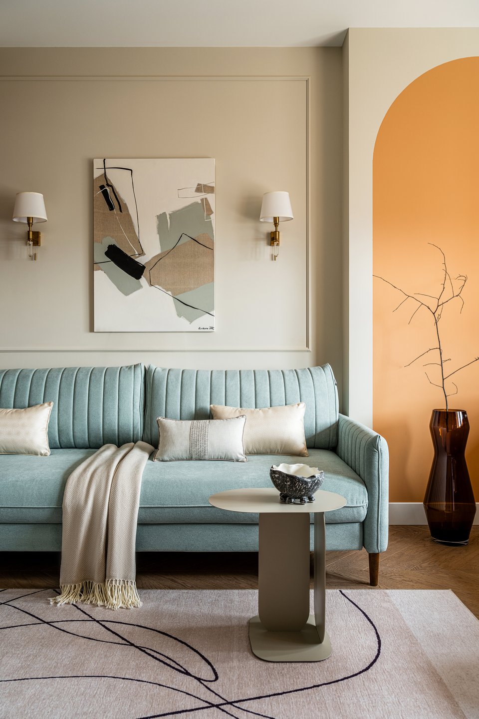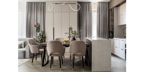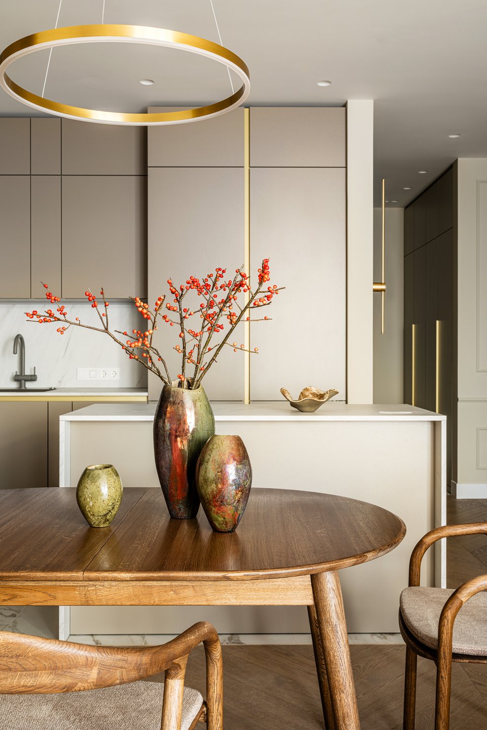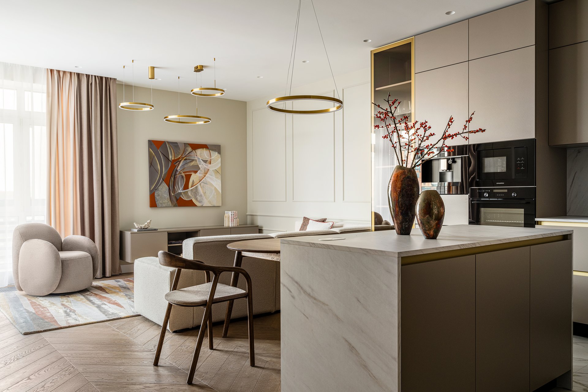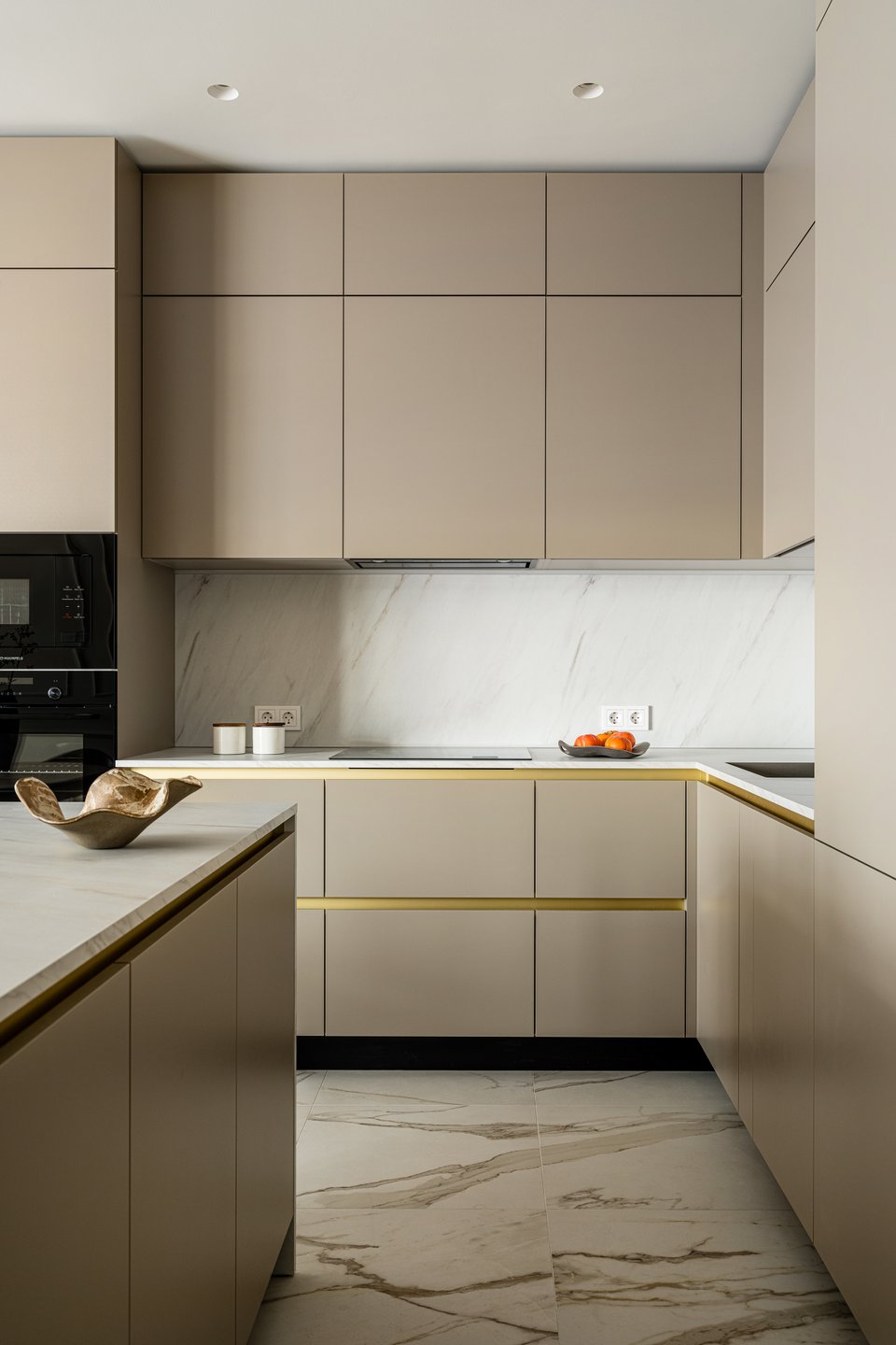 Самое большое помещение в квартире — кухня-гостиная, в которой максимально сохранили «легкость» и простор. Кстати, для всех жилых помещений выбрали единый оттенок стен — универсальный серо-бежевый. Он придал пространству ощущение единства. Дополнительным объединяющим элементом стал латунный профиль, который «прошел» по всей квартире. Металл появился в элементах светильников, в дизайне ручек и сантехнических аксессуаров, в виде профиля на кухонных фасадах. Акцентные цвета — голубой, персиковый, кофейный и терракотовый — завершили дизайн-код этого проекта.