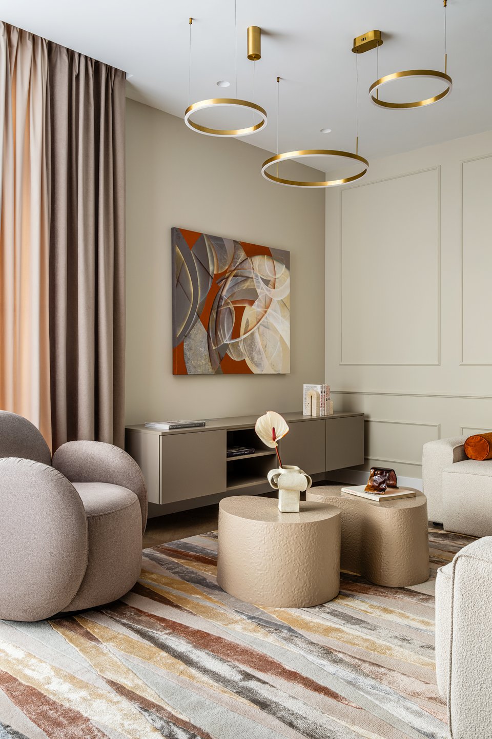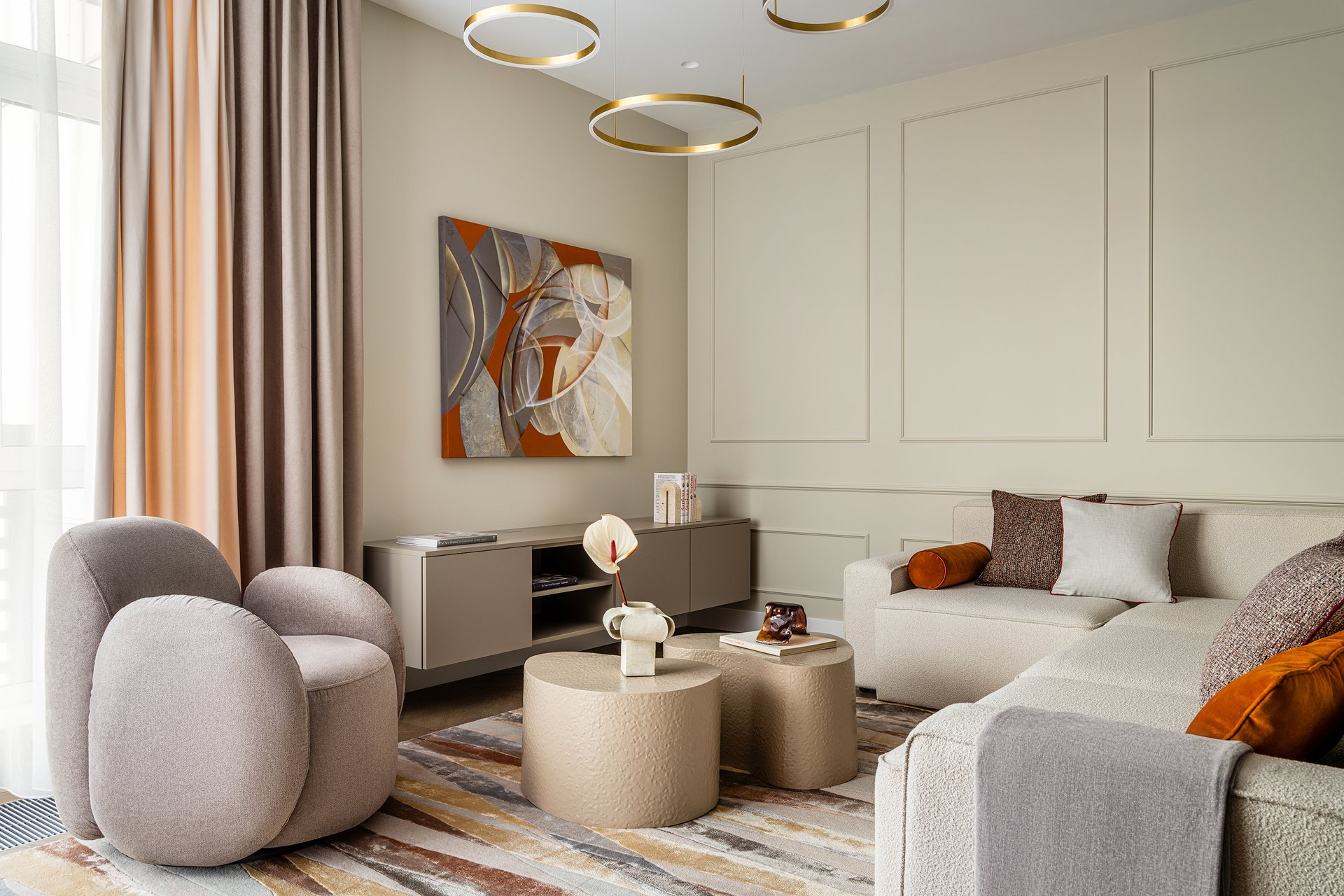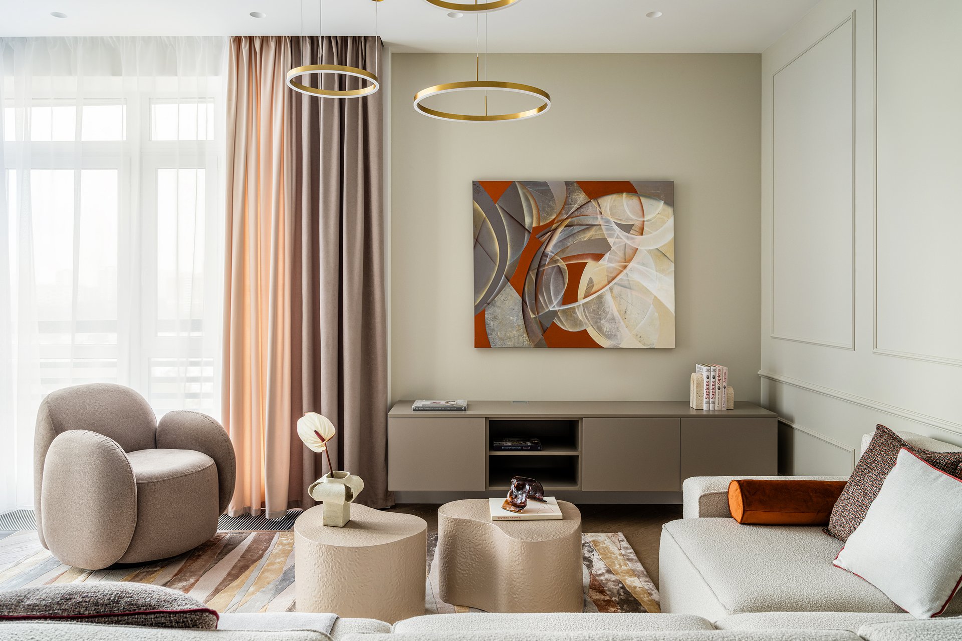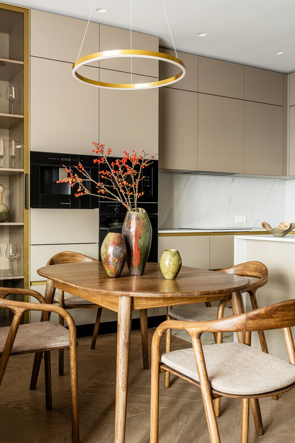 Самое большое помещение в квартире — кухня-гостиная, в которой максимально сохранили «легкость» и простор. Кстати, для всех жилых помещений выбрали единый оттенок стен — универсальный серо-бежевый. Он придал пространству ощущение единства. Дополнительным объединяющим элементом стал латунный профиль, который «прошел» по всей квартире. Металл появился в элементах светильников, в дизайне ручек и сантехнических аксессуаров, в виде профиля на кухонных фасадах. Акцентные цвета — голубой, персиковый, кофейный и терракотовый — завершили дизайн-код этого проекта.