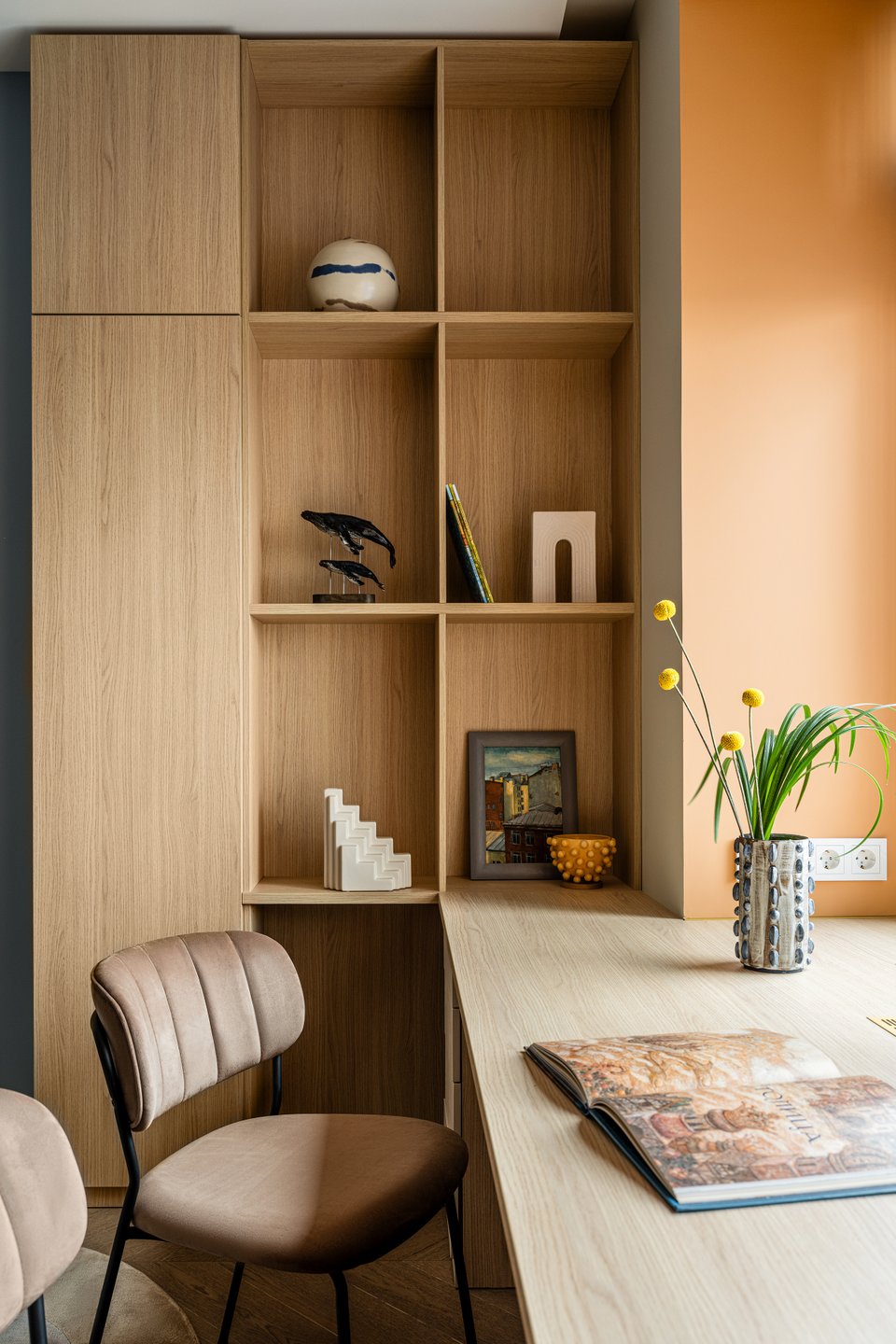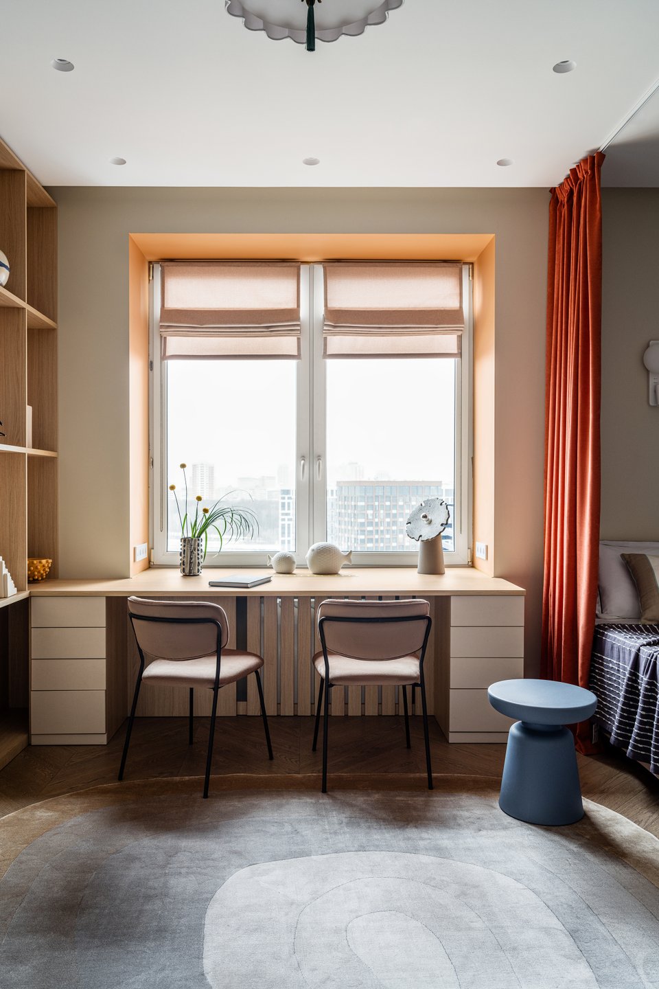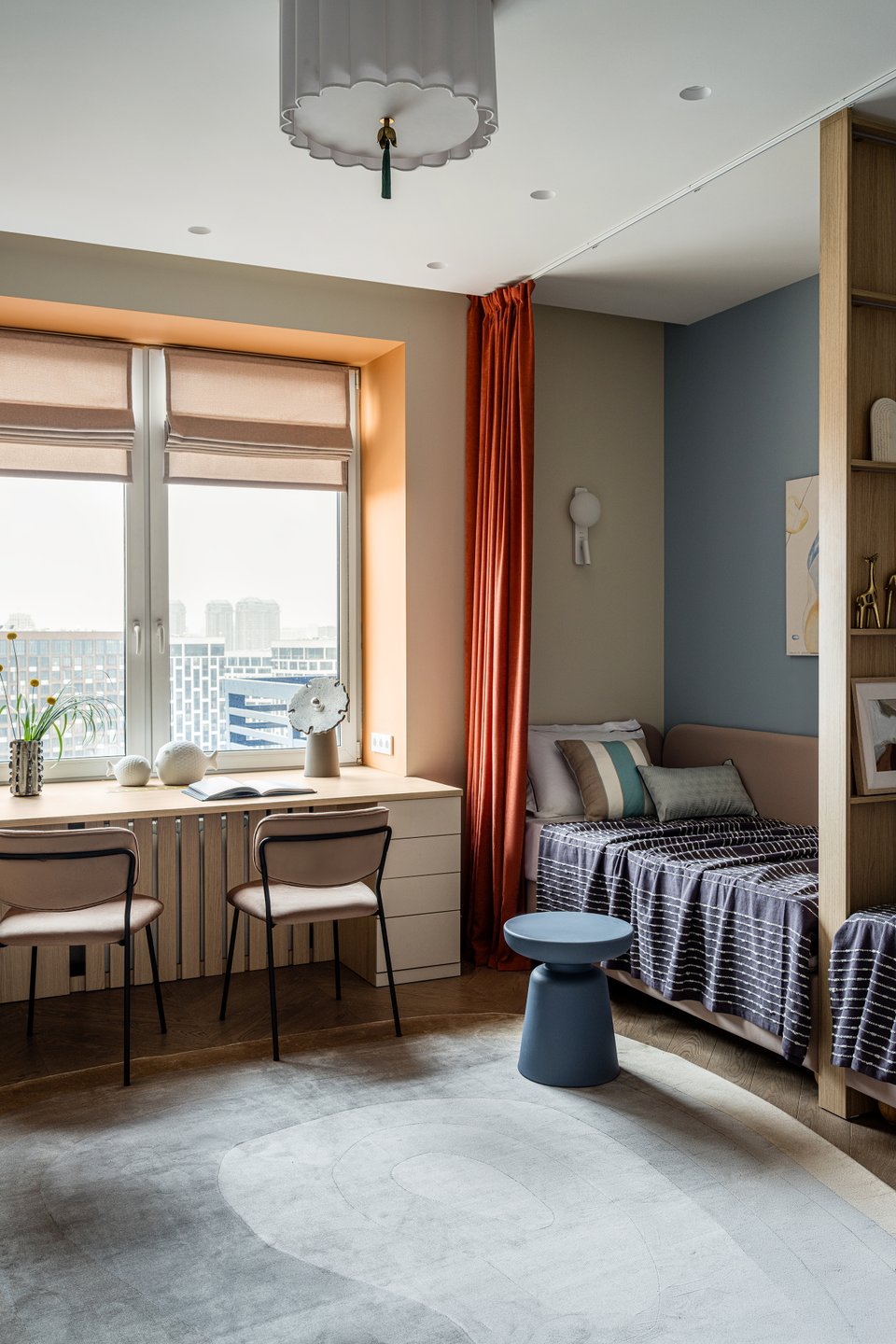 Кабинет спроектировали таким образом, чтобы можно было организовать здесь дополнительную детскую, так как семья может пополниться в ближайшее время. В этом пространстве предусмотрены различные сценарии жизни: здесь можно отдохнуть, поработать в тишине, а также разместить гостей на случай их приезда и ночевки.