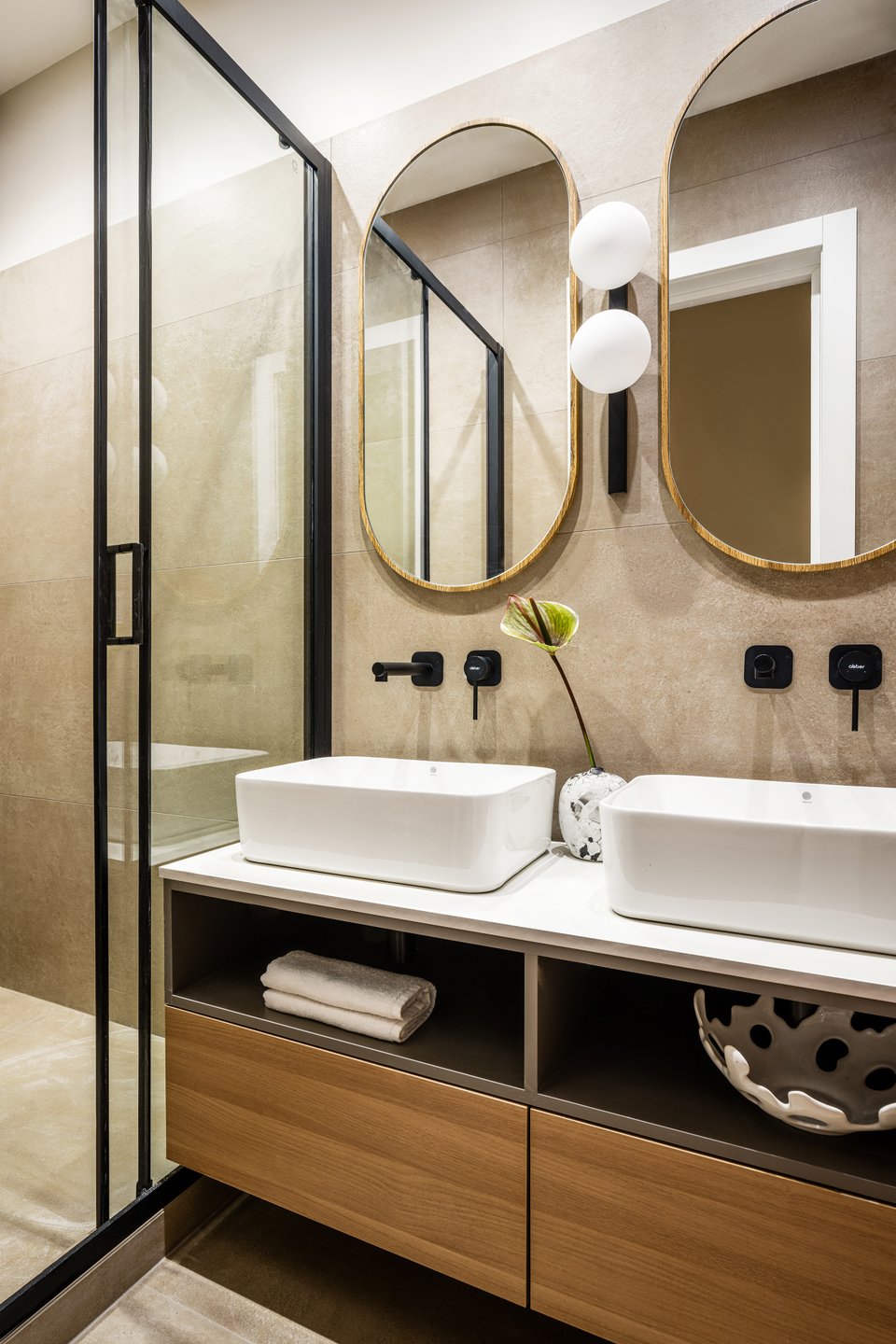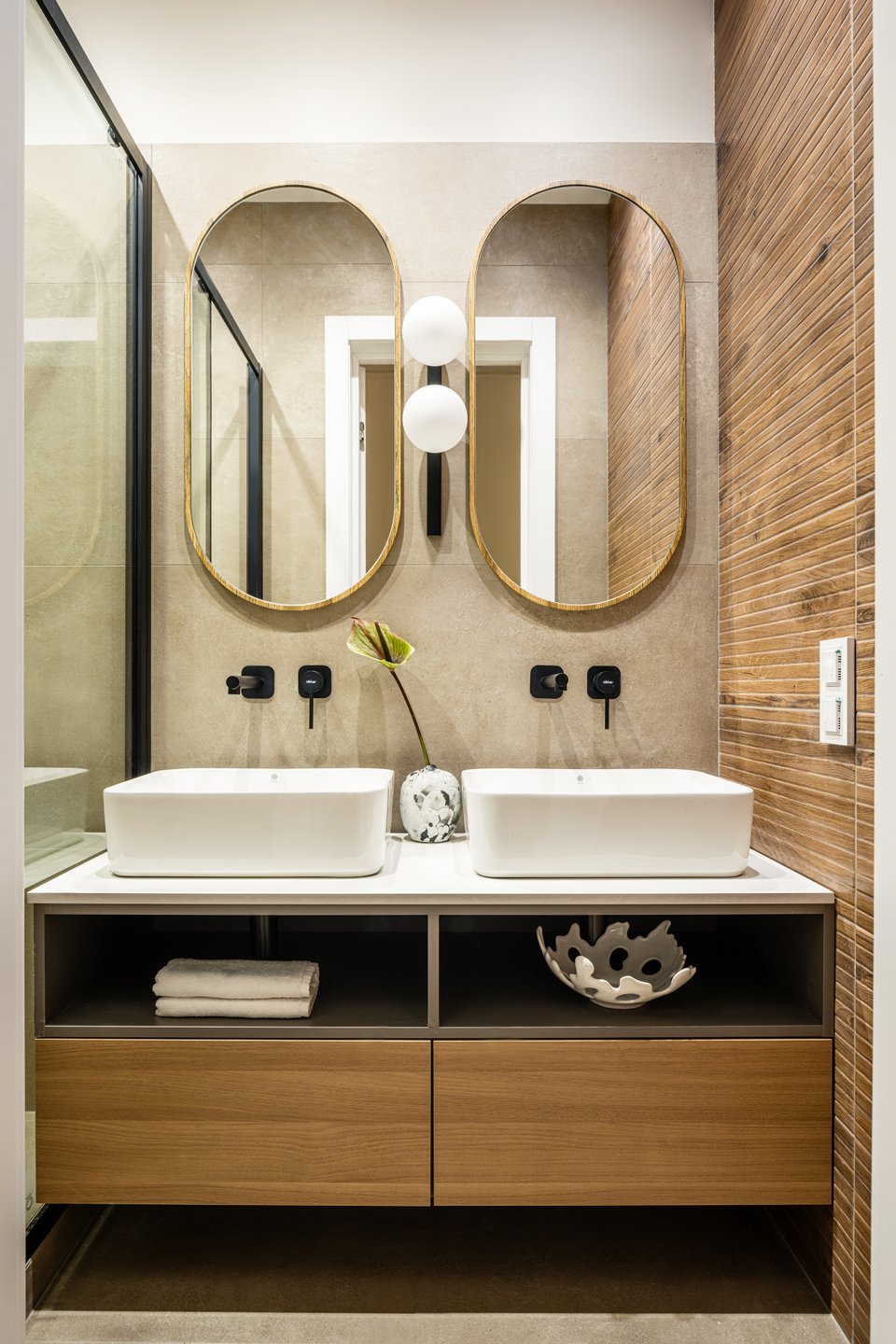 Детскую душевую также оснастили двумя раковинами на столешнице. Неординарным элементом здесь выступает стена, выложенная плиткой под дерево, которая составляет пару деревянным рамам зеркал. Динамику и графичность санузлу добавляет черный цвет в бра, смесителях, а также профилях душевой.