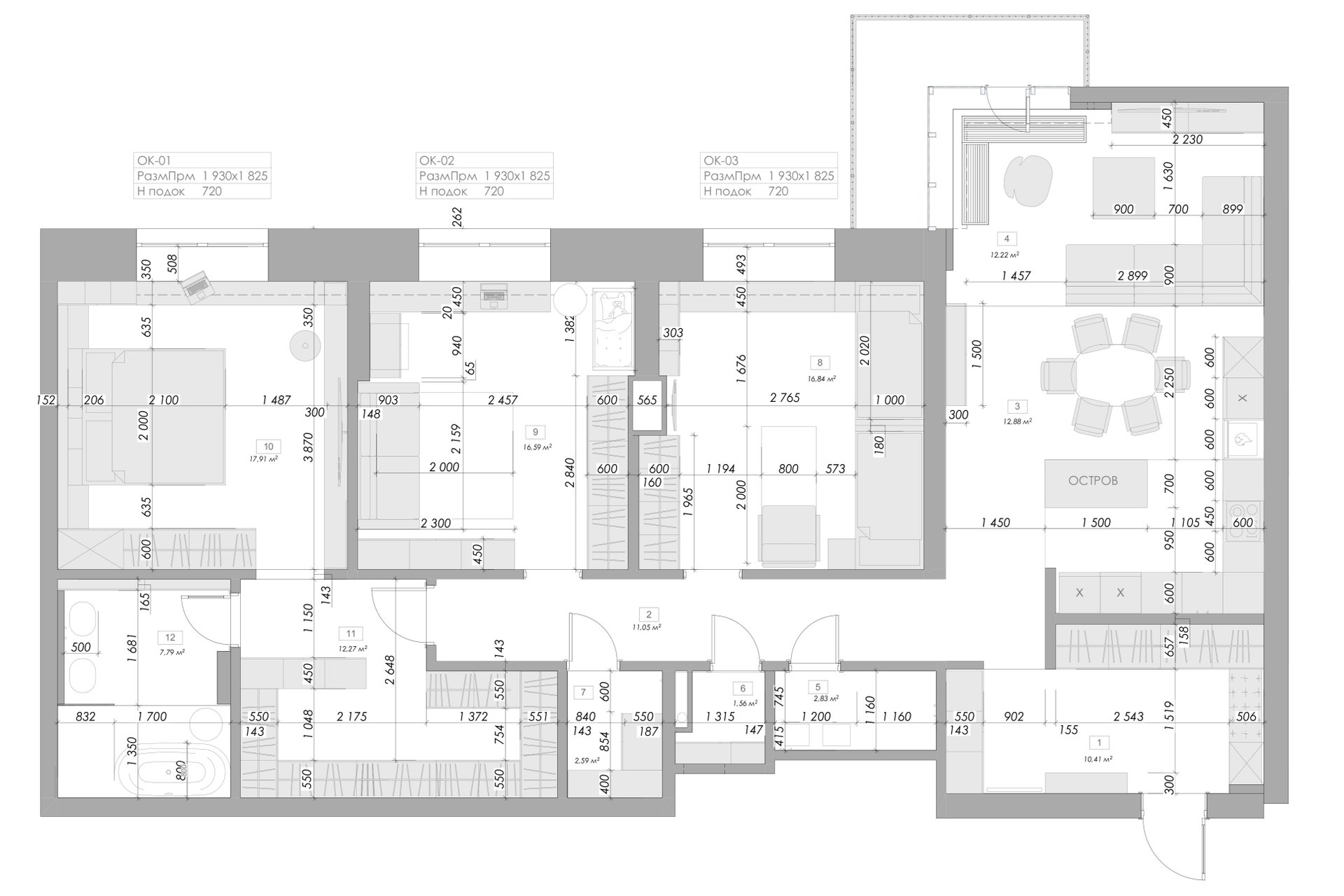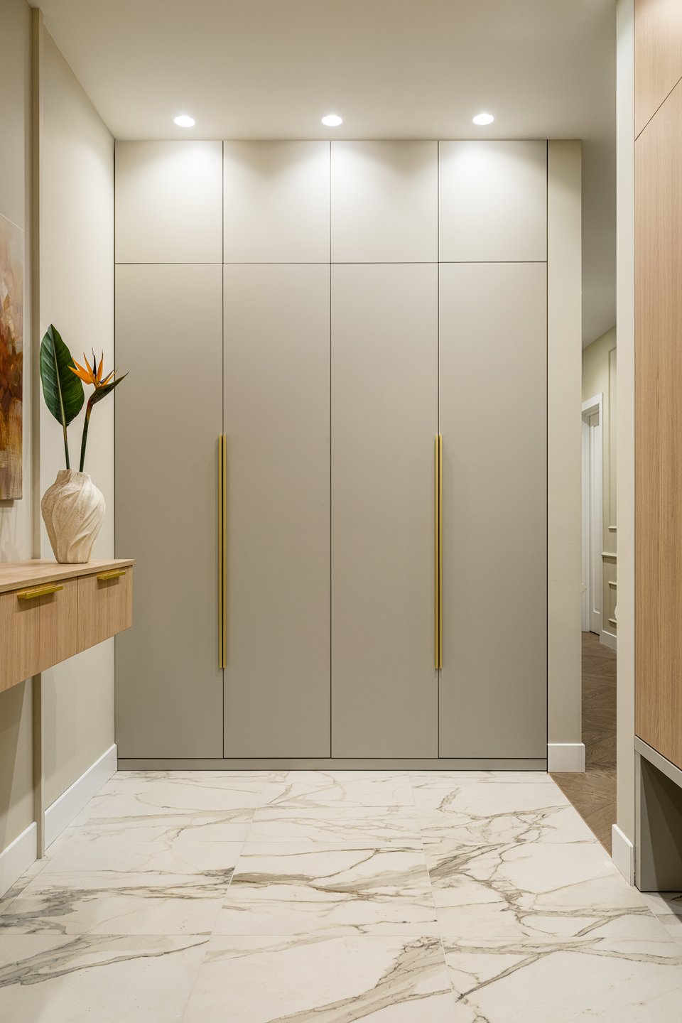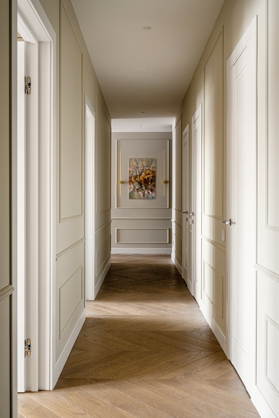«Этот проект — пример адаптации интерьера к современным реалиям при максимальном сохранении исходных данных: границ помещений, отделки, электрики, — рассказывают авторы проекта. — Планировку меняли только в деталях. Во-первых, разделили один из совмещенных санузлов — это представлялось логичным, так как в квартире будет проживать семья из четырех (а в будущем, возможно, пяти) человек. Во-вторых, перенесли вход в постирочную. В-третьих, сделали большую проходную гардеробную в мастер-блоке. Электрику оставили практически нетронутой: сделали только минимальные корректировки под новую расстановку мебели. Стиль проекта мы определили как деликатную классику: здесь есть лепнина, арочные элементы, латунные акценты».