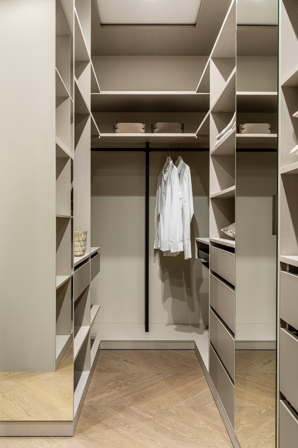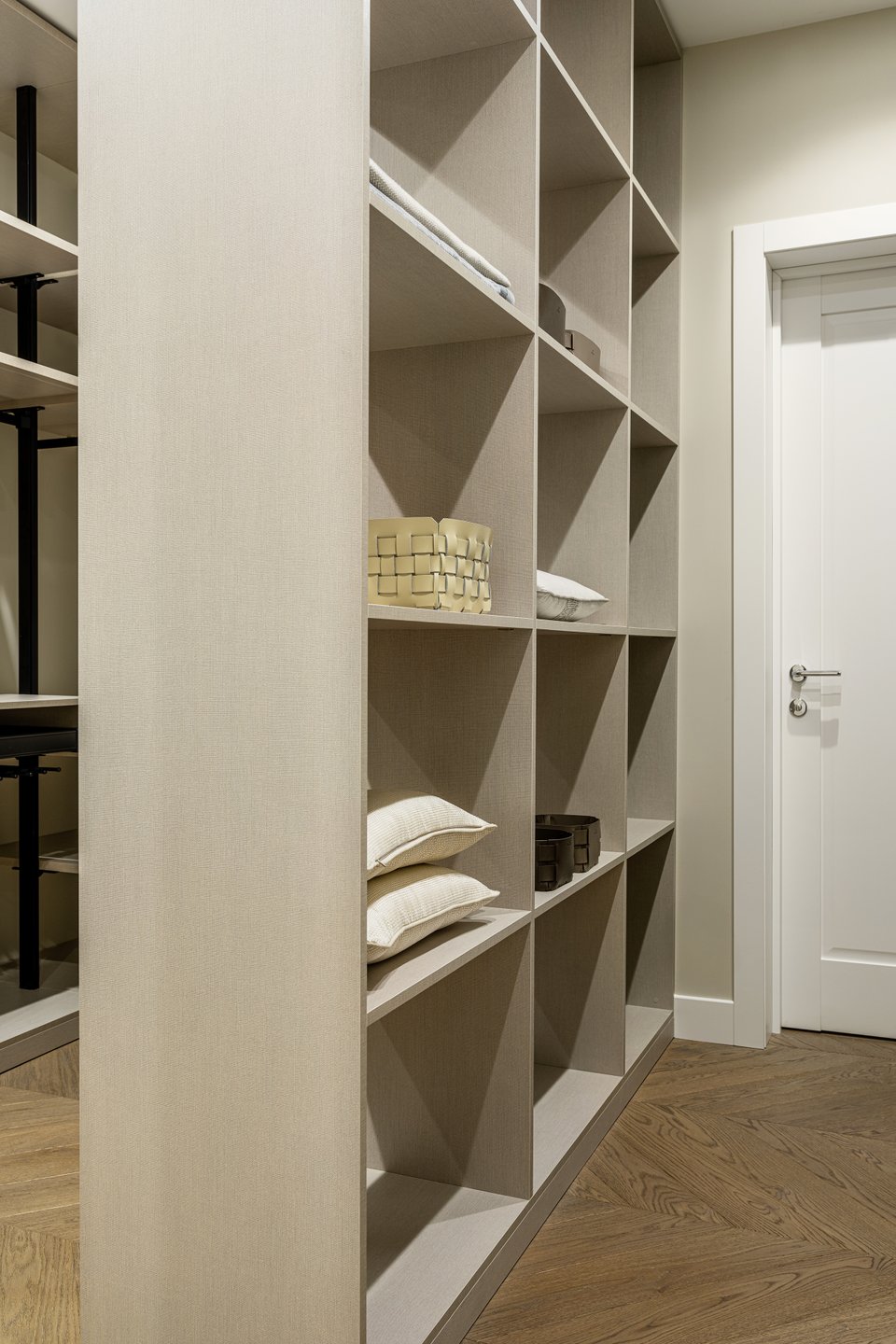 Основная система хранения в проекте — гардеробная рядом со спальней. Гардеробная проходная, со множеством открытых витрин для любимых предметов хозяйки. Большие зеркала «растворяют» мебель в пространстве, а материал корпусов имеет легкое тиснение. Кроме этого «твидового» рельефа, визуальный контраст к гладким светлым поверхностям создают черные штанги.