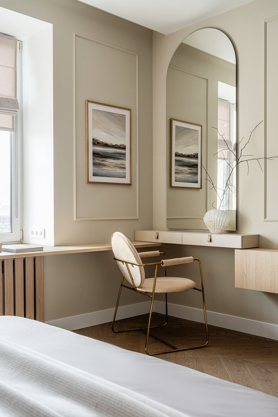 Подоконник превратили в хоум-офис: здесь удобно разместиться за чтением или работой на ноутбуке. Туалетный столик с большим арочным зеркалом установили у окна, а ТВ-тумбу — напротив кровати.