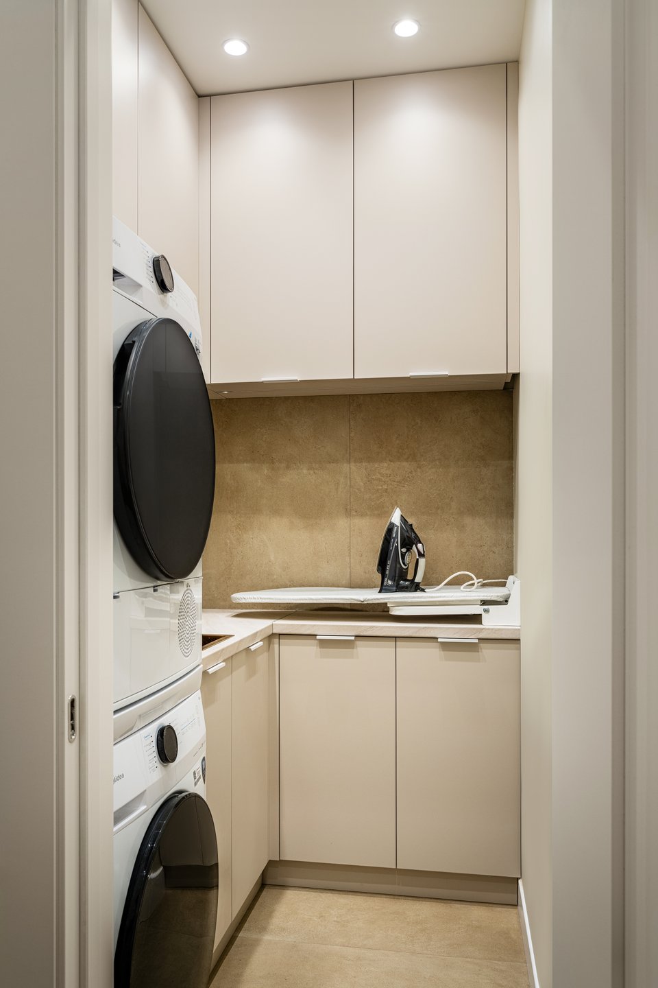 Постирочная находится рядом с гардеробной. Компактную комнату оснастили вместительными шкафами, раковиной, гладильной доской, а также стиральной и сушильной машинами.