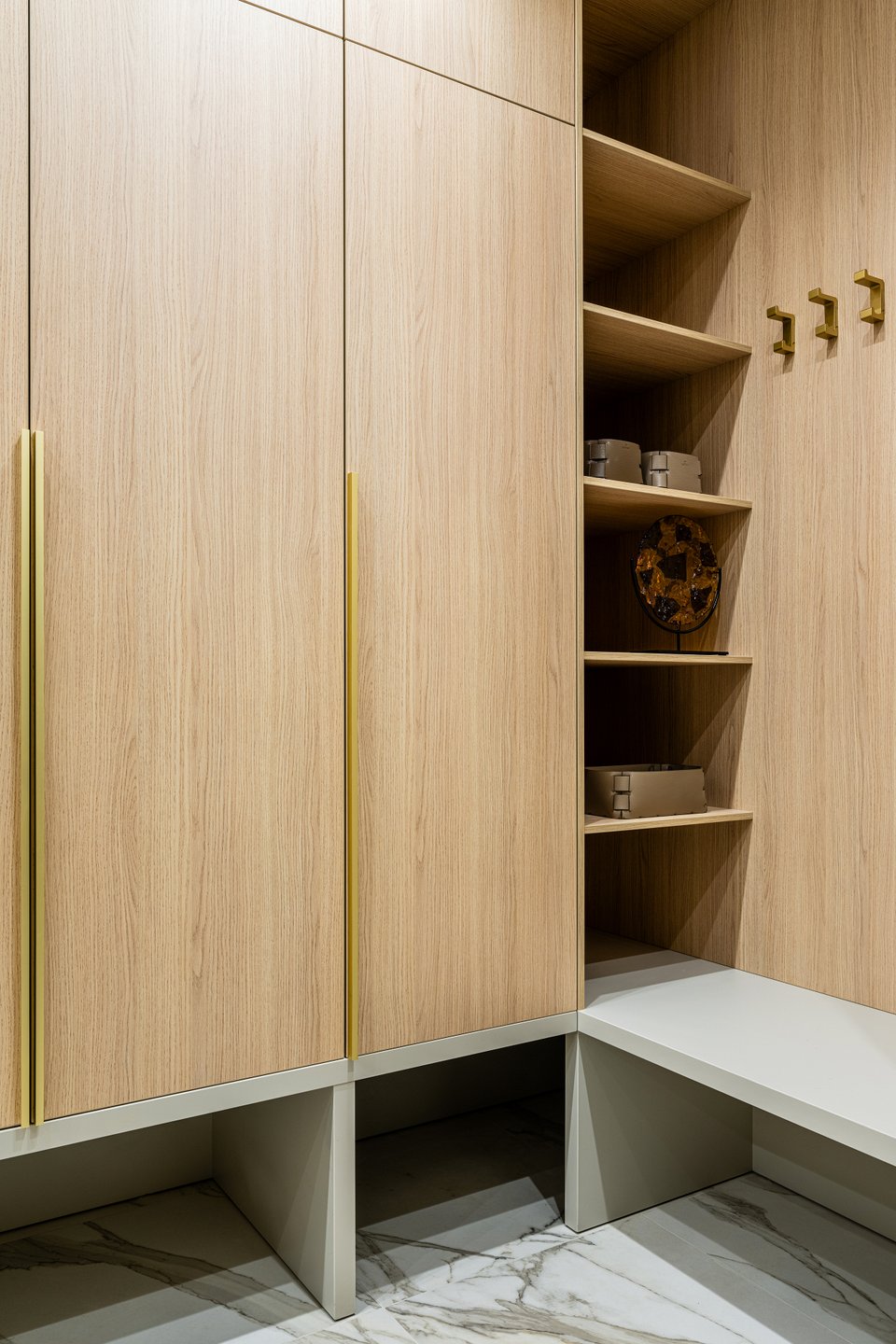 Вместительную систему хранения организовали в прихожей: все шкафы доведены до потолка, внизу спроектированы открытые полки для визуального облегчения пространства. Это впечатление усиливает нижняя подсветка.