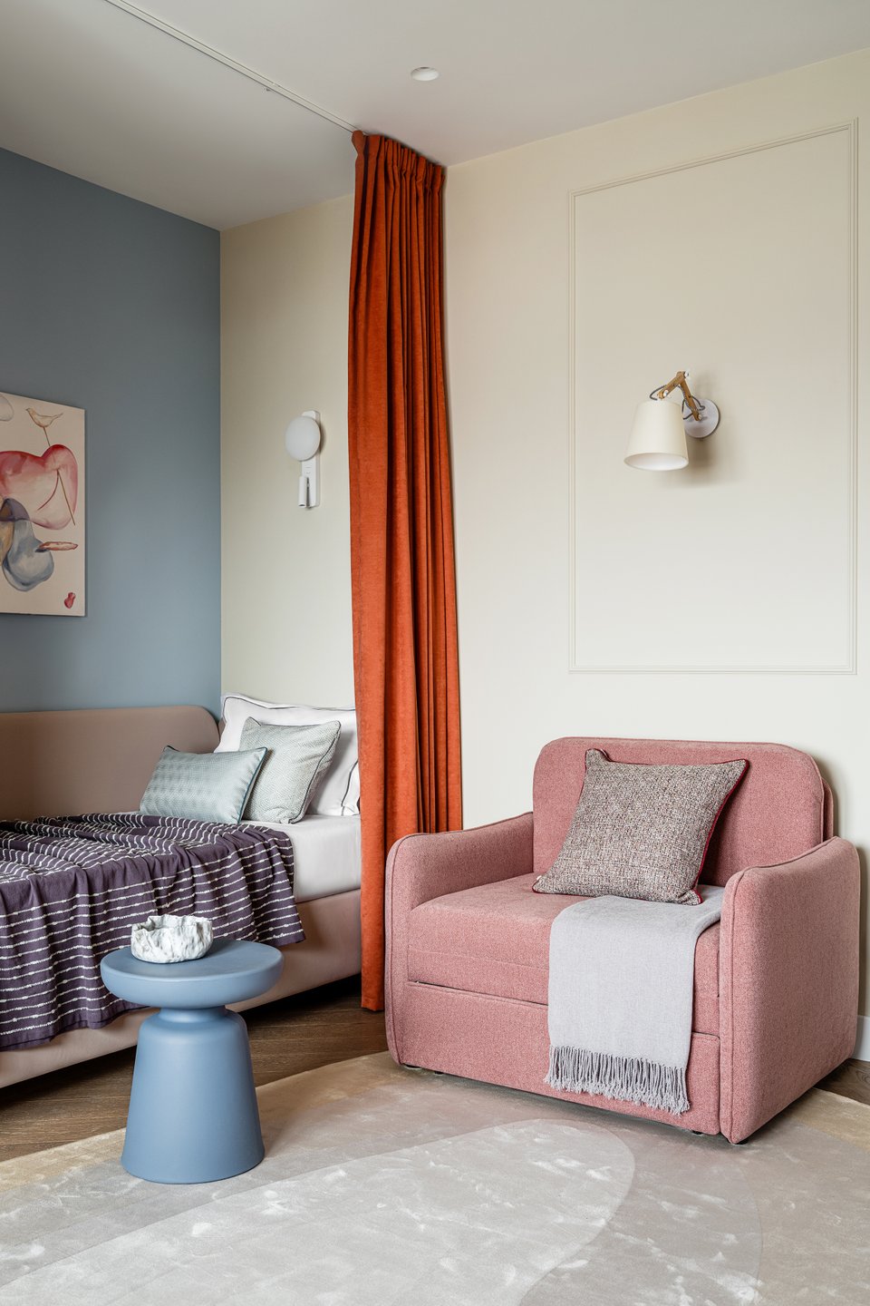 Кресло-кровать Кейсес заказали у бренда divan.ru: впервые увидели такое удачное сочетание функциональности и дизайна. Между ним и кроватями для мальчиков очень небольшое расстояние — нужен был акцентный, компактный и прочный столик. Идеально подошел Лили из переработанного пластика.