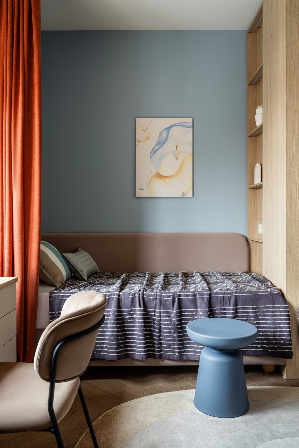 Детская комната предназначена для двух сыновей заказчиков. Расстановку мебели продумали так, чтобы обеспечить максимальную приватность каждому — у мальчиков разный режим дня. Кровати поставили одна за другой и разделили их стеллажом. Блок розеток предусмотрели с обеих сторон. У каждой «спальной капсулы» есть бра, а также блэкаут шторы, которые позволяют создать независимое пространство.