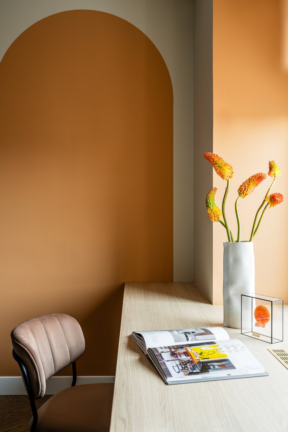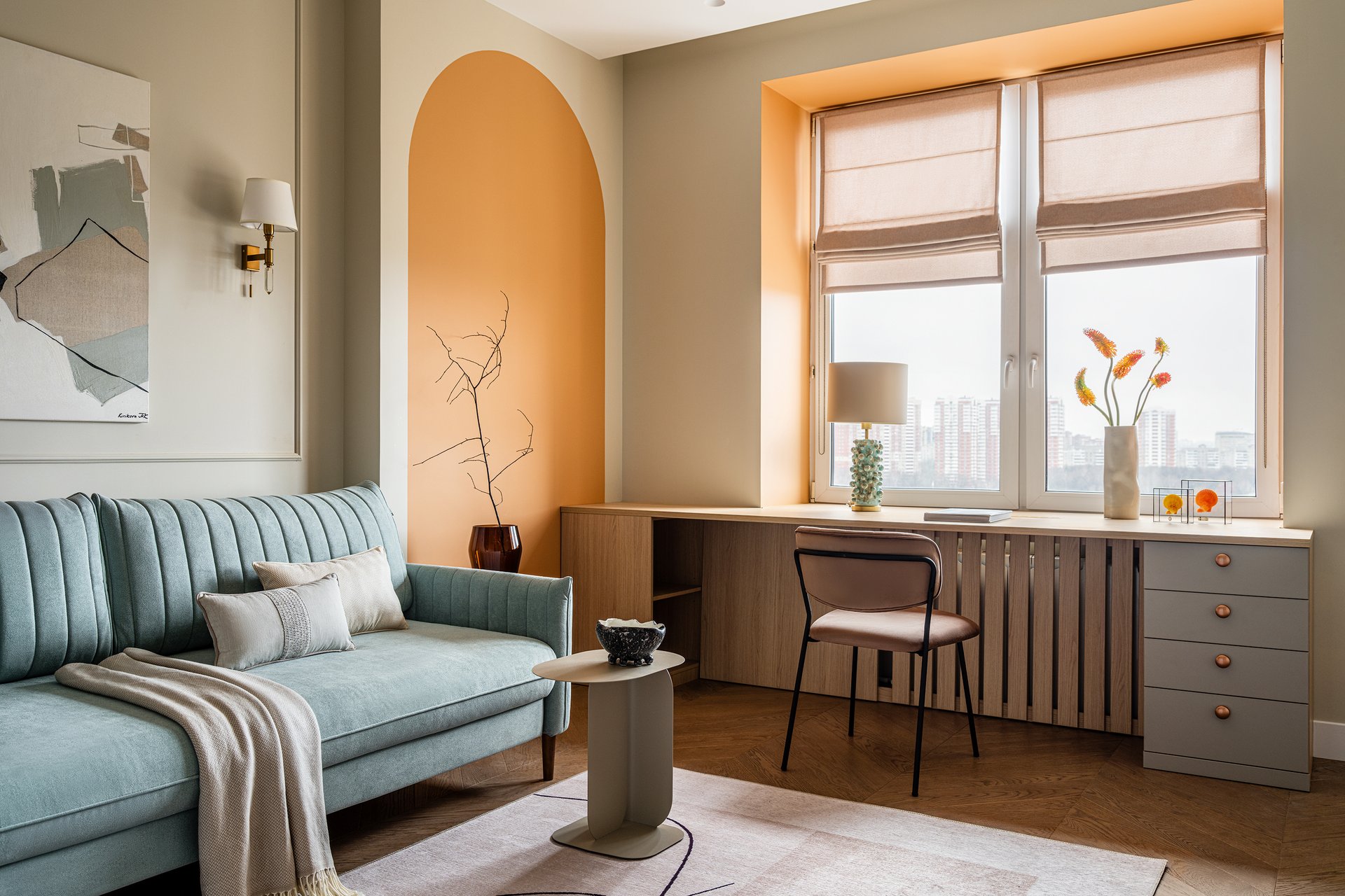 Обратите внимание на арку терракотового оттенка на стене, также этот цвет использован в оконных откосах и открытых полках шкафа. Теплое и «солнечное» настроение поселилось в комнате и добавило жизнерадостности интерьеру.
