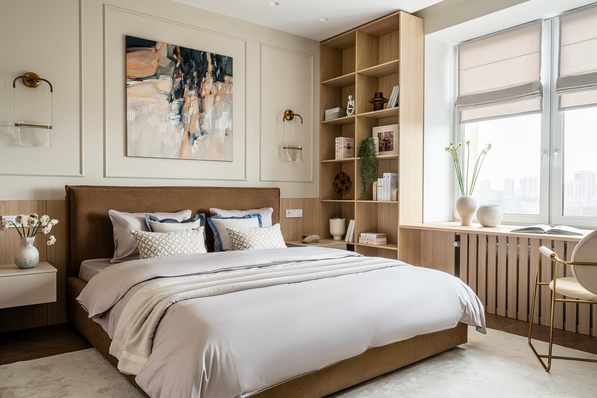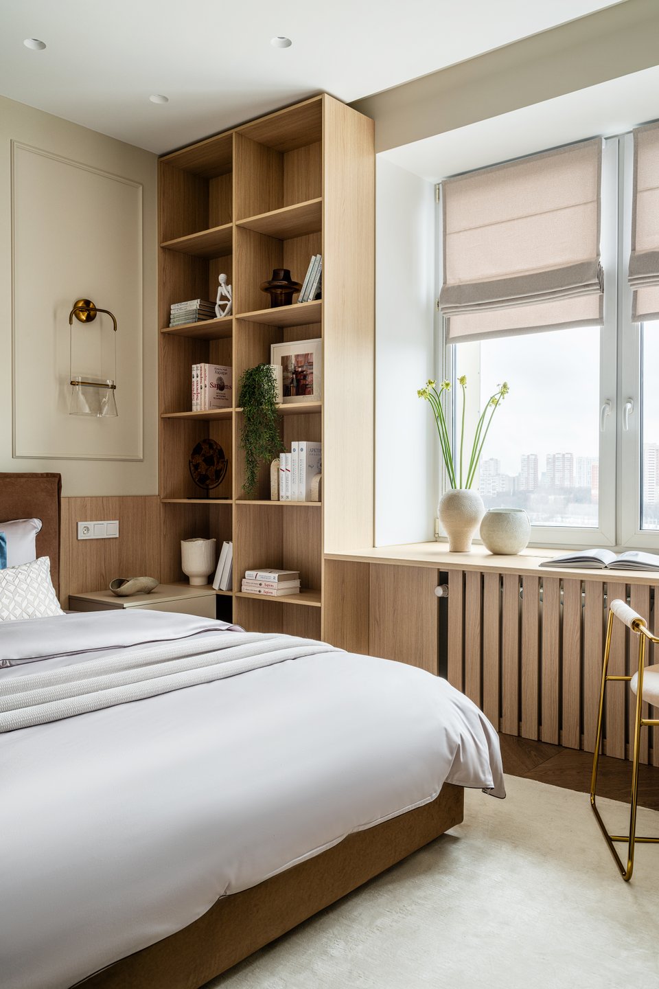 Нижнюю часть стен в спальне выделили стеновой панелью под дерево. С ее же помощью спрятали радиаторы: заказали съемный экран на магнитах из того же материала, что и мебель. Все столярные изделия в спальне формируют единую линию, «опоясывающую» помещение. Прикроватная тумба «заходит» в нишу платяного шкафа: несмотря на наличие отдельной гардеробной, у заказчиков был запрос на максимальное количество мест для хранения.