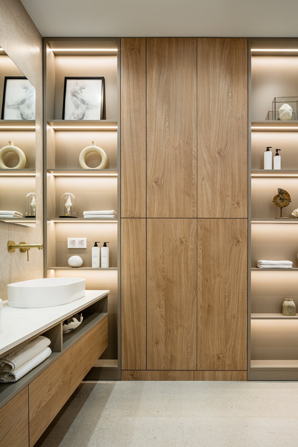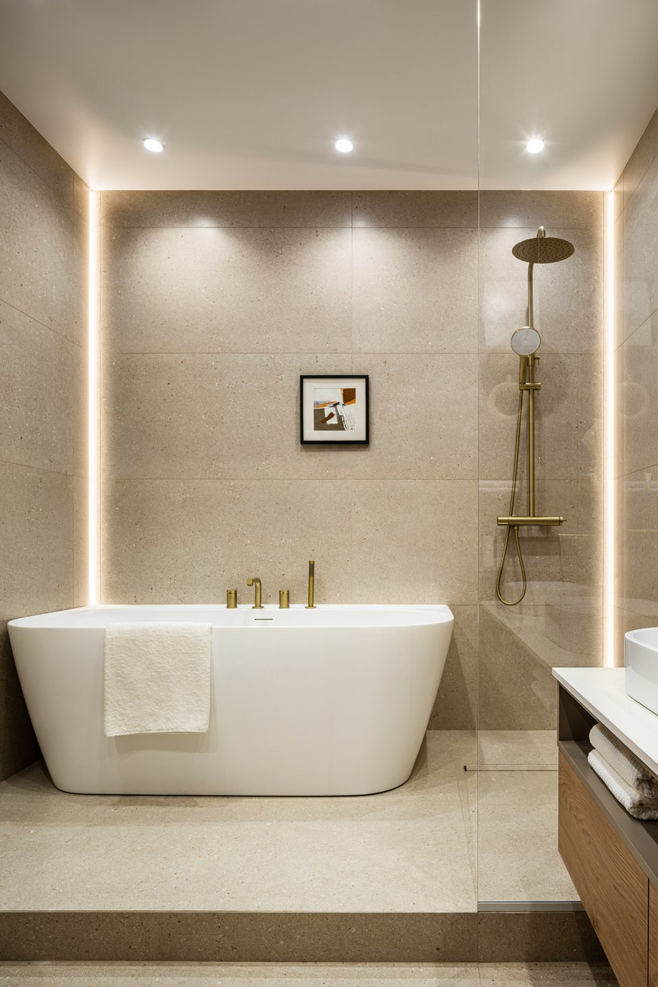 Обратите внимание на разные сценарии освещения. Точечное потолочное как основное, а также дополнительное (для визуального выделения мокрой зоны) — подсветка по периметру, которая создает камерную и расслабляющую атмосферу.