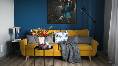 Графика украшает и стену в изголовье кровати в спальне. Она притягивает взгляд и наполняет комнату цветом. Синий, бордовый, горчичный, светло-серый, оттенок пыльной розы — эта цветовая гамма присутствует в мебели, аксессуарах и текстиле спальни.