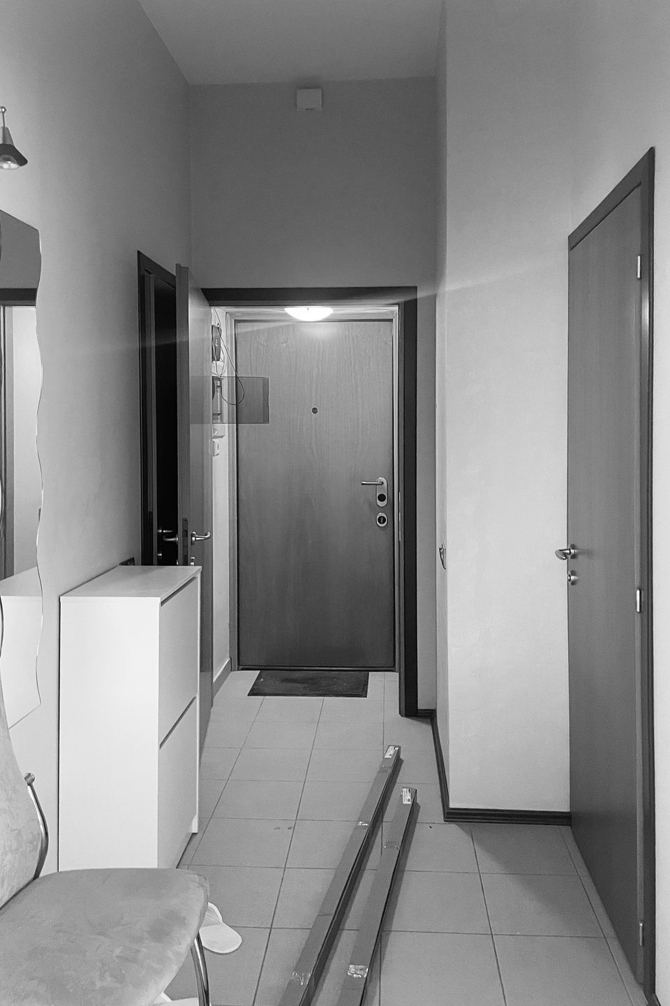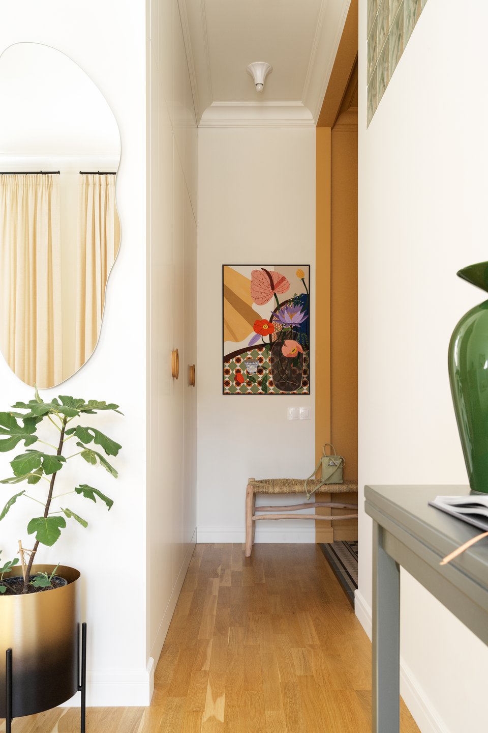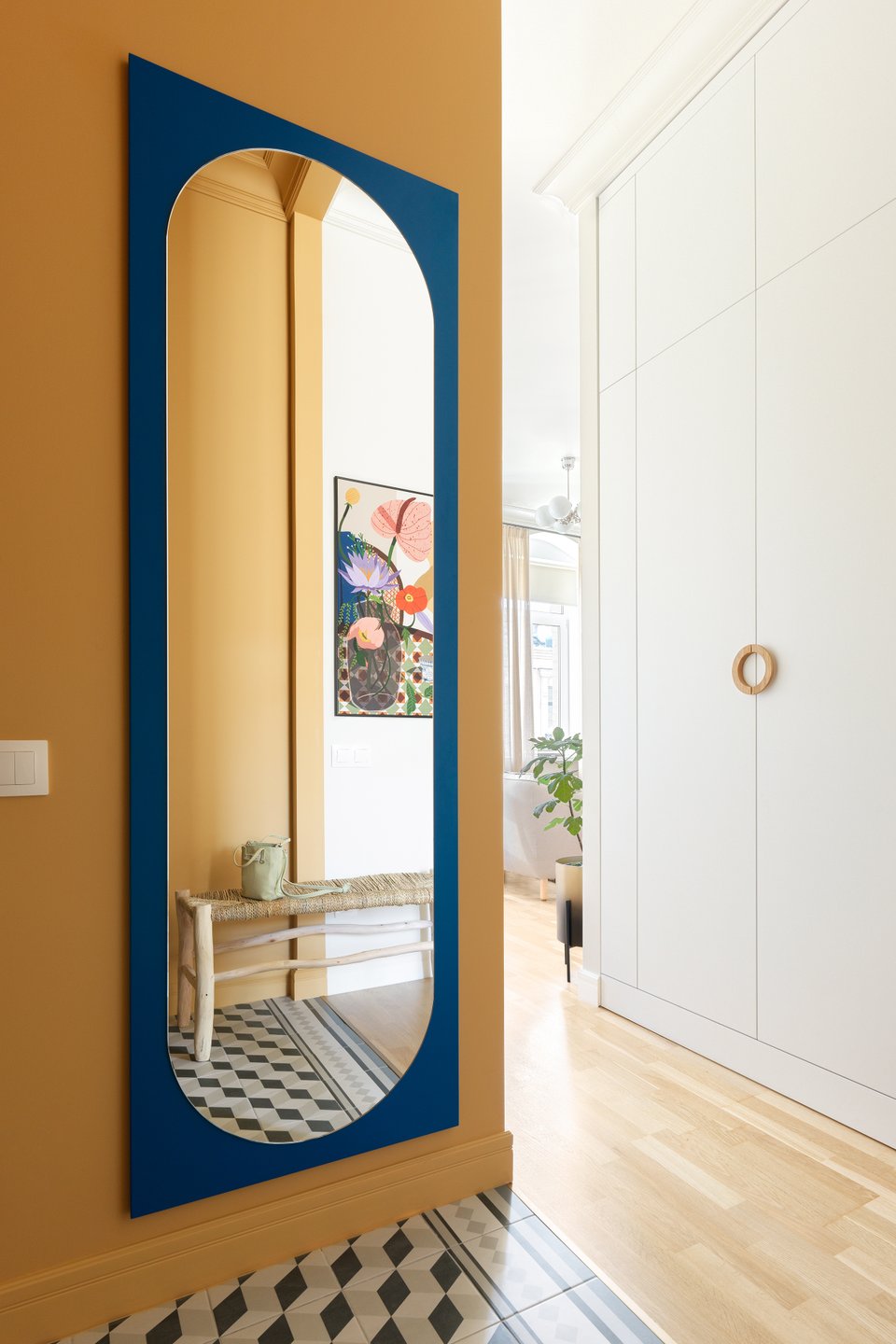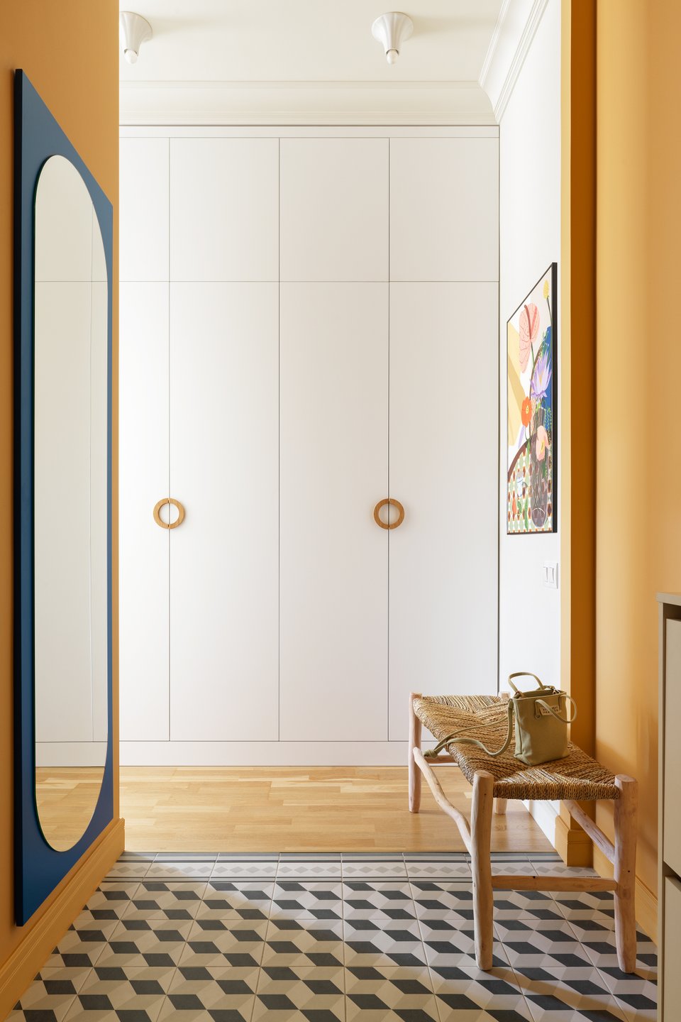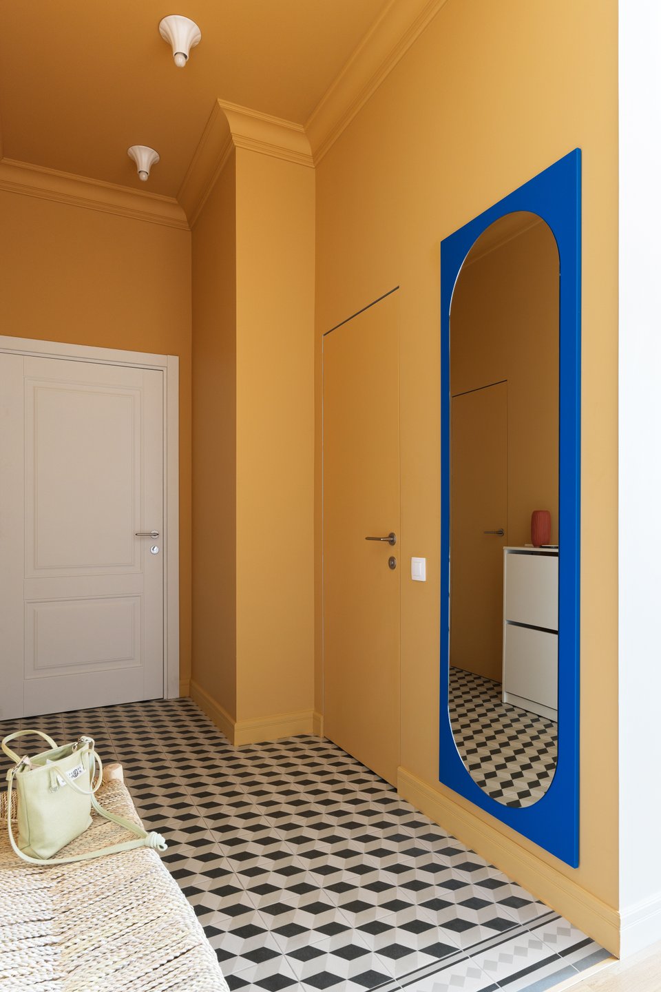 Изначально при входе в квартиру открывался вид на спальную зону. Поперек коридора установили большой шкаф — зона с кроватью стала приватной, появилось много мест для хранения. Входную зону выделили напольной плиткой. Стены выкрасили в насыщенный горчичный оттенок. Большое зеркало в синей раме служит акцентом.