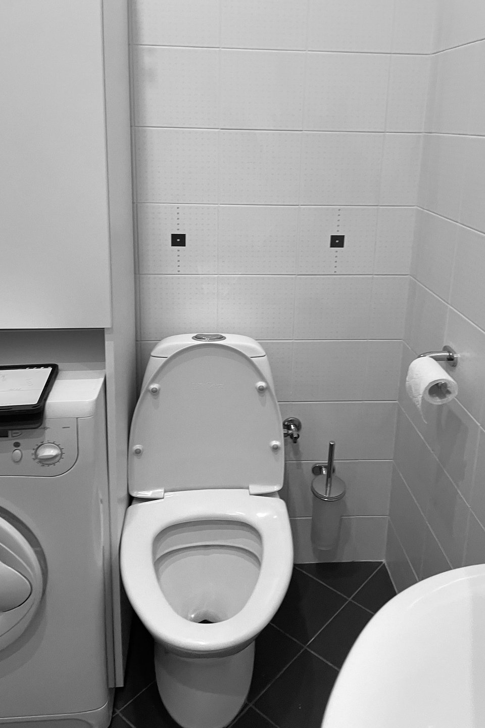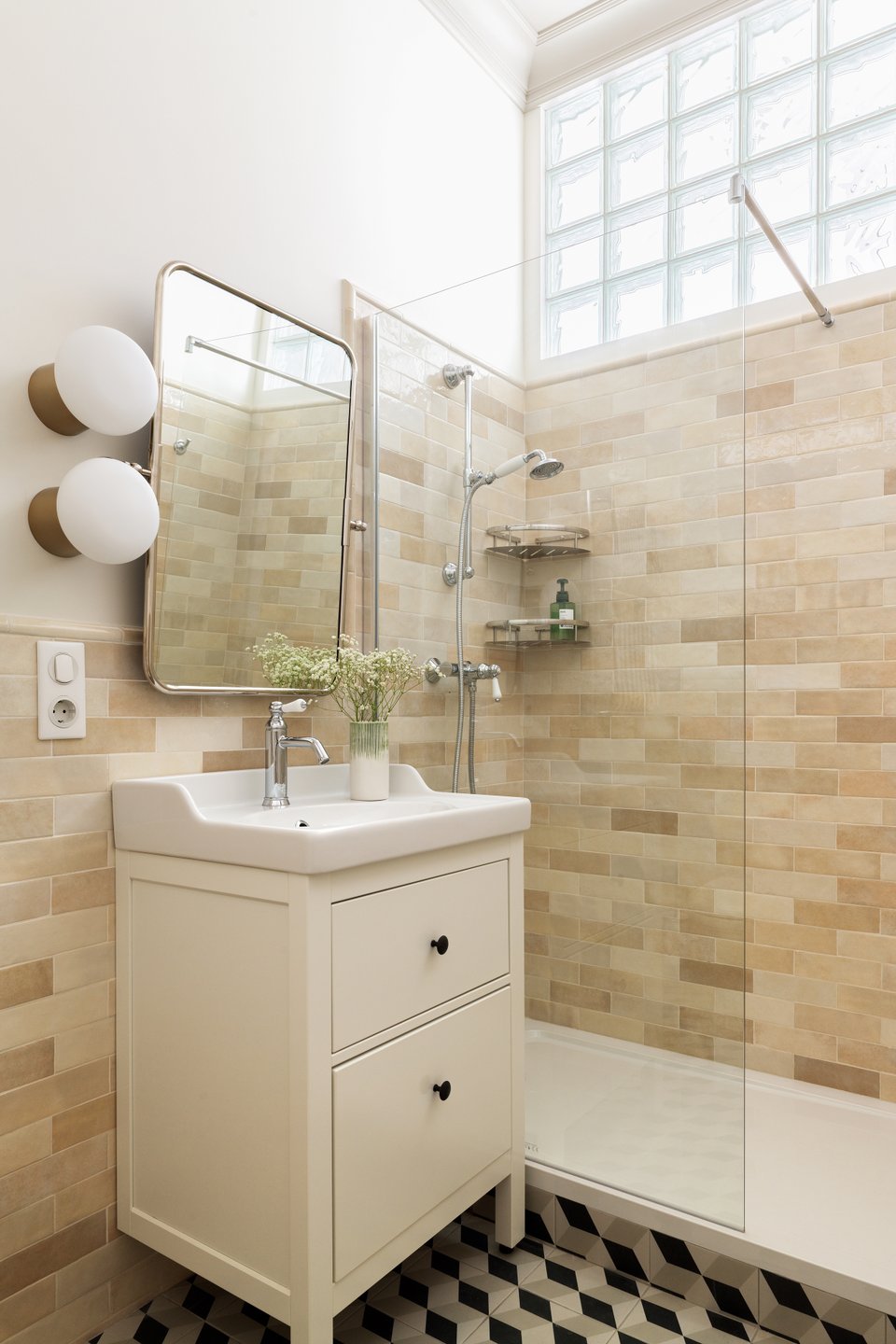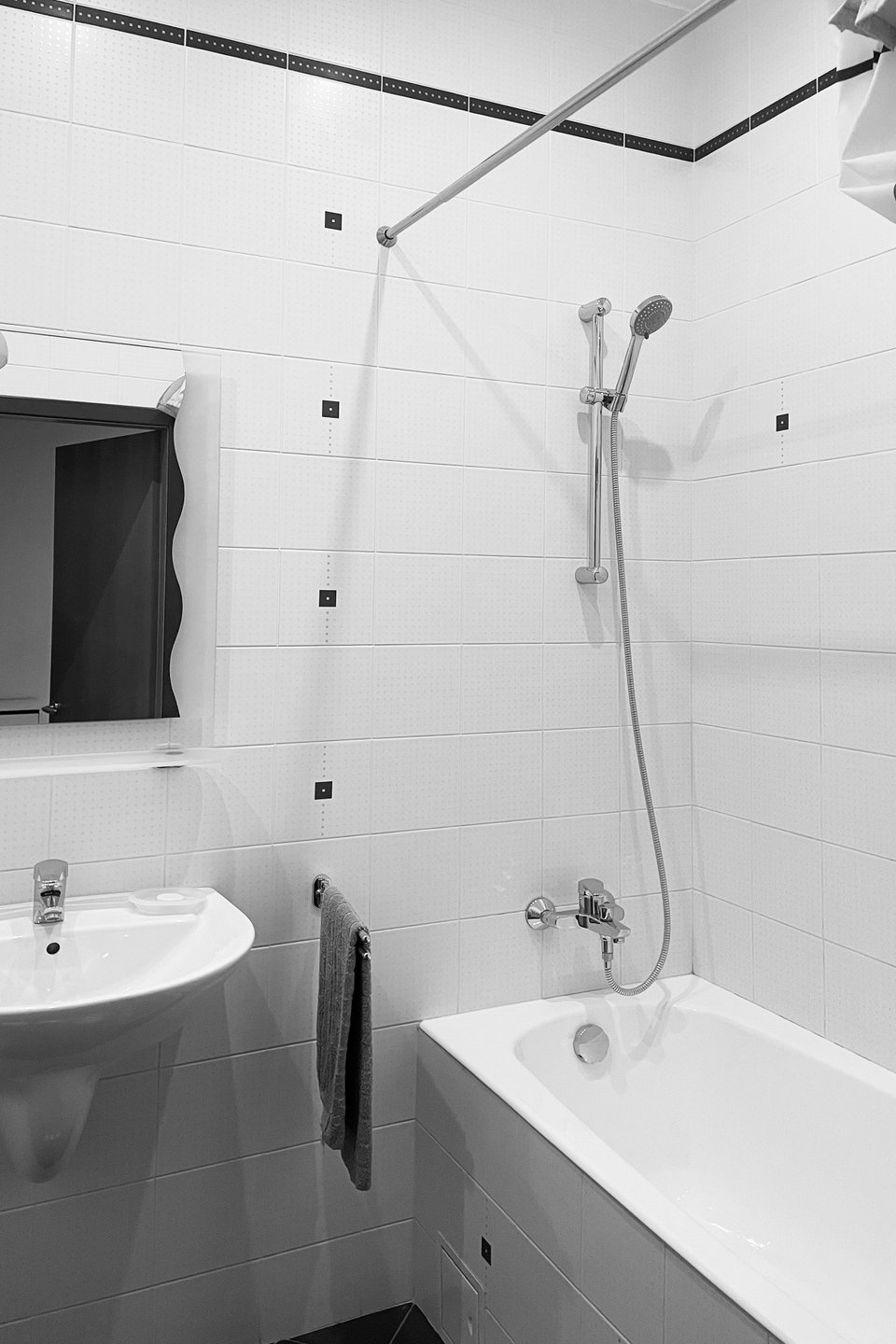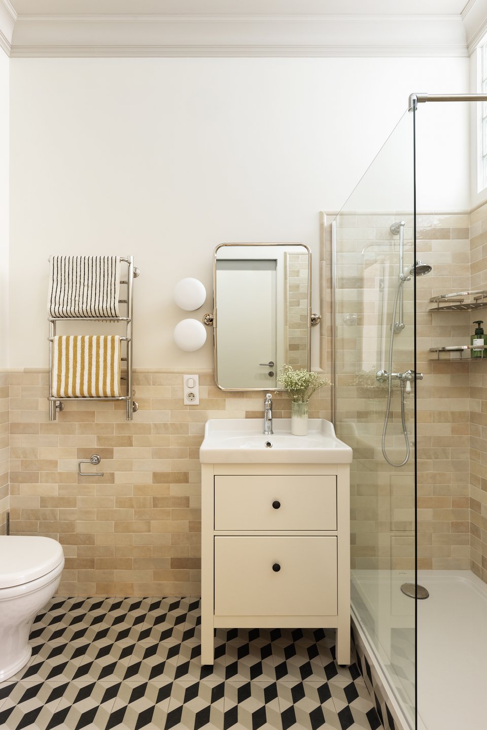 На пол в санузле уложили ту же акцентную плитку с 3D-эффектом, что и в прихожей. Нижнюю часть стен выложили спокойной бежевой плиткой, верхнюю — покрыли водостойкой моющейся краской. От ванны отказались в пользу лаконичной душевой. Установили новую сантехнику, тумбу, повесили зеркало.