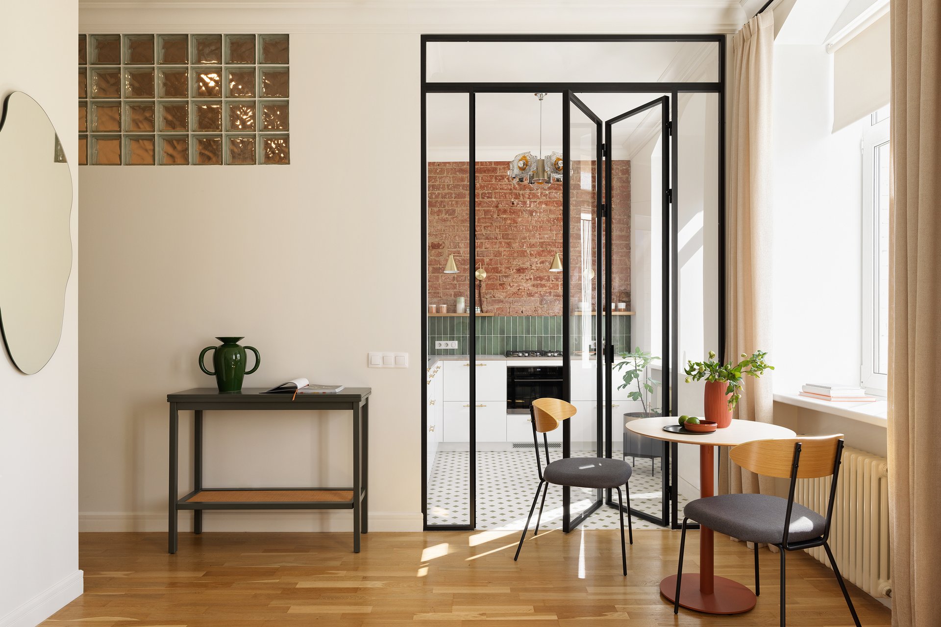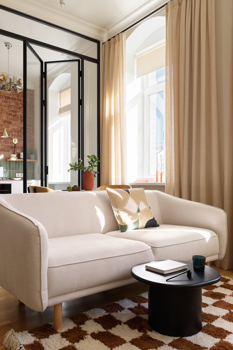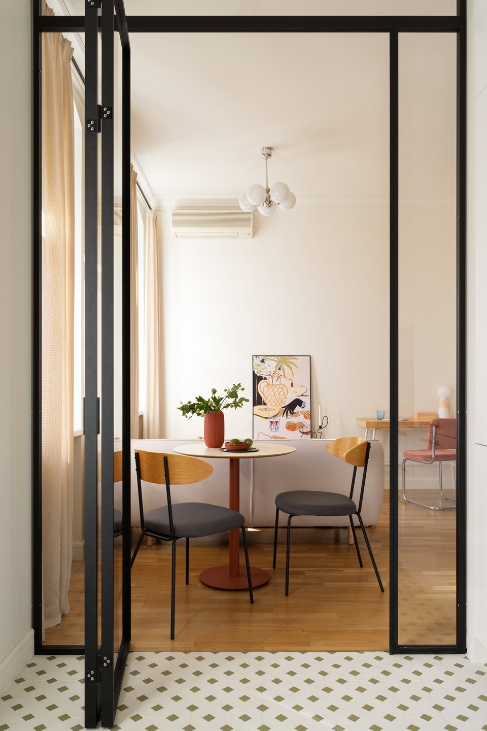 Отправной точкой при создании этого интерьера стали сам дом в стиле позднего модерна и его расположение. Работая над проектом, дизайнер Анастасия Заркуа подчеркнула архитектуру здания и добавила элементы mid-century. Получилось смешение стилей с отсылкой к истории.