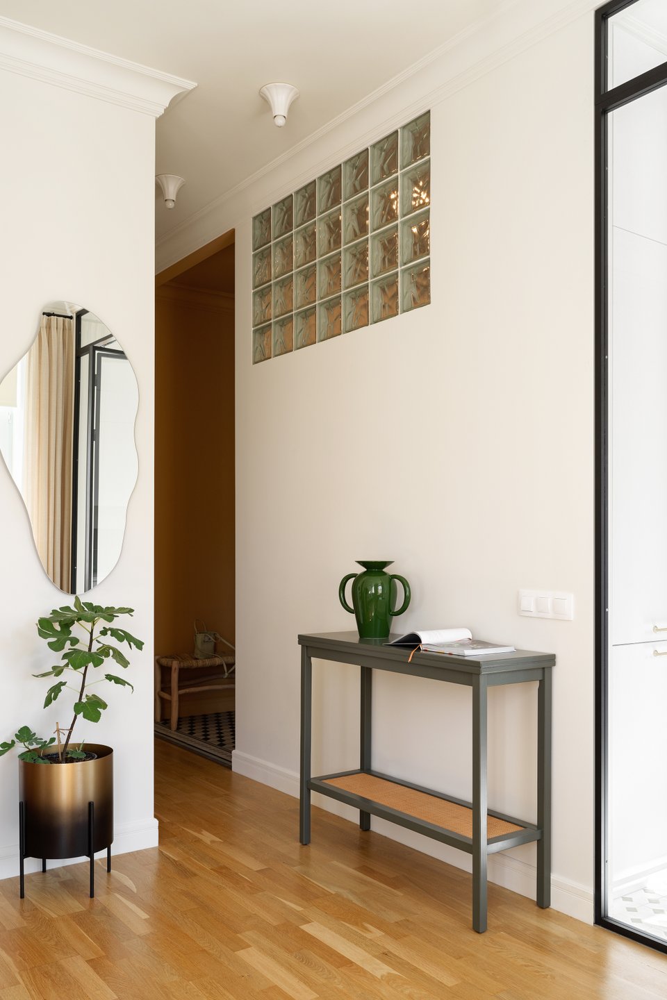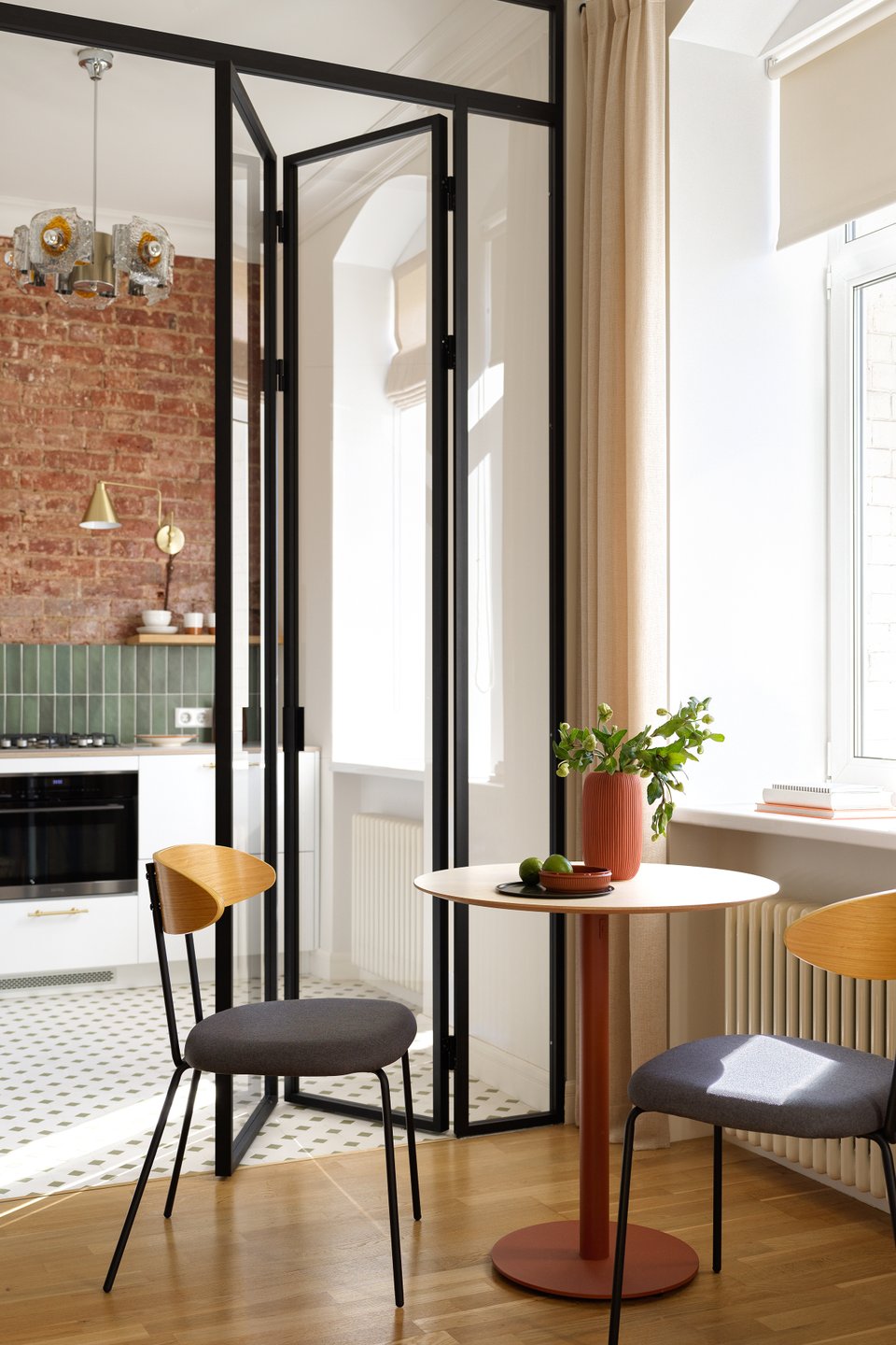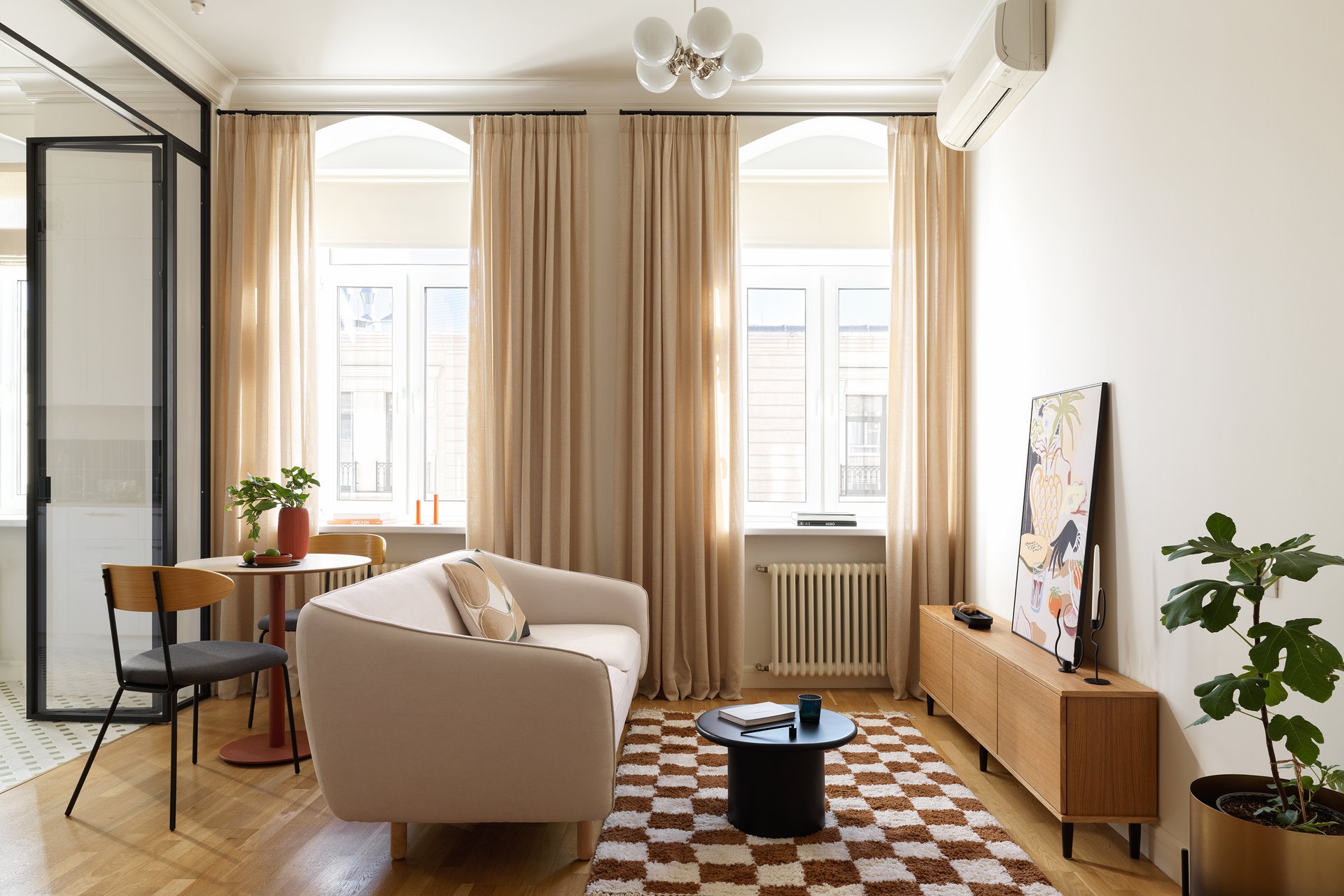 Отправной точкой при создании этого интерьера стали сам дом в стиле позднего модерна и его расположение. Работая над проектом, дизайнер Анастасия Заркуа подчеркнула архитектуру здания и добавила элементы mid-century. Получилось смешение стилей с отсылкой к истории.