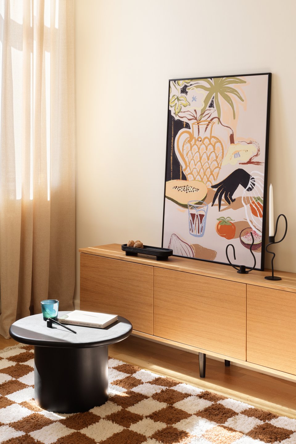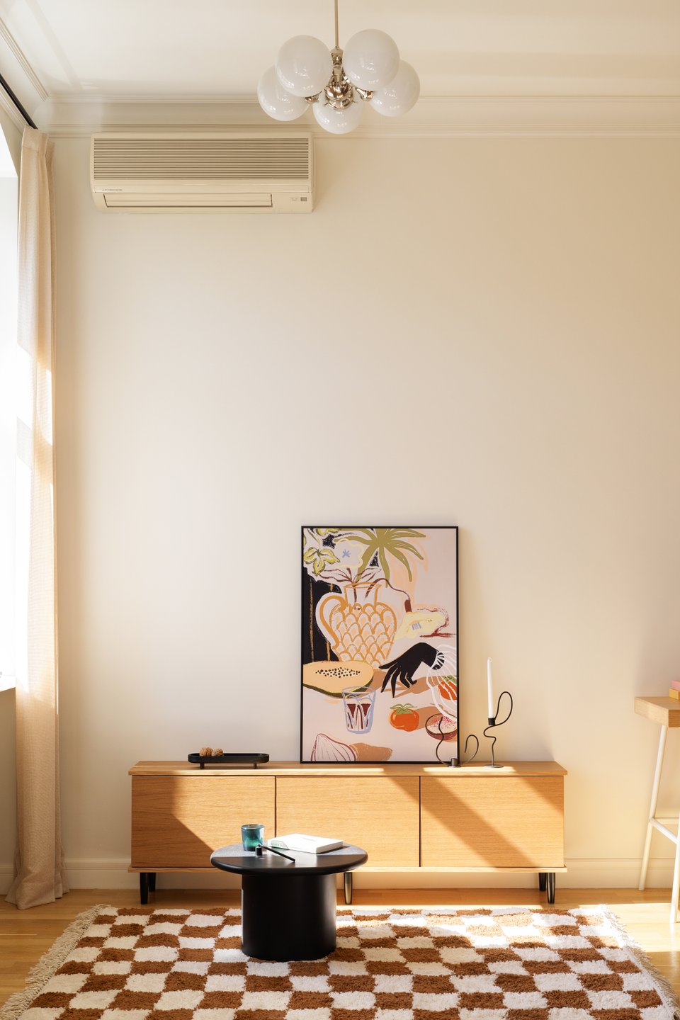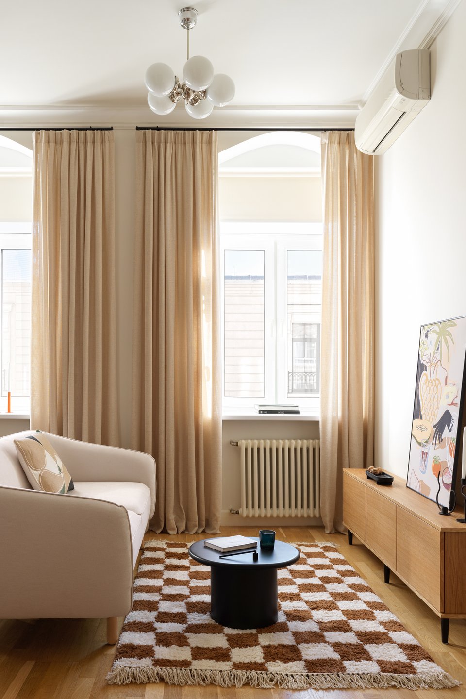 Напротив дивана поставили тумбу с фасадами цвета светлого дерева. При желании на нее можно будет установить телевизор. Рядом обустроили рабочее место. Зону отдыха «объединили» ковром с шахматным рисунком. Окна закрыли полупрозрачными шторами. Для защиты от солнца добавили рулонные шторы с эффектом блэкаут.