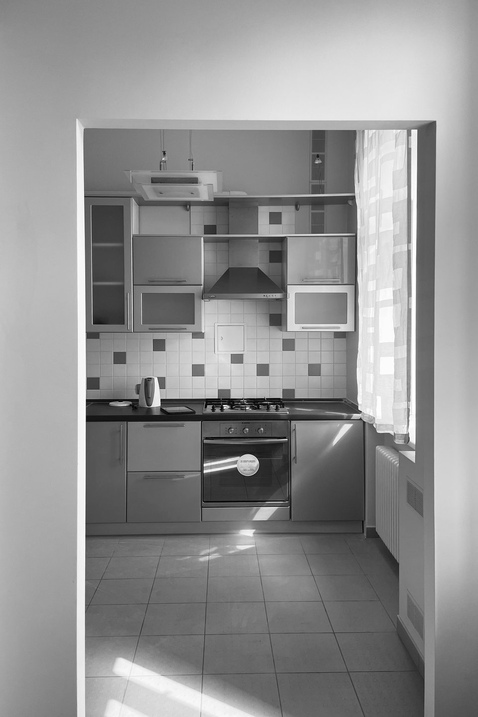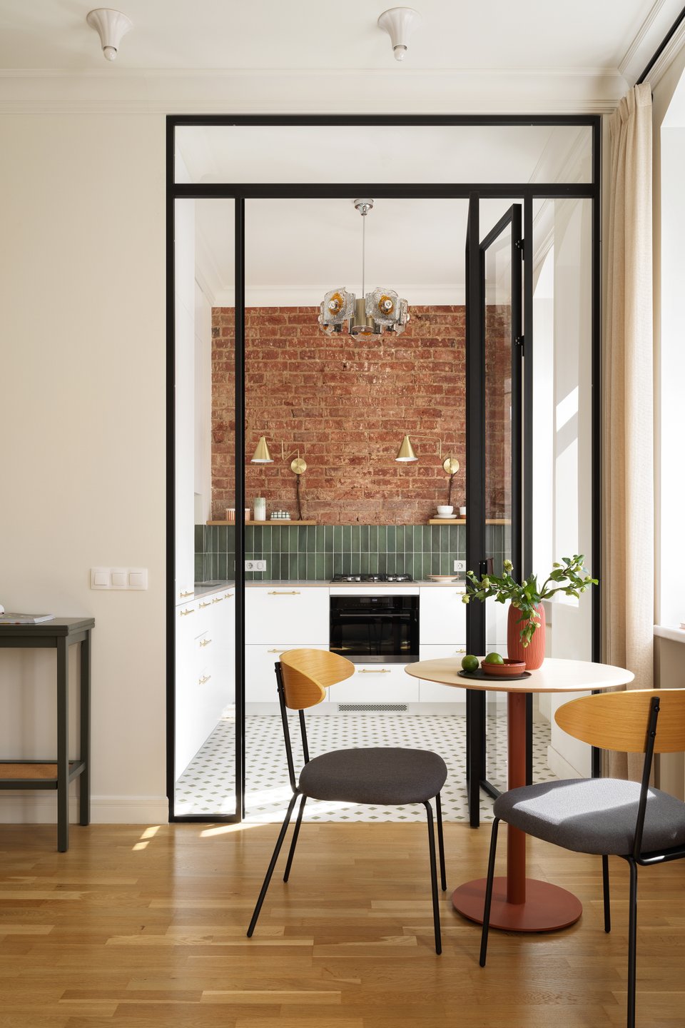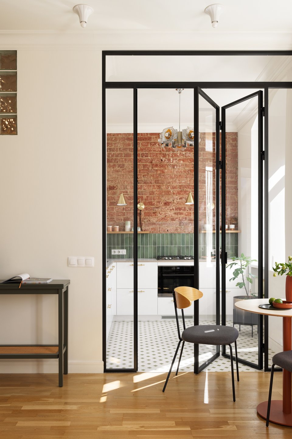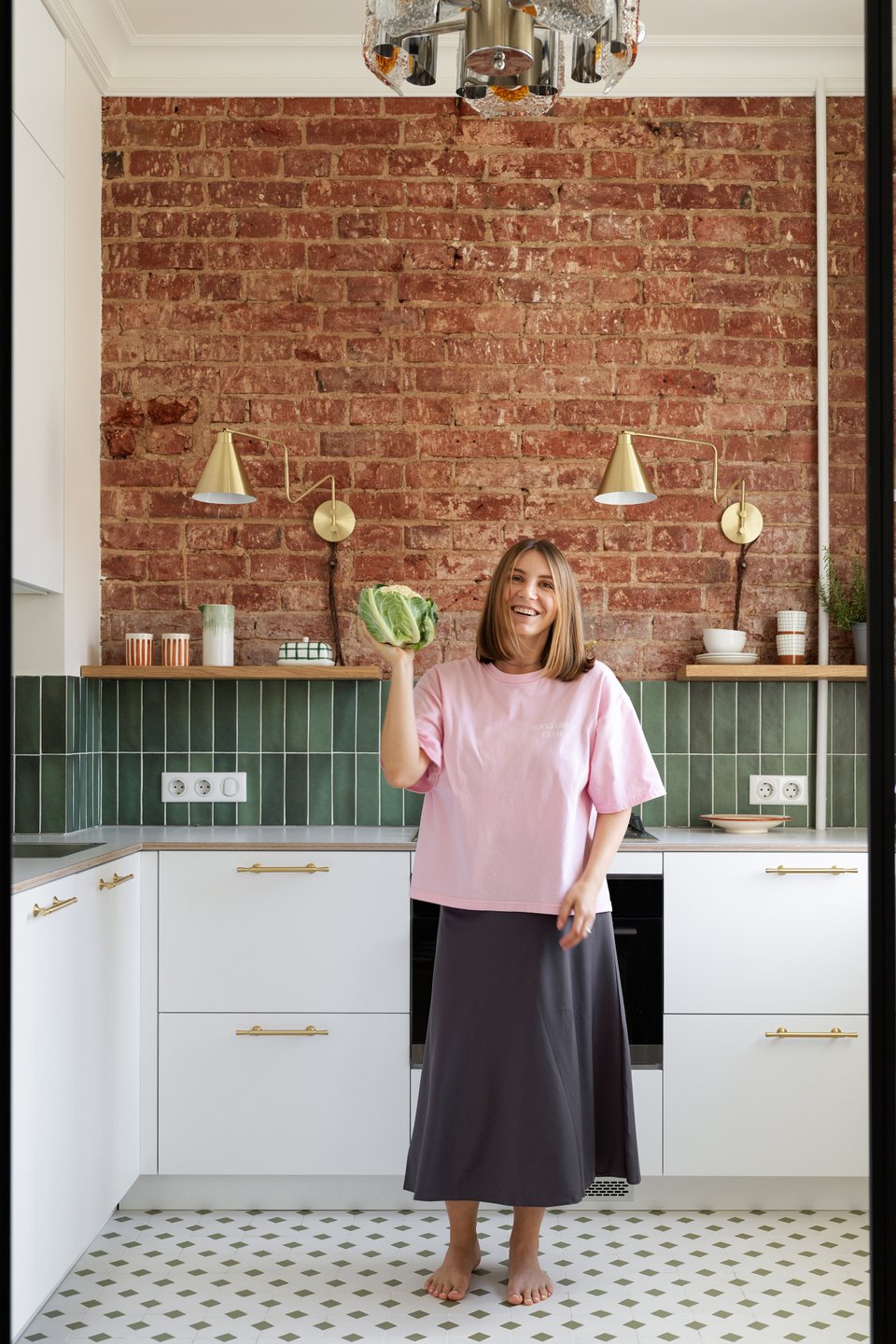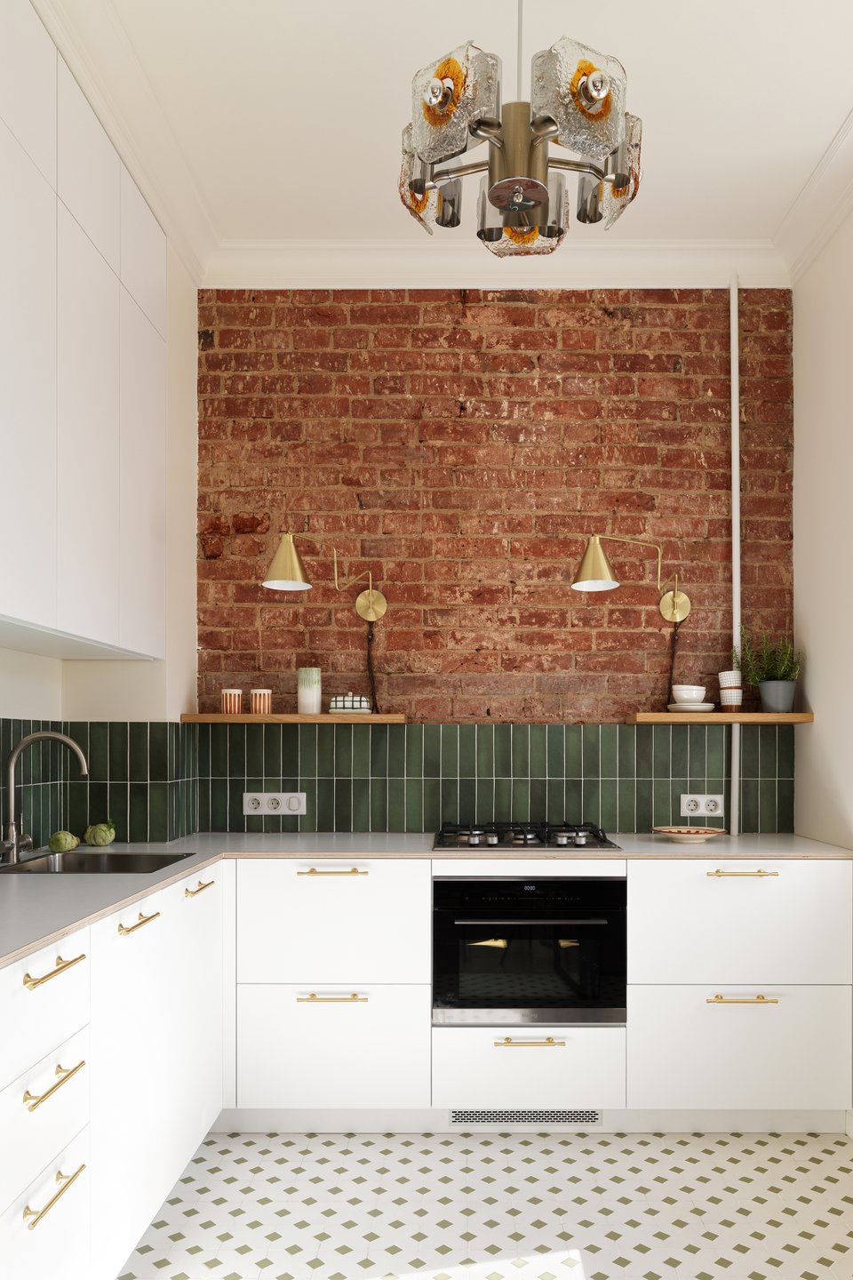 При осмотре кухни за плиткой обнаружили «родной» кирпич, и было принято решение его открыть и восстановить. Отделку стен и пола демонтировали и заменили на актуальную.