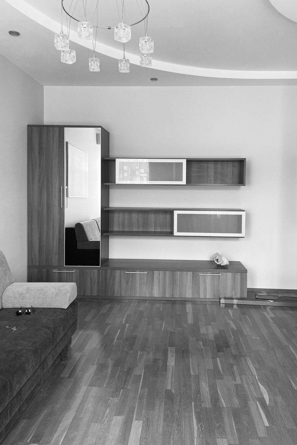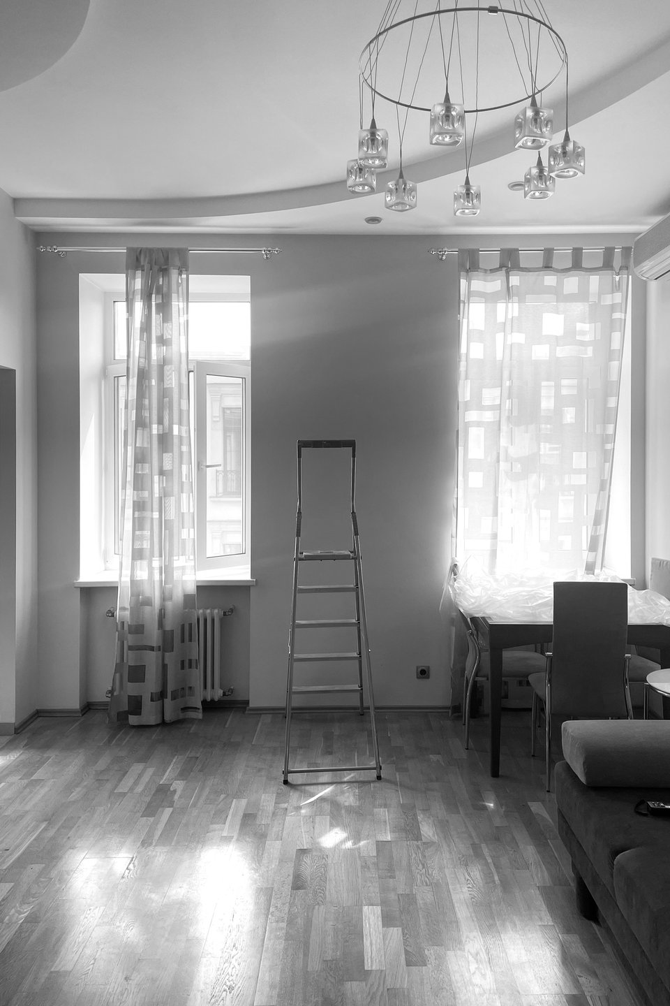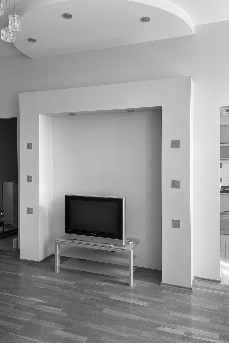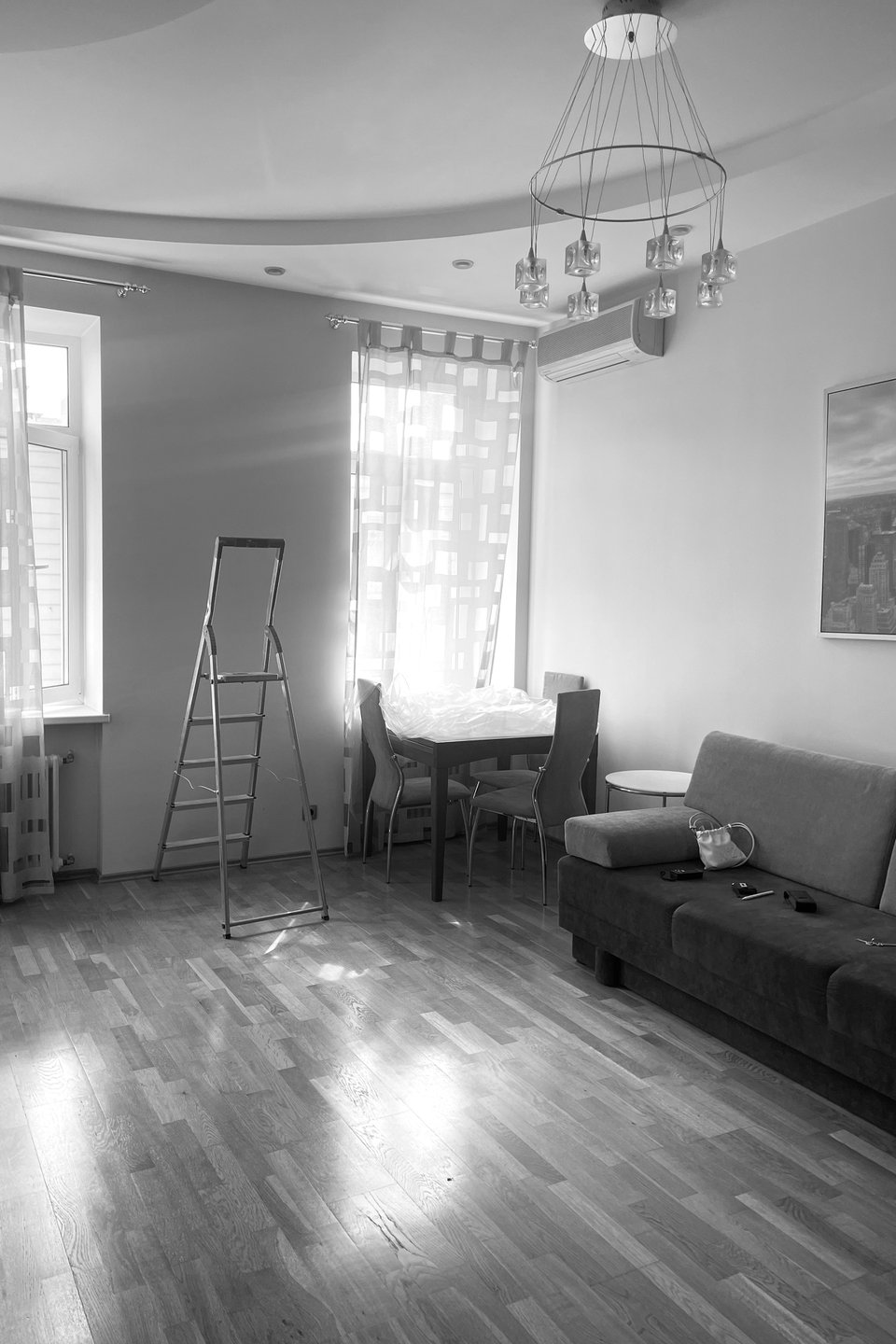 До ремонта квартира уже сдавалась в аренду, но обстановка была устаревшей — типичный ремонт начала 2000-х, с трендовыми на то время цветами. Полный демонтаж делать не стали: отреставрировали дубовый паркет, сняли старое покрытие со стен, электропроводку заменили только в необходимых местах, смонтировали потолок из гипсокартона и покрасили.