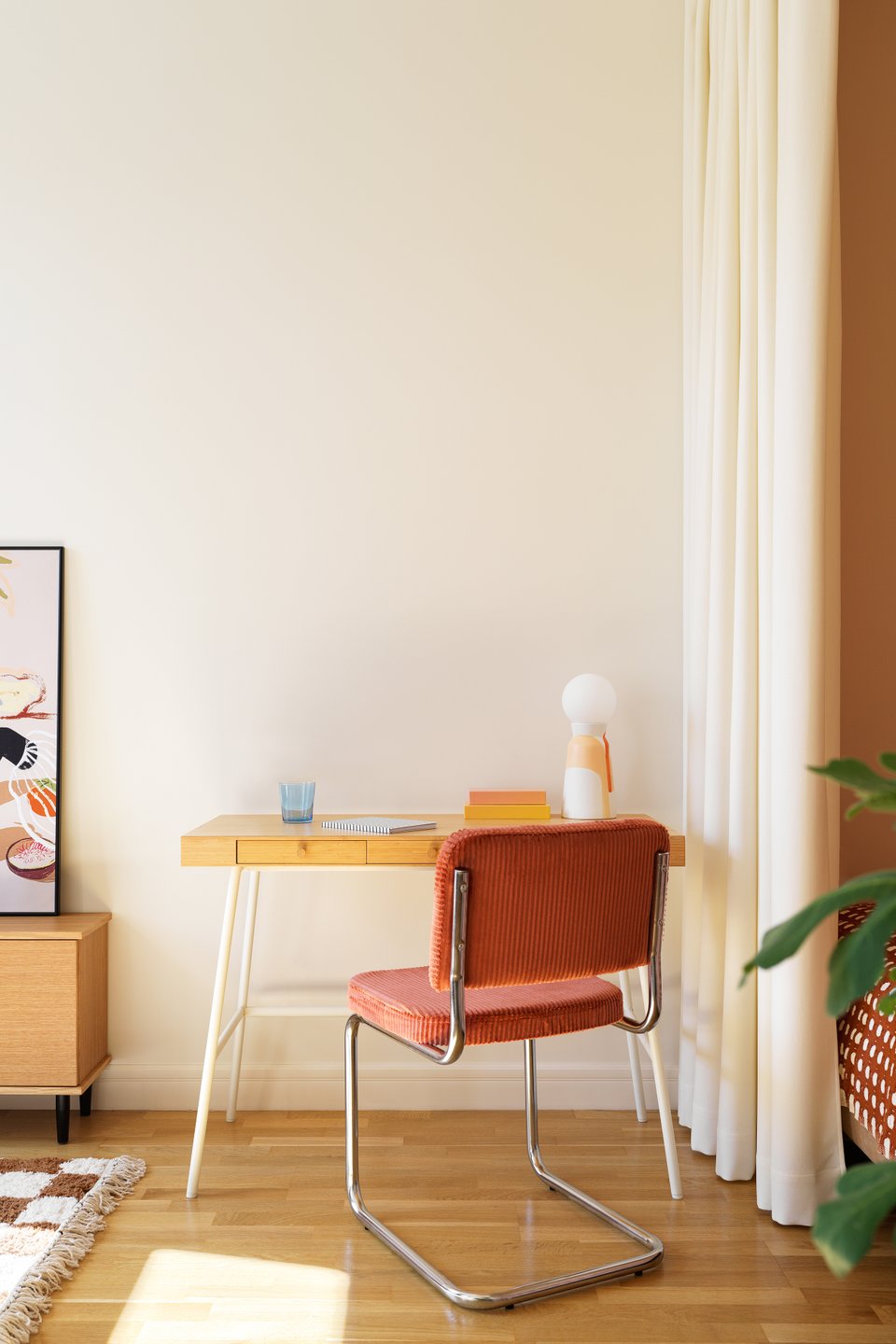 Спальную зону от остального пространства отделяет шкаф со стороны прихожей и штора со стороны гостиной. Стену за изголовьем выкрасили в технике градиент — снизу оттенок более плотный, к потолку становится светлее. Яркий акцент здесь — круглая прикроватная тумба насыщенного синего цвета.