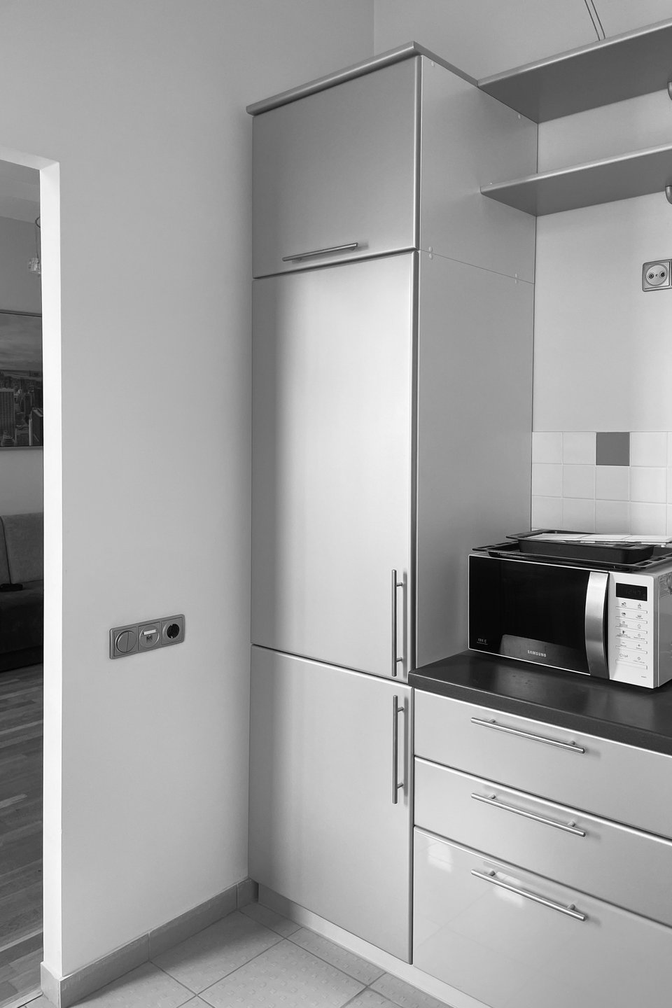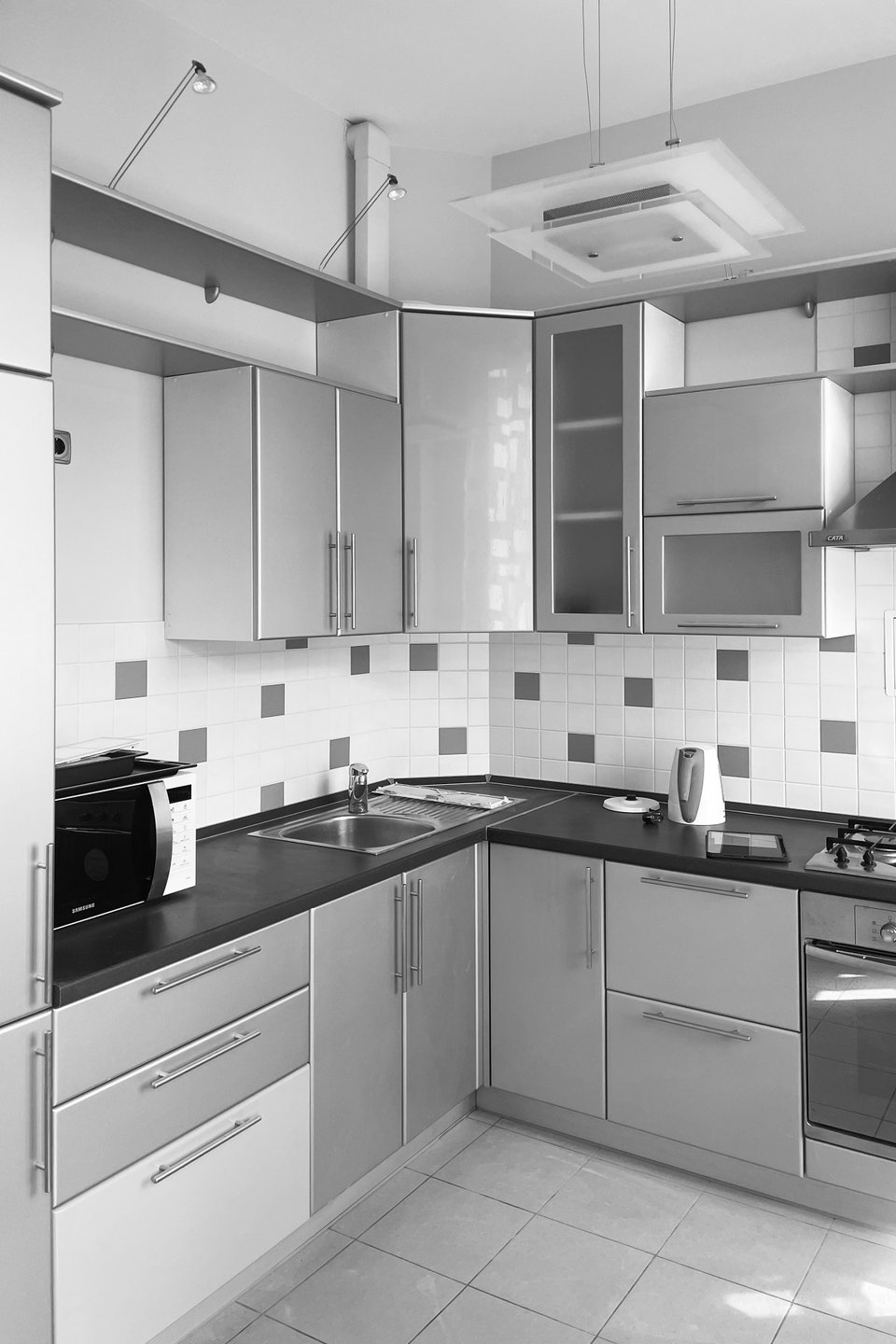 Благодаря угловой планировке гарнитура на небольшой площади получилось разместить все необходимое: достаточное количество мест для хранения и бытовую технику, в том числе встроенный холодильник. Гладкие фасады в цвет стен и потолка «растворяют» габаритную мебель в пространстве. Верхние шкафы расположили только по одной стене, кирпичная кладка служит акцентом, ее закрывать не стали.