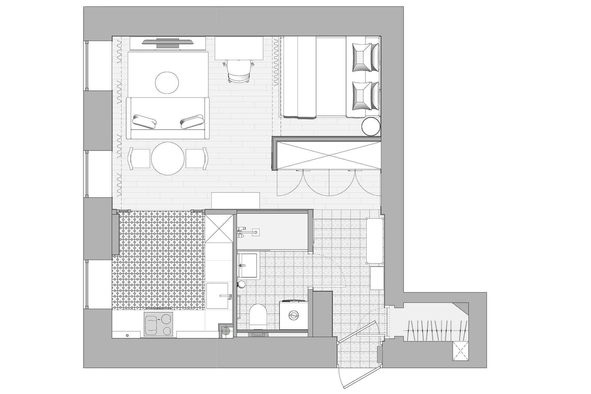 В квартире открытая планировка, разделенная на функциональные зоны. Перепланировку не делали, отделили только кухню легкой прозрачной перегородкой и выстроили нишу для шкафа между прихожей и спальной зоной.
