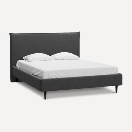 В центре внимания в спальне — кровать с мягким изголовьем серого цвета от Диван.ру. Обивка гармонично сочетается с акцентной графитовой стеной, на фоне которой практически теряются темные прикроватные тумбы.
