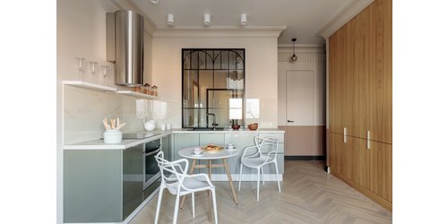 Светло-зеленый оттенок хорошо сочетается с природными цветами, например, травянистым и графитовым. Интересные сочетания дают разные текстуры: гладкая поверхность обеденного стола Алмонт, плотная обивка дивана Виенсо, шероховатая акцентная стена и мягкость ковра Lotus на полу.