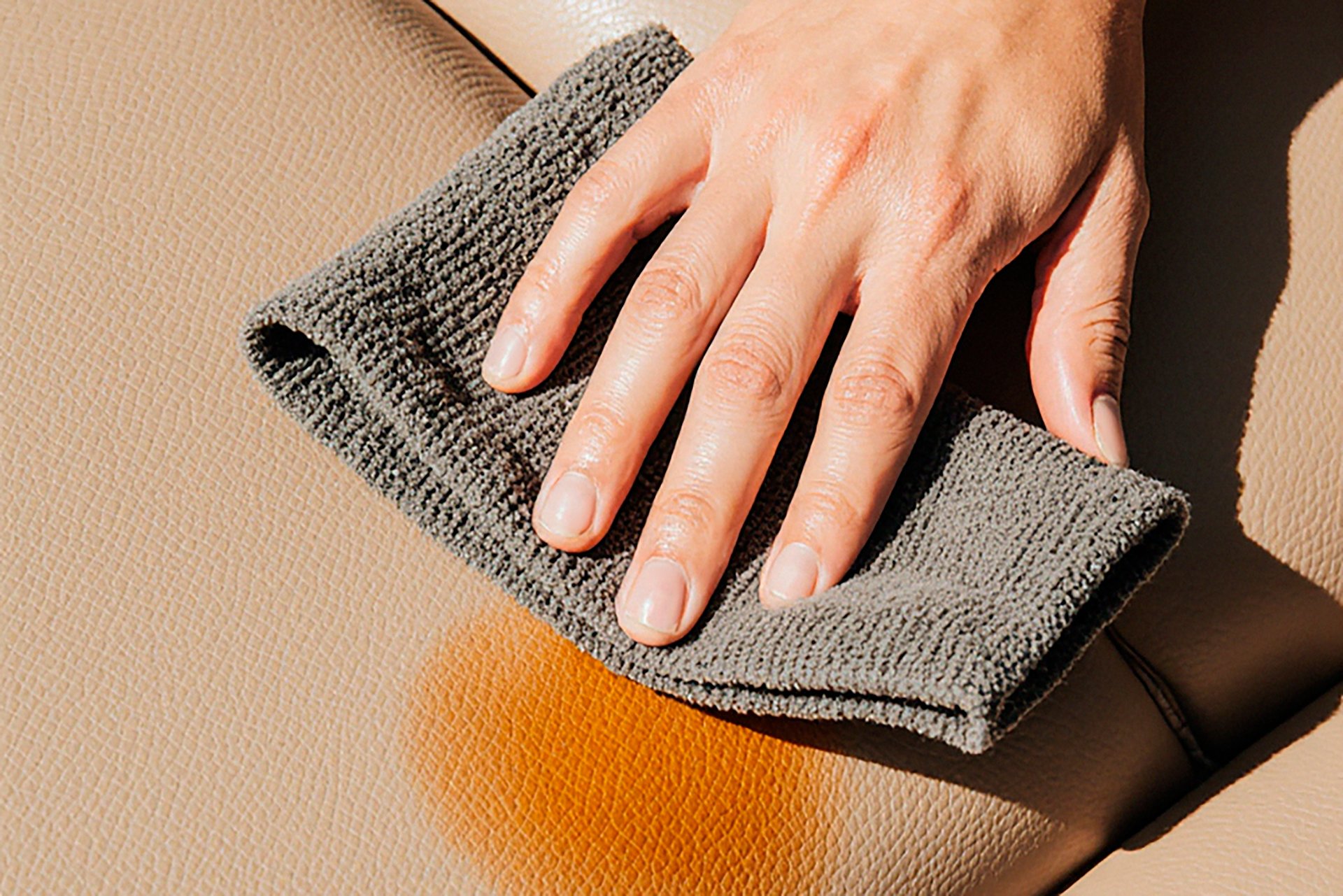 Промокните пятно как можно быстрее — не дайте жидкости впитаться. Затем аккуратно протрите слегка влажной тканью. Не заливайте пятно водой — это только усугубит ситуацию. Если след остался, используйте специальное средство для удаления пищевых пятен с кожаной мебели.