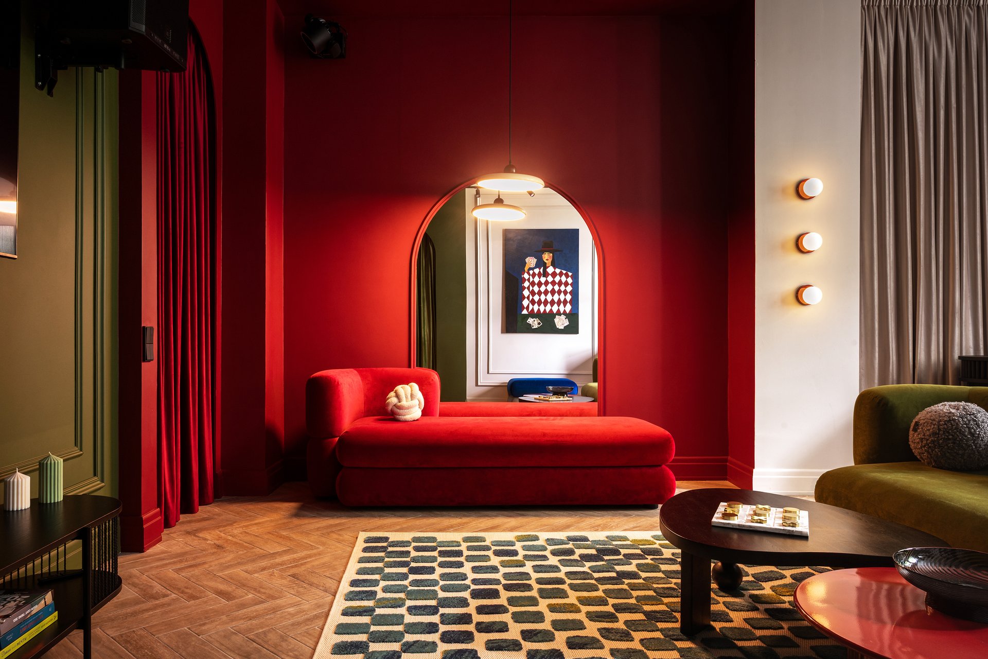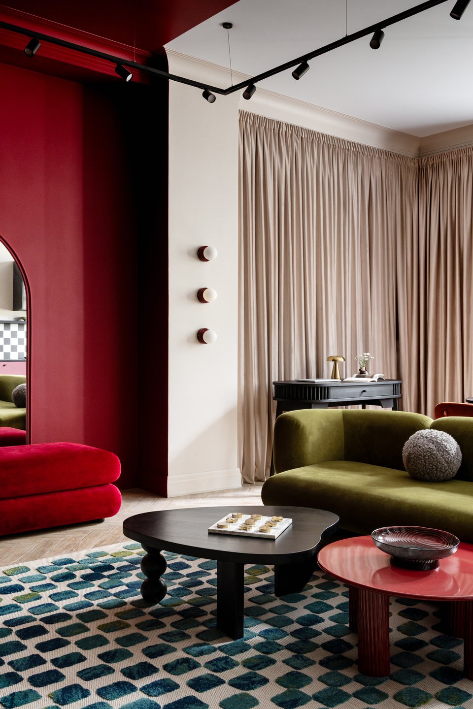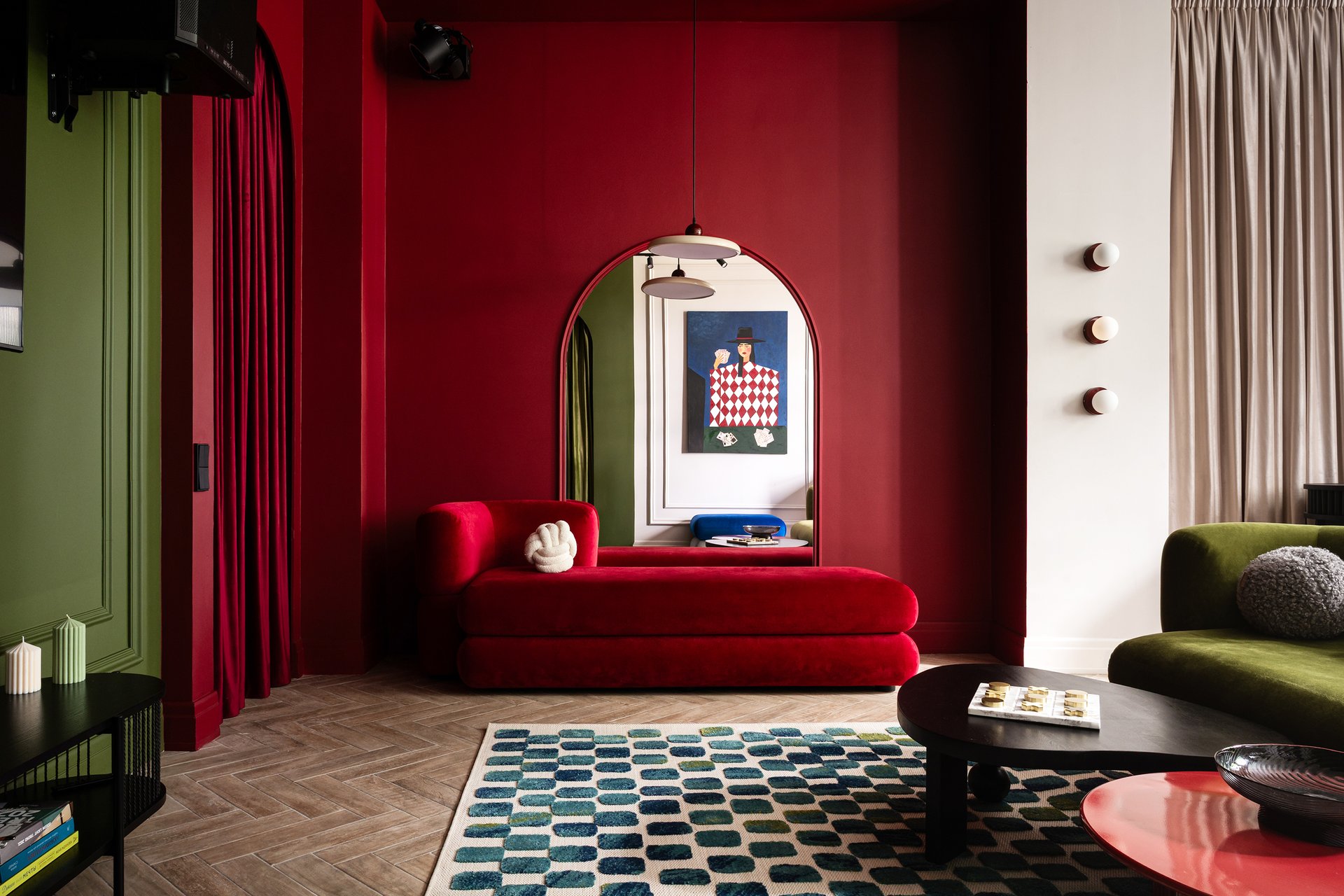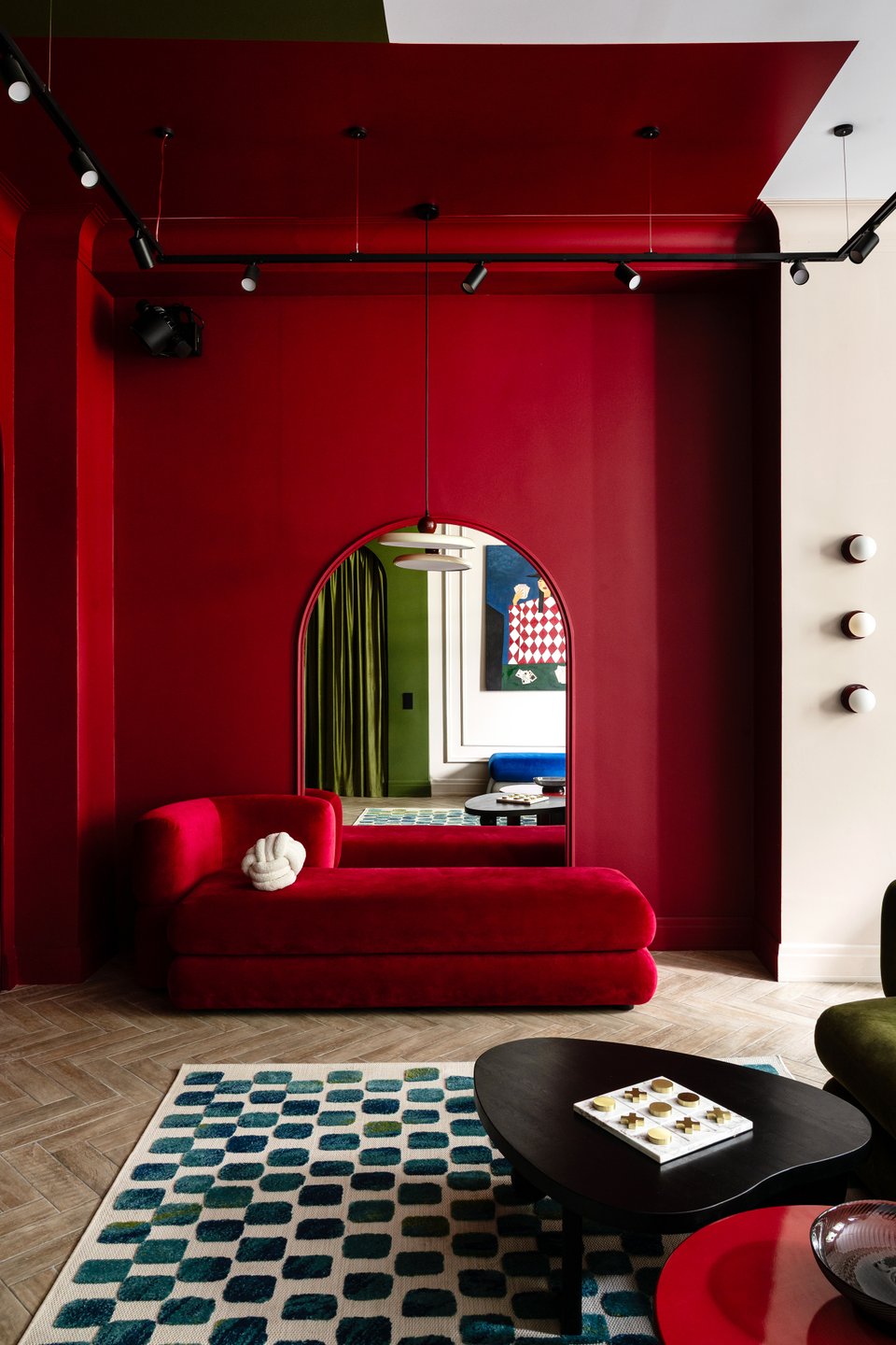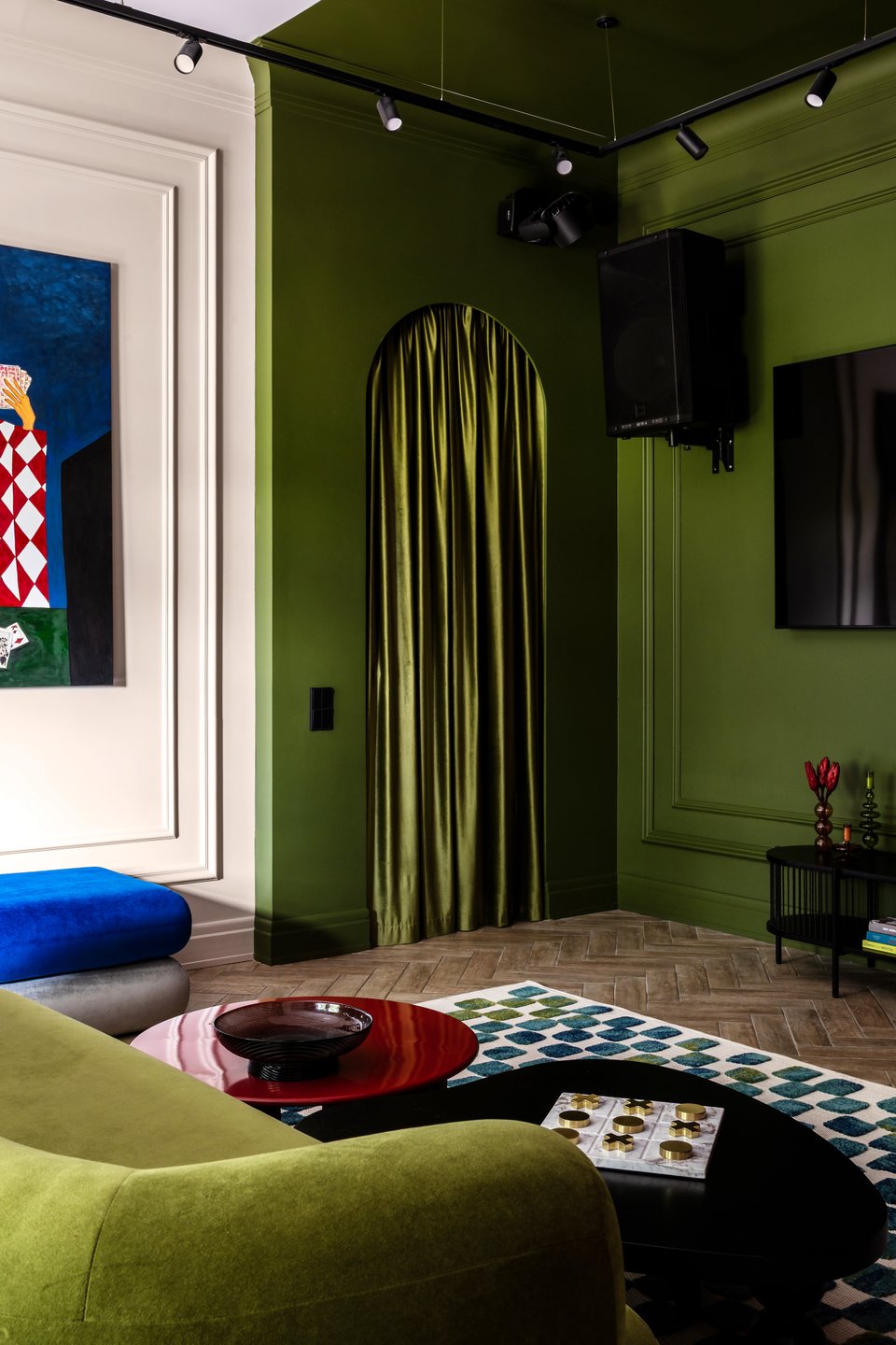 Второй диван Brera, но уже в обивке лаймового оттенка, образует зону отдыха в центре комнаты. Обстановку дополнили журнальными столами Мейфер и Могенс, пуфом Brera, все от divan.ru. Синий цвет, присутствующий на картине, ковре, в обивке пуфа, приглушает и охлаждает насыщенные оттенки красного и лаймового. Прием балансирует цветовую палитру, позволяет гостям переключаться между ощущениями и в то же время сохраняет общую атмосферу. Декоративные светильники с теплым светом добавляют уюта и создают «домашнее» настроение.