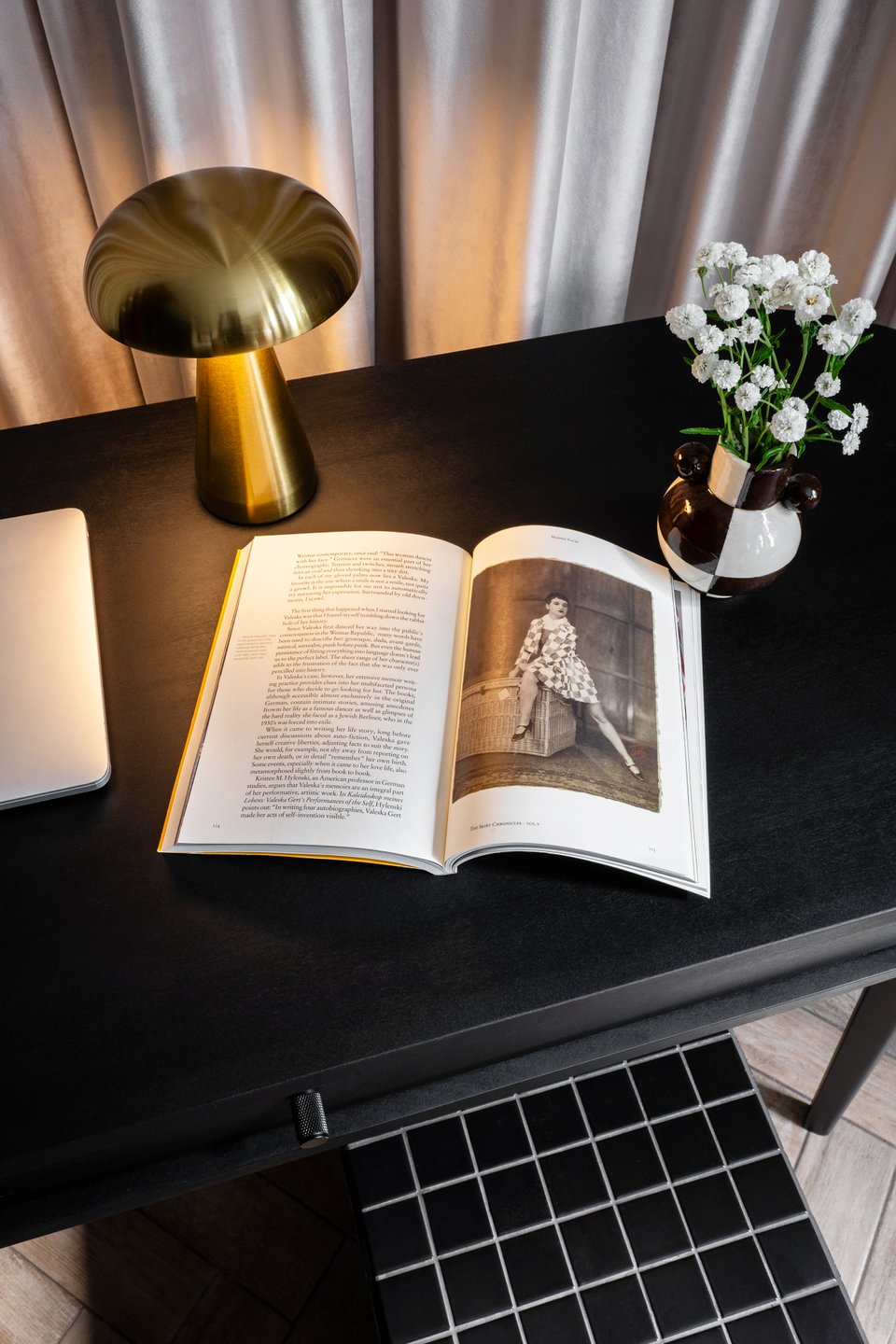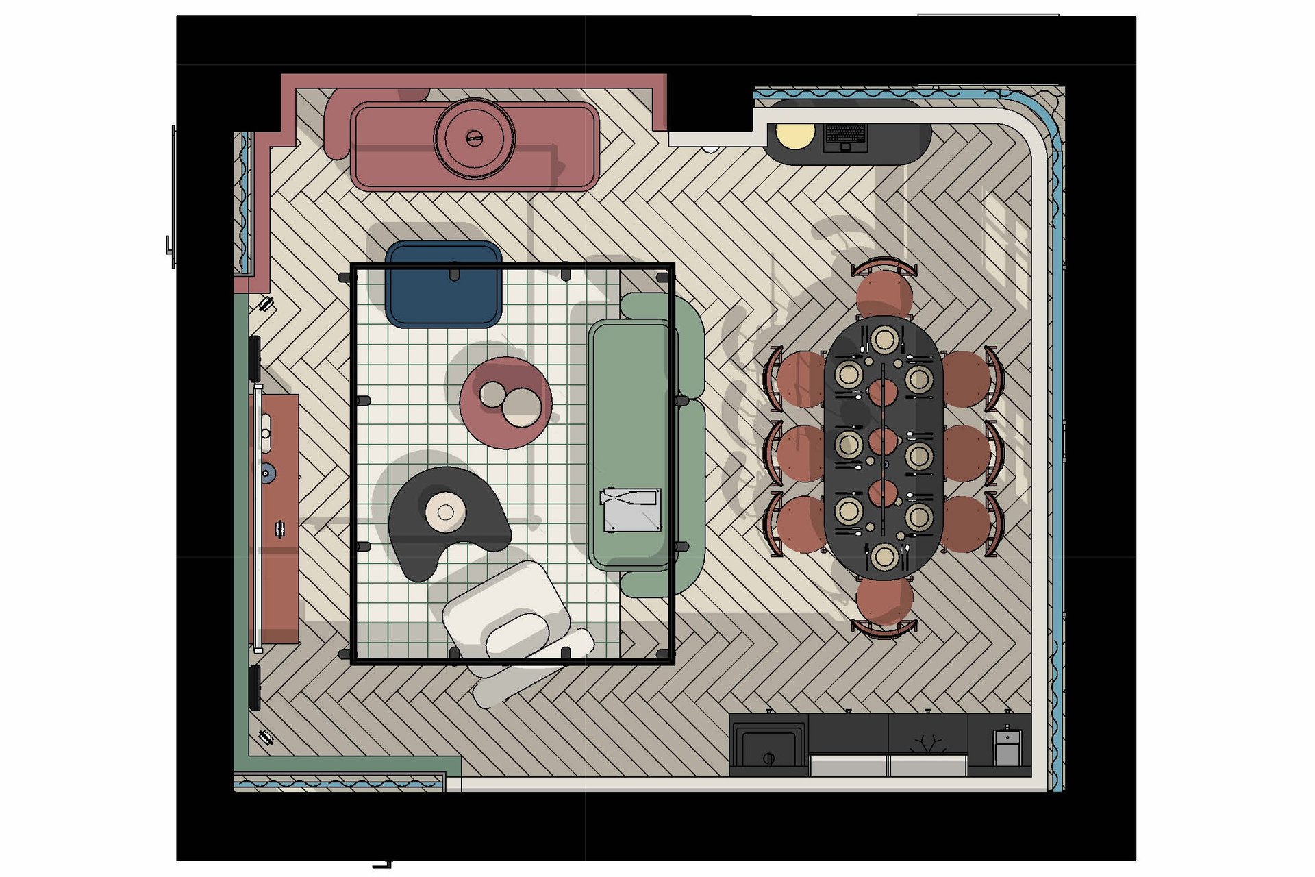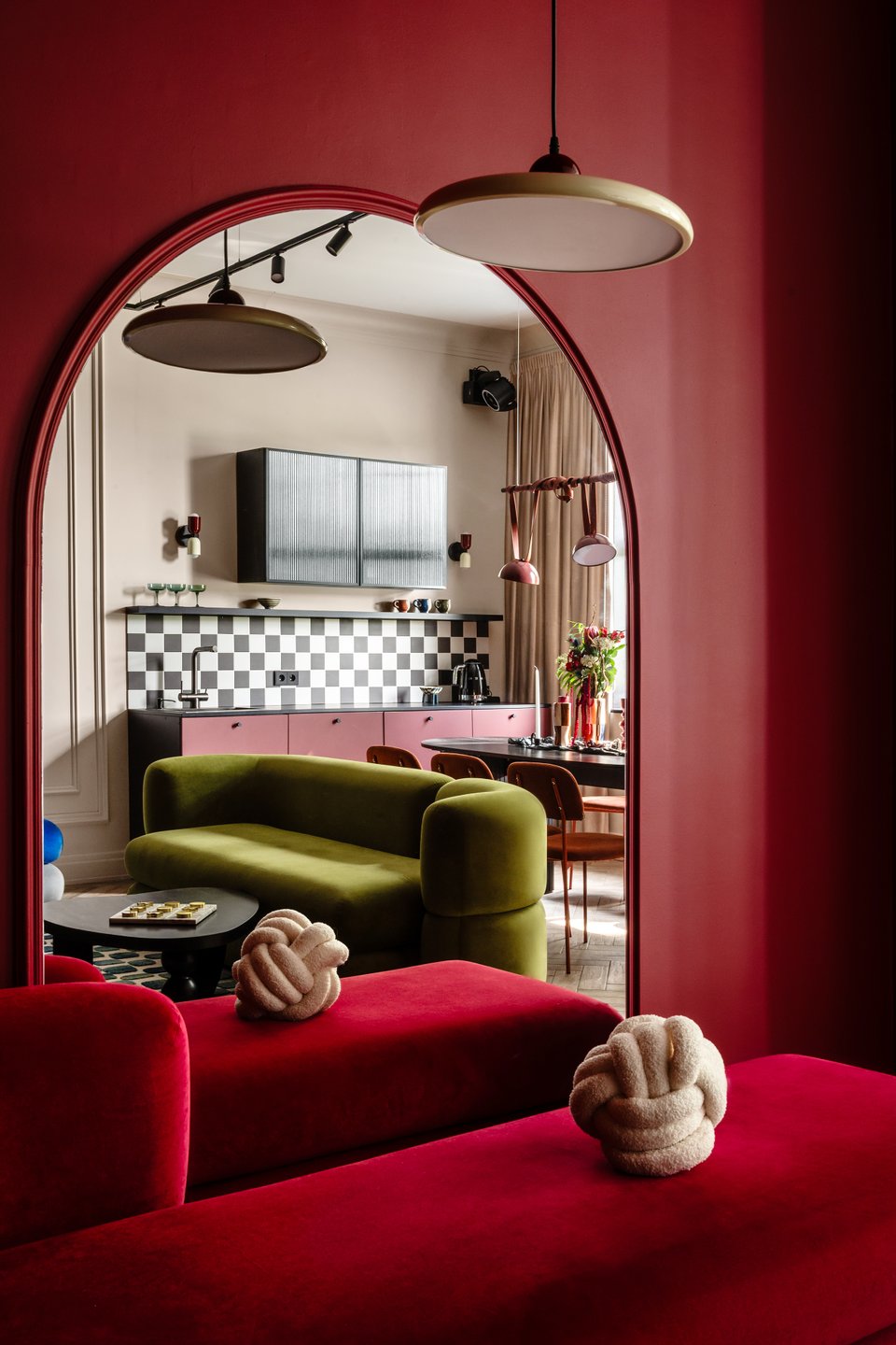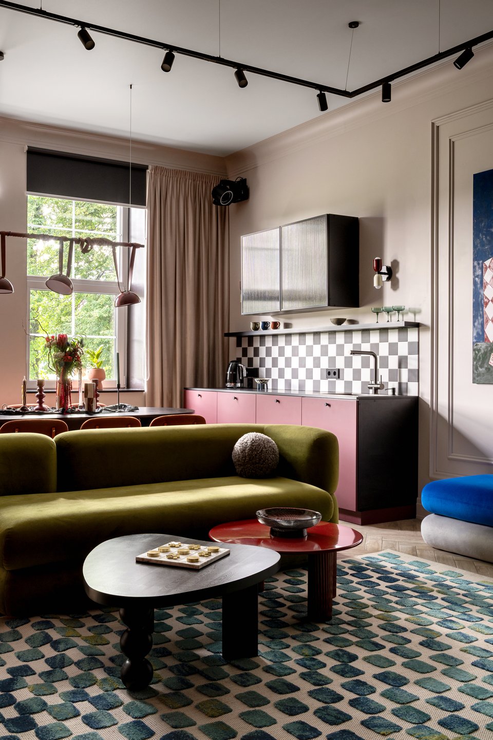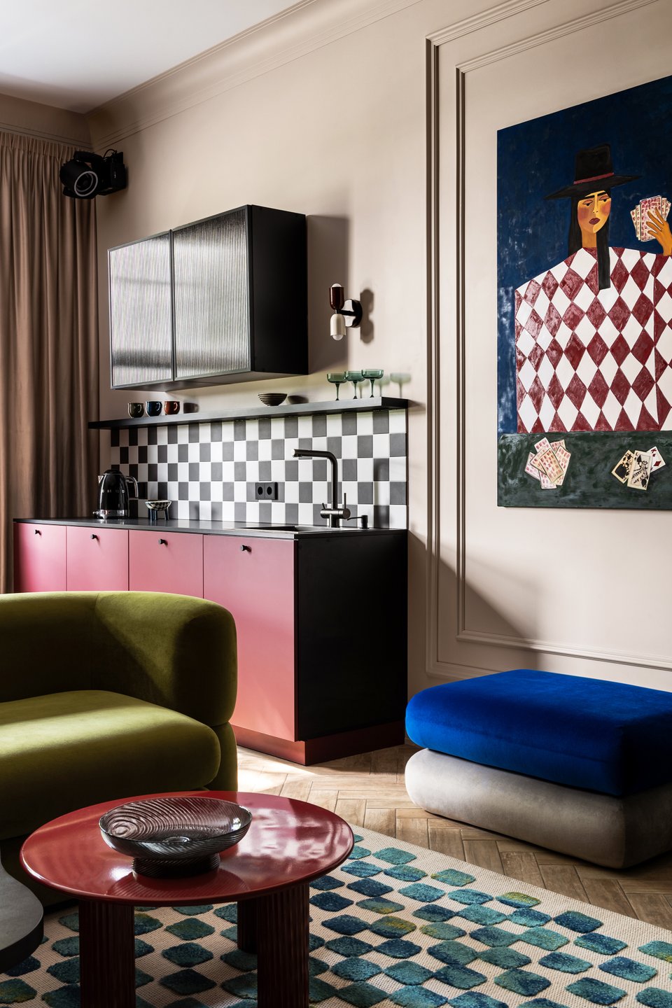 Второй диван Brera, но уже в обивке лаймового оттенка, образует зону отдыха в центре комнаты. Обстановку дополнили журнальными столами Мейфер и Могенс, пуфом Brera, все от divan.ru. Синий цвет, присутствующий на картине, ковре, в обивке пуфа, приглушает и охлаждает насыщенные оттенки красного и лаймового. Прием балансирует цветовую палитру, позволяет гостям переключаться между ощущениями и в то же время сохраняет общую атмосферу. Декоративные светильники с теплым светом добавляют уюта и создают «домашнее» настроение.
